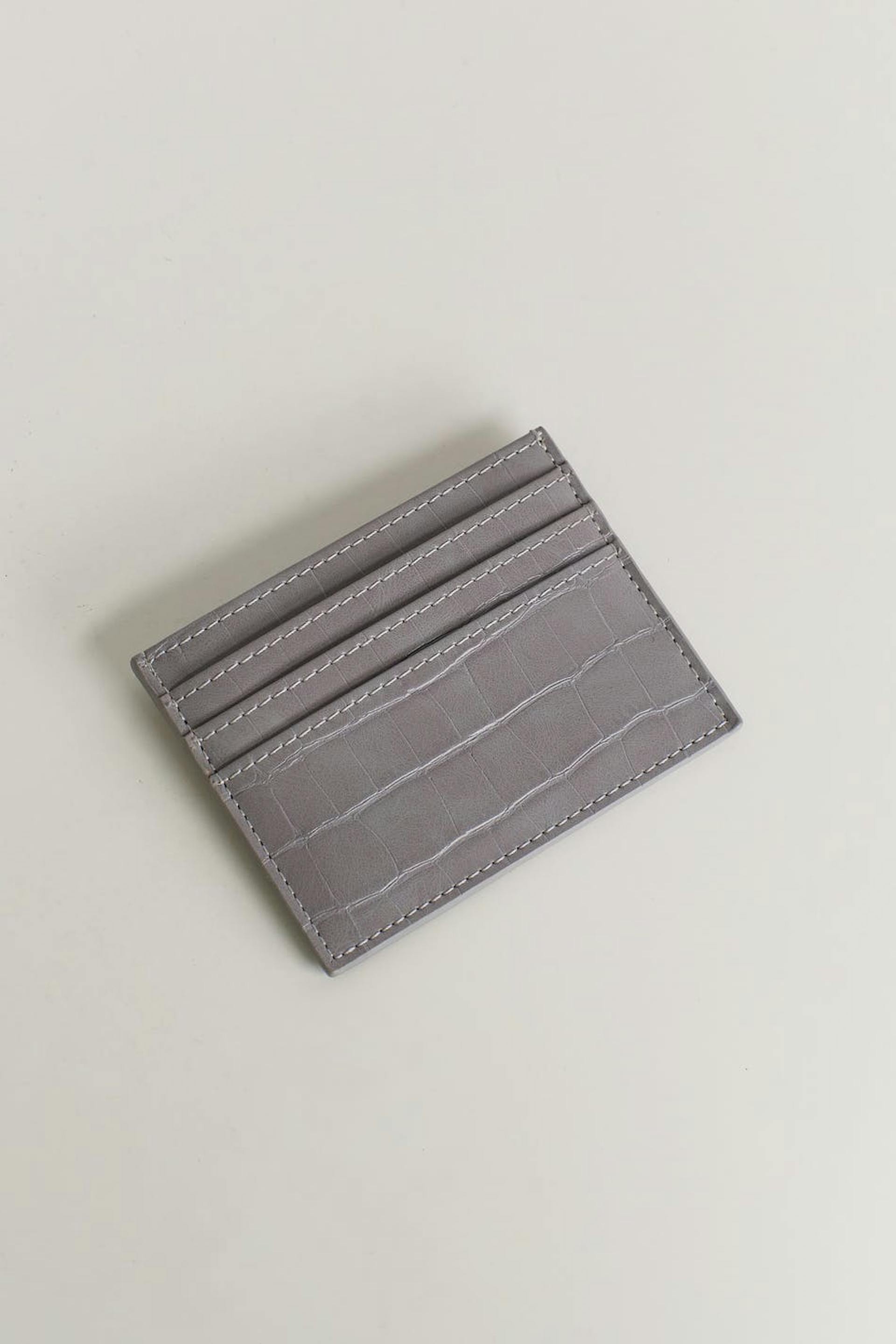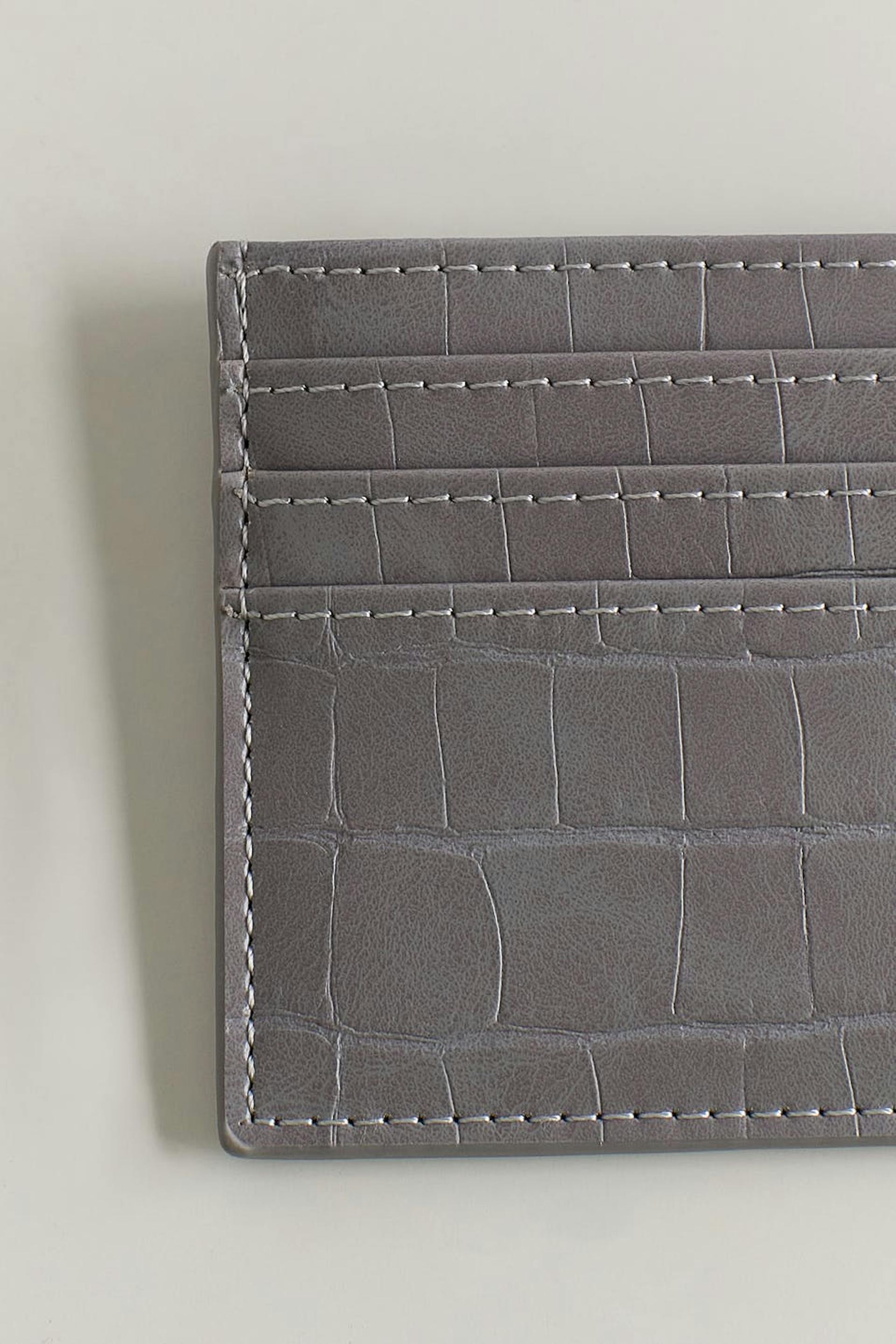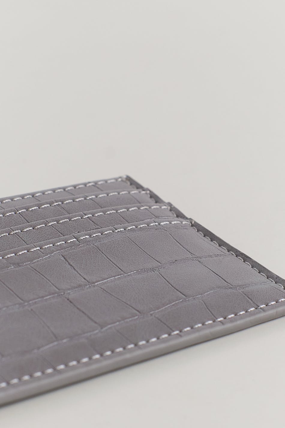Card holder with a crocodile pattern and multiple compartments. The card holder is grey.