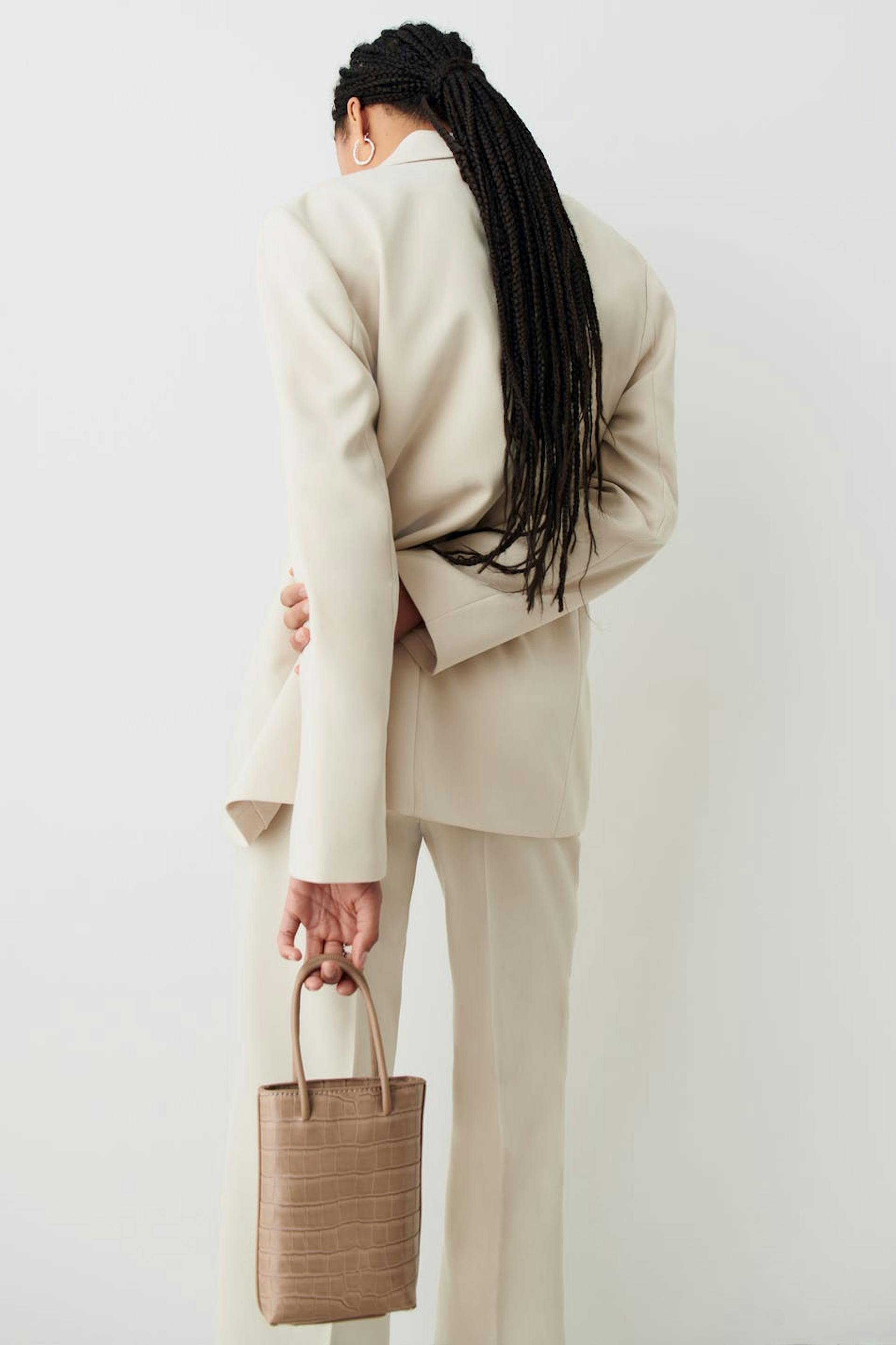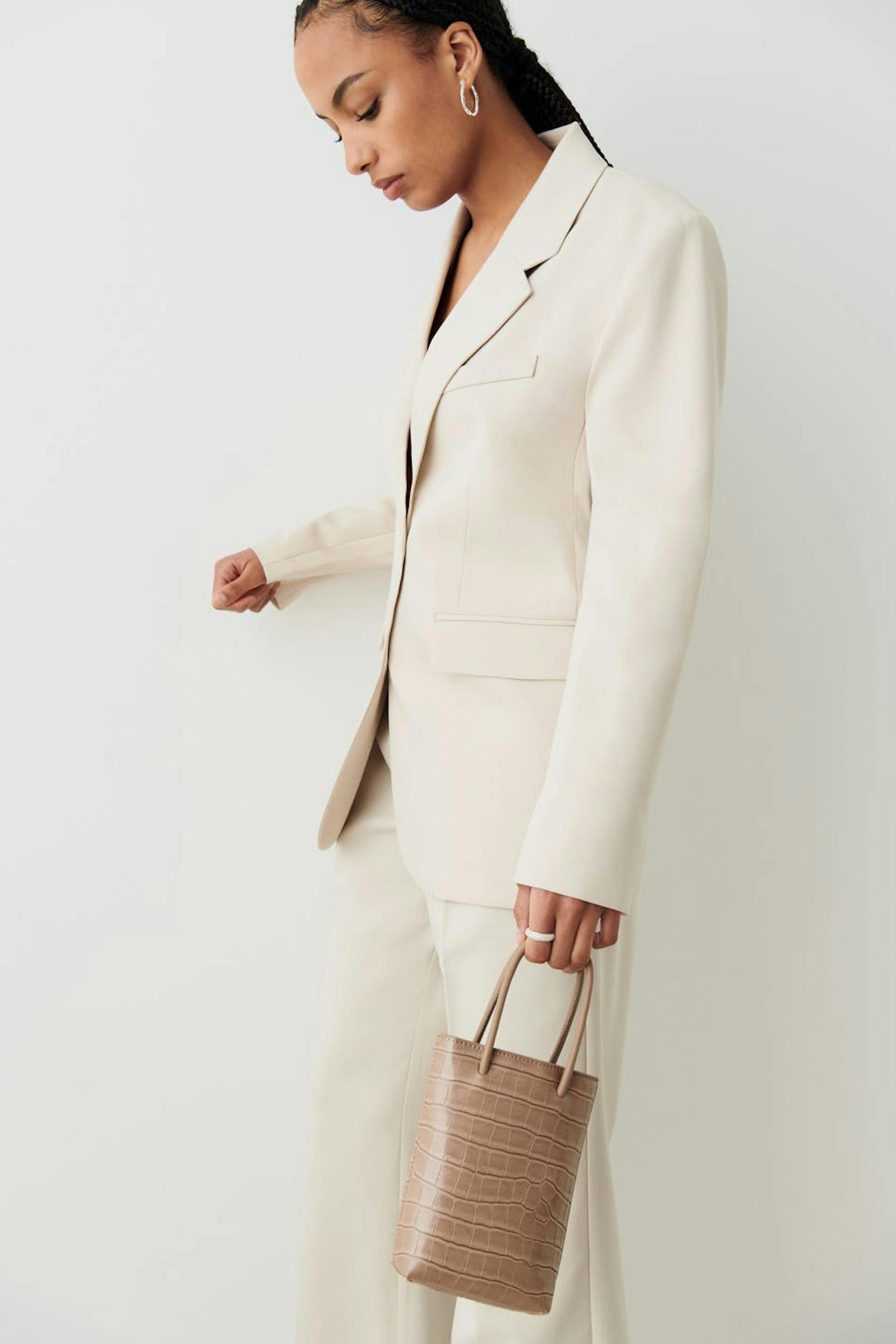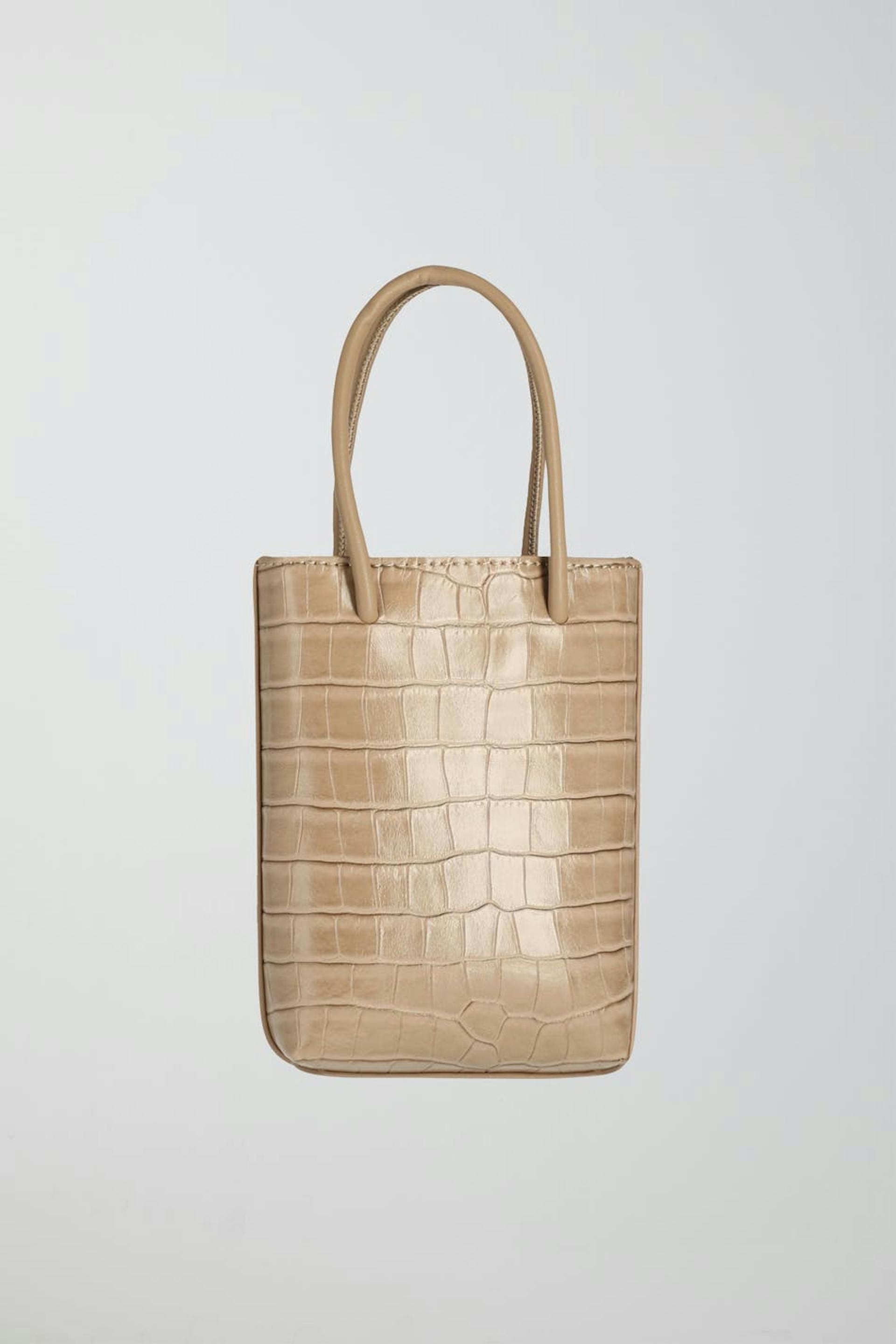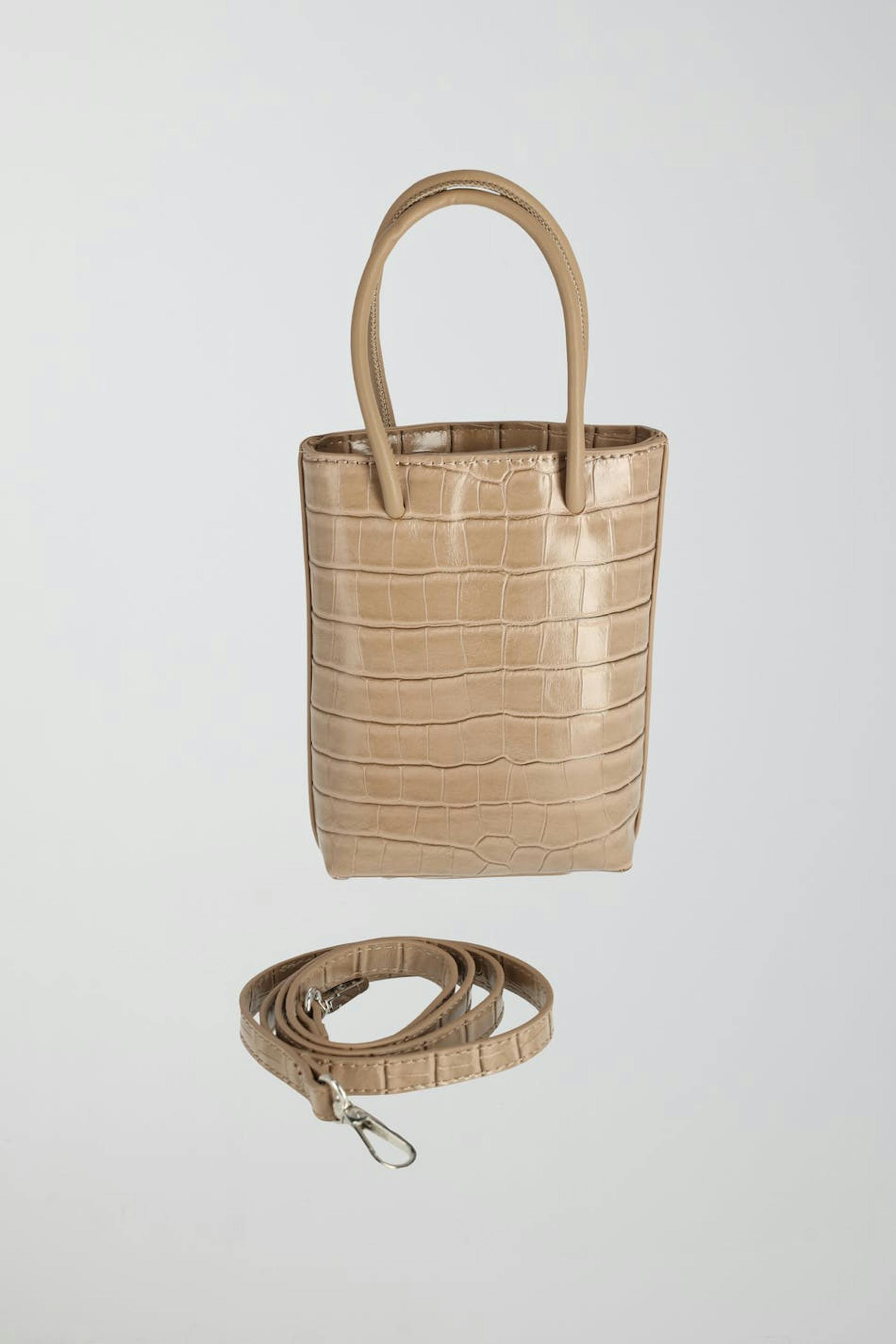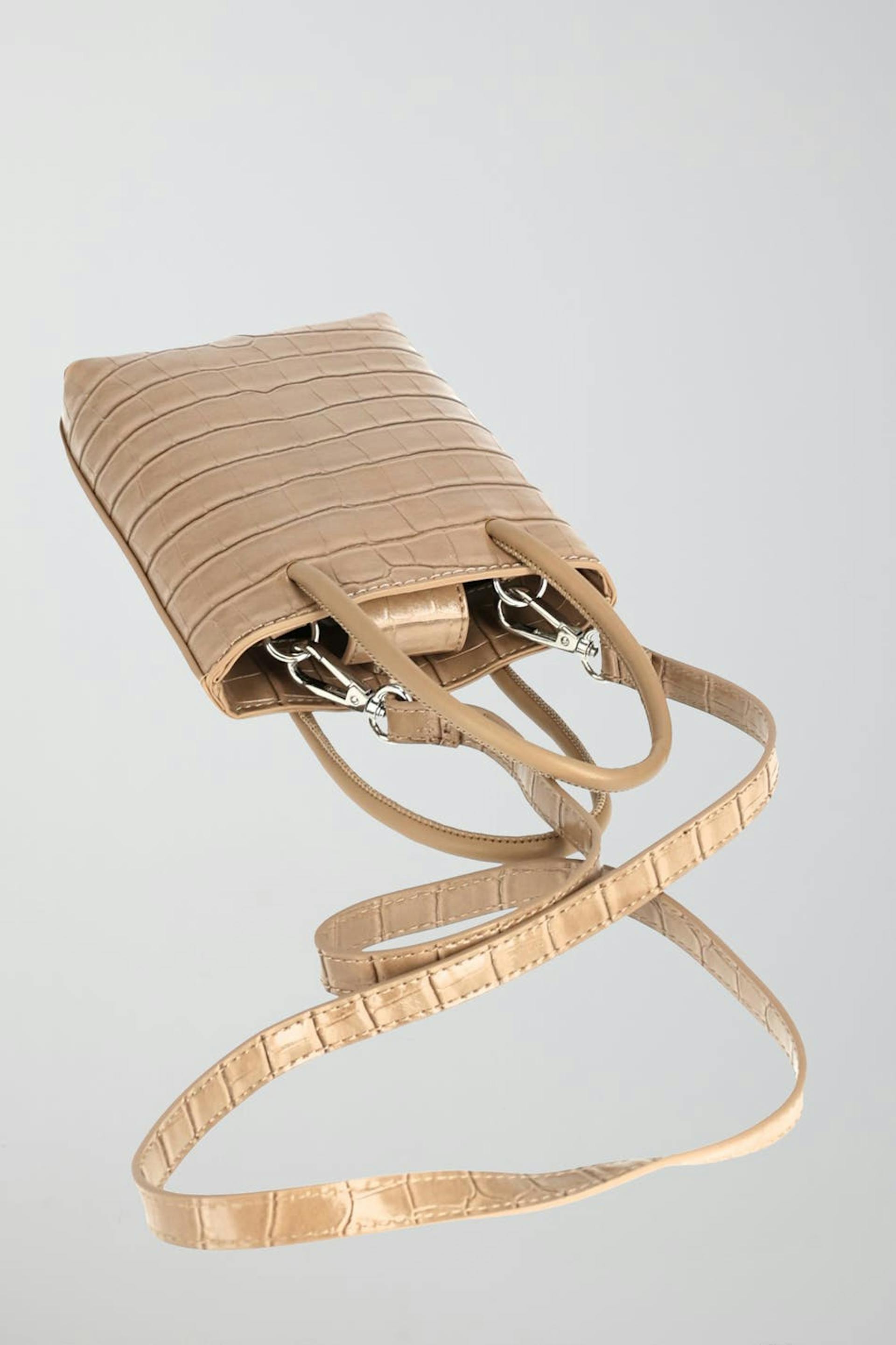 Small bag in PU with design with a crocodile pattern. The bag is beige and has closure with metallic button. It has short handles at the top and a lengthy, removable strap.