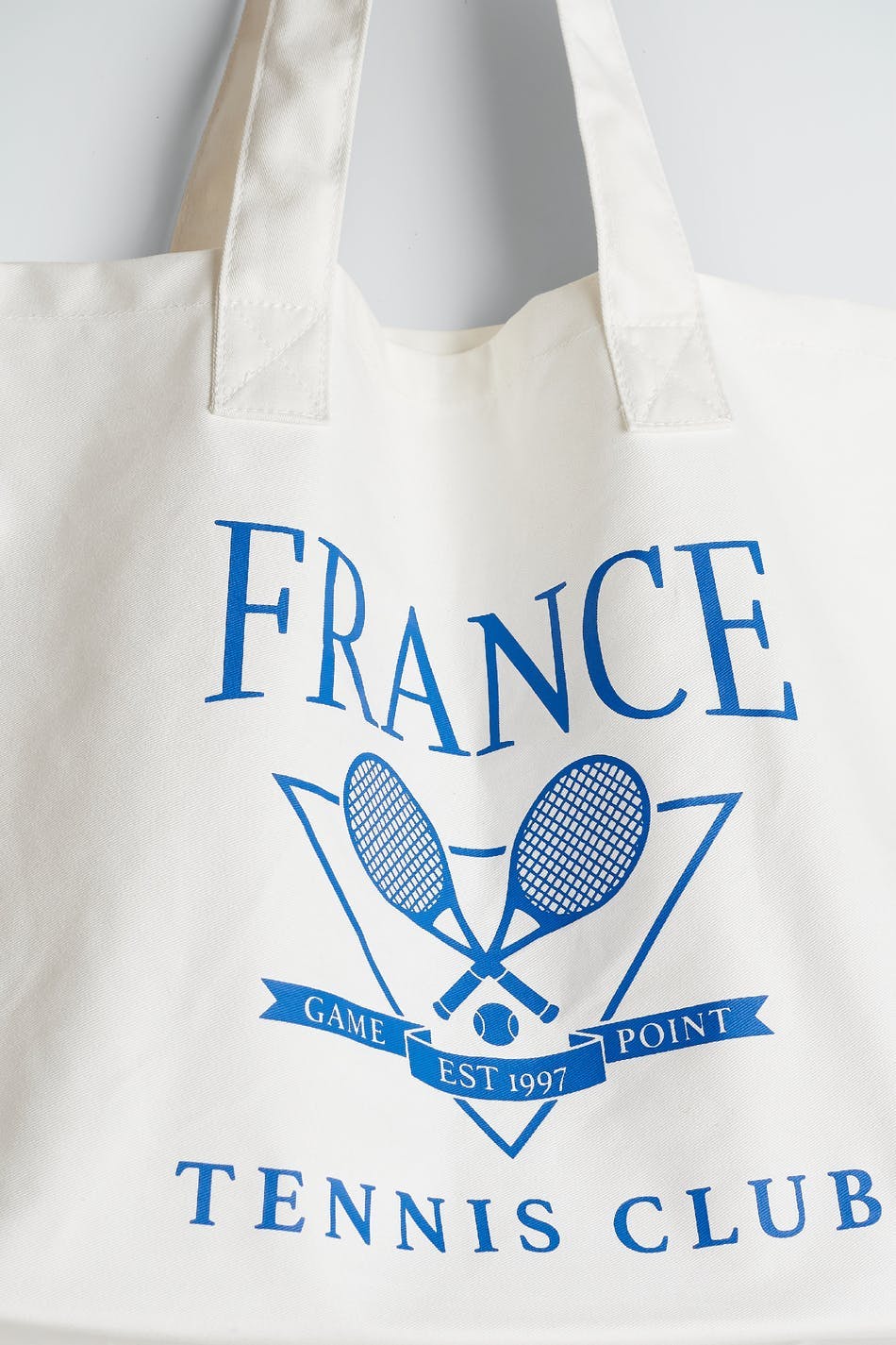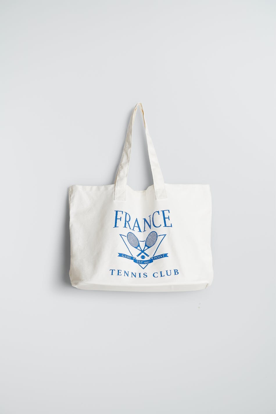 Big bag with a blue print at the front. The bag is white and has a shopper design.