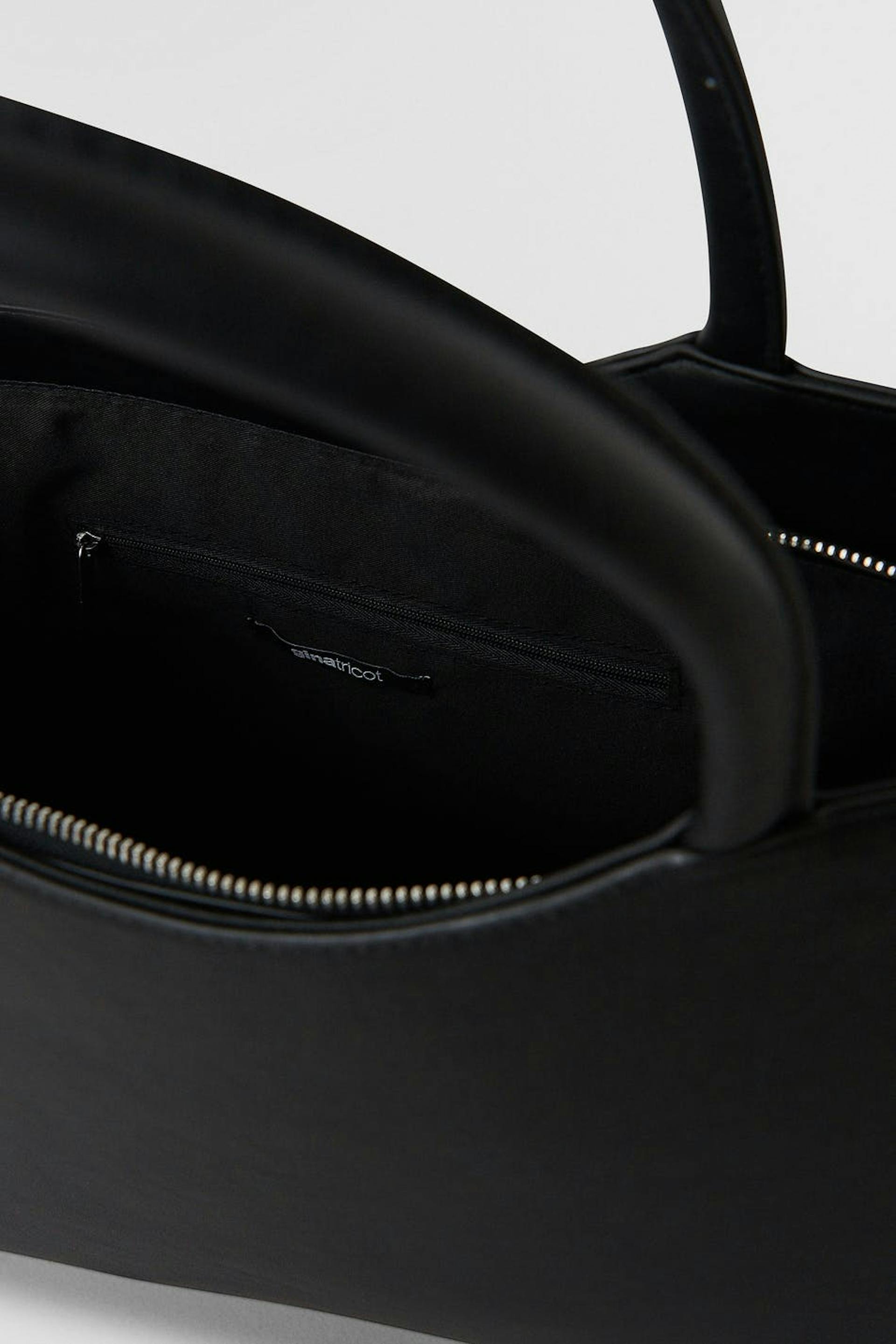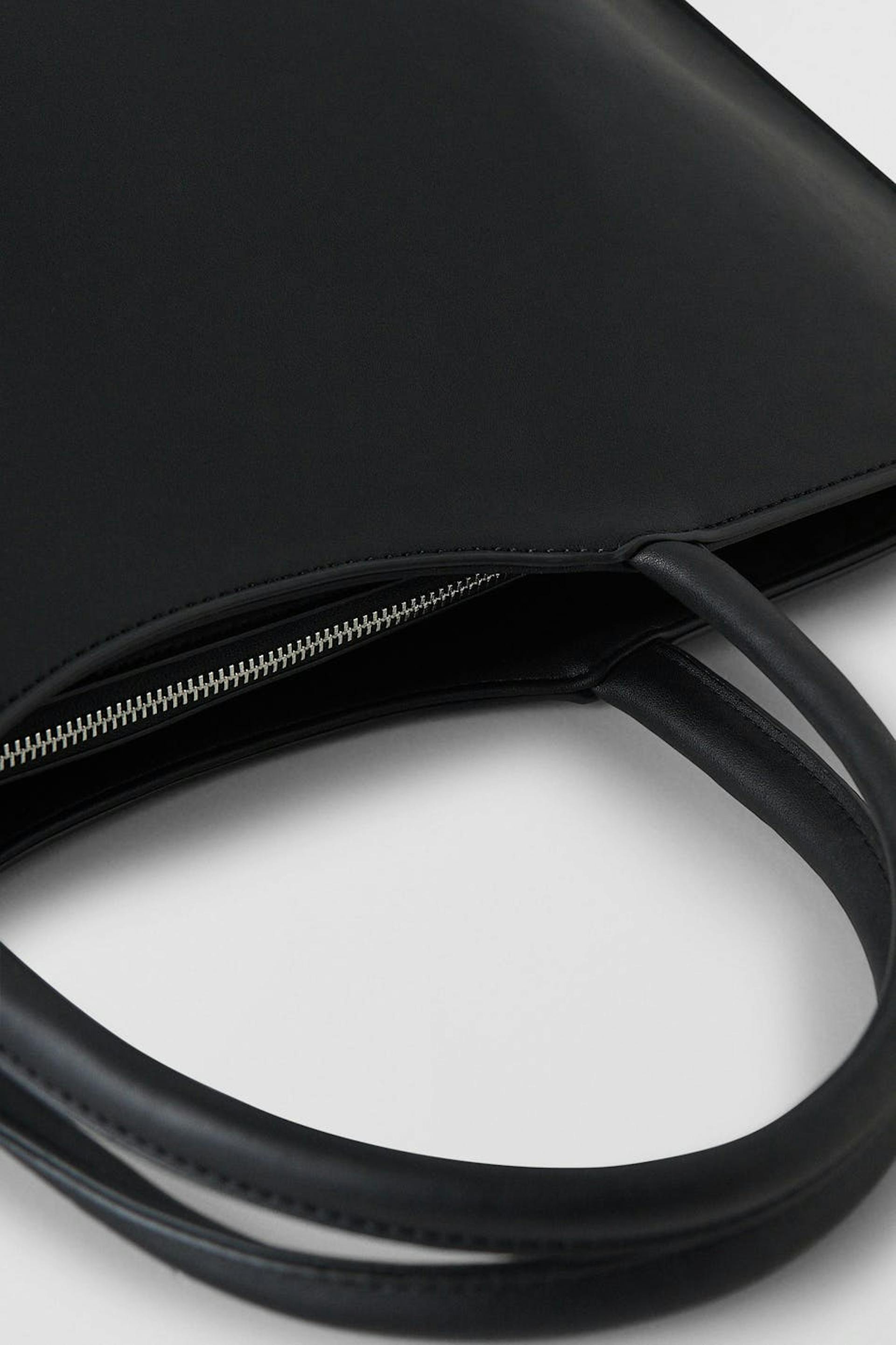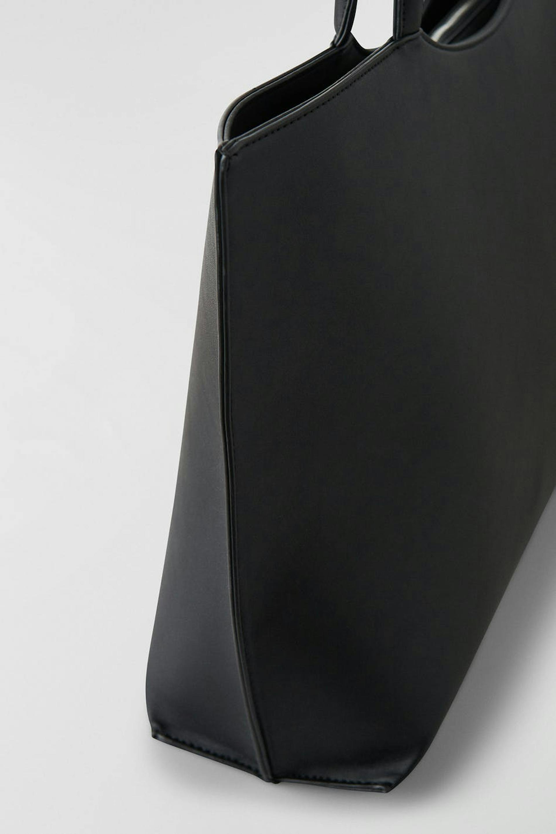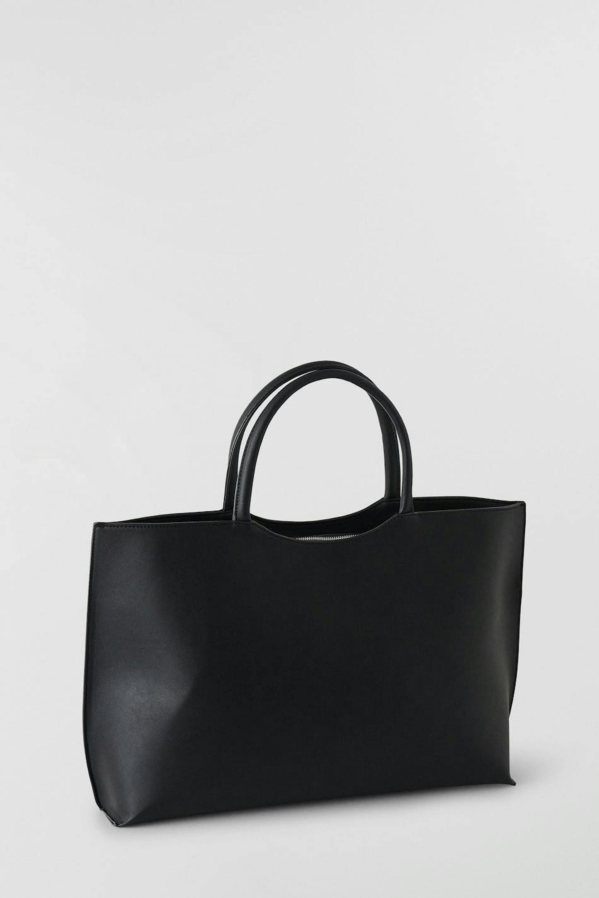 Faux-leather shopping bag with spacious main compartment. The bag is black and has a squared design. It has an inner compartment, two rounded handles at the top and zip closure.