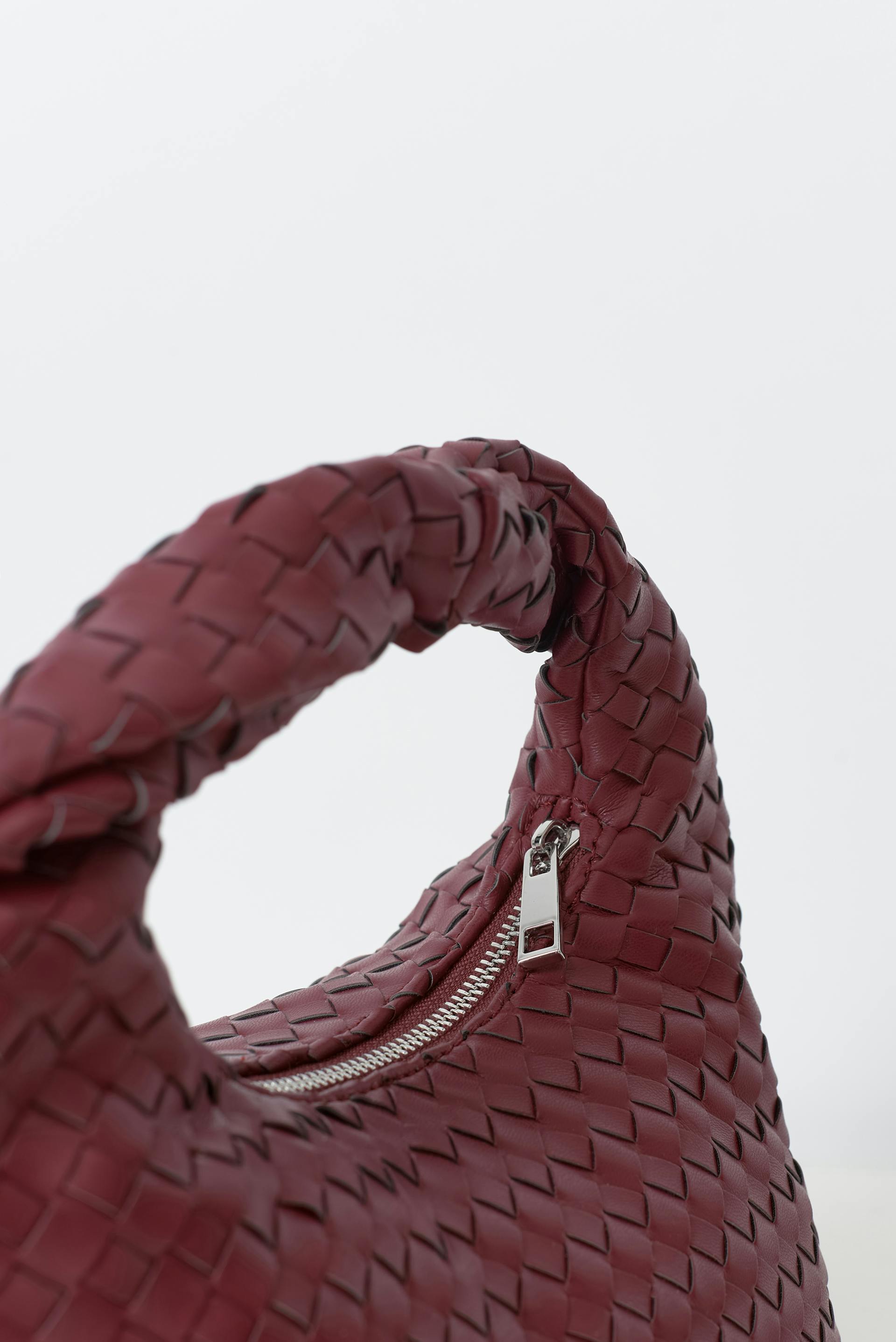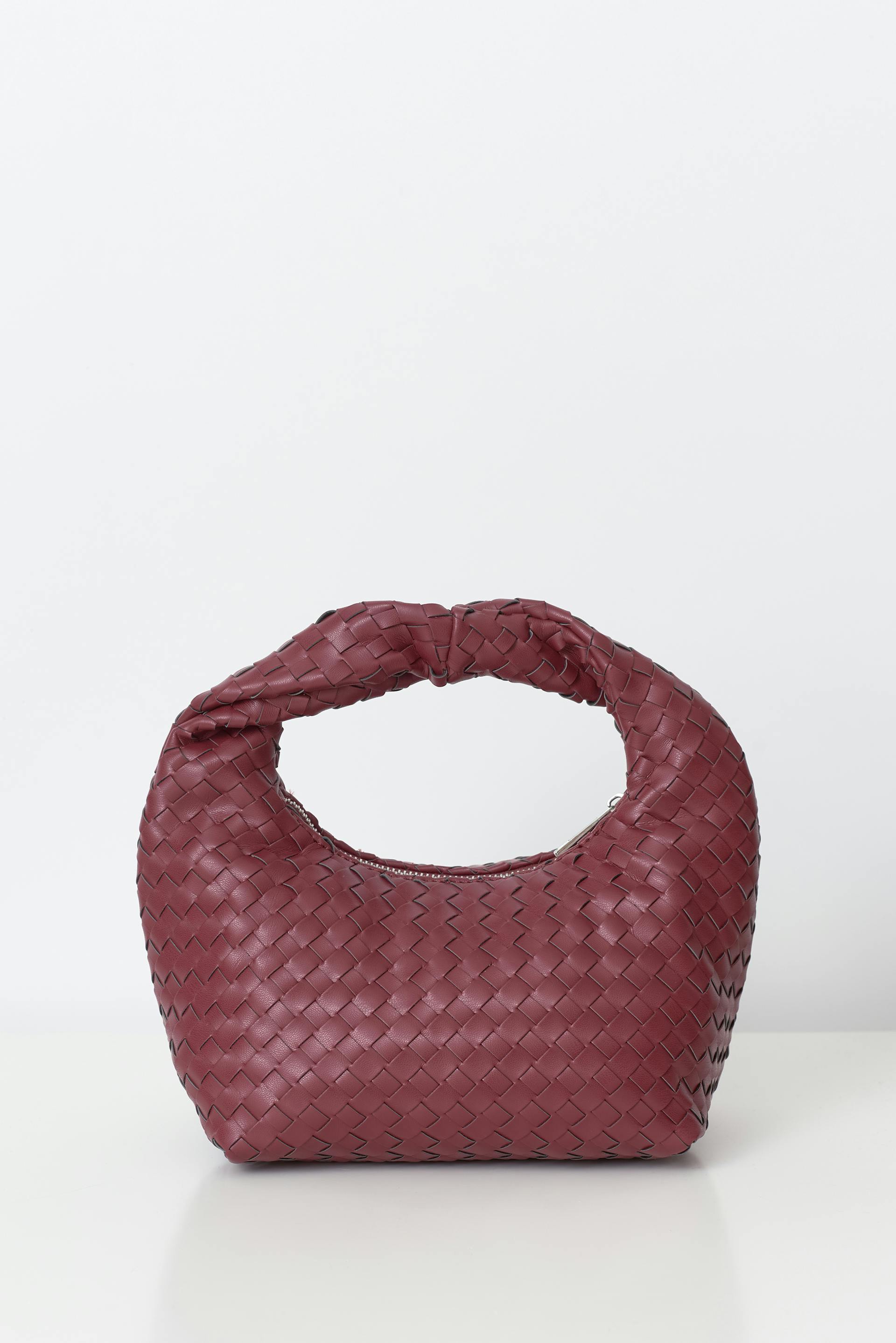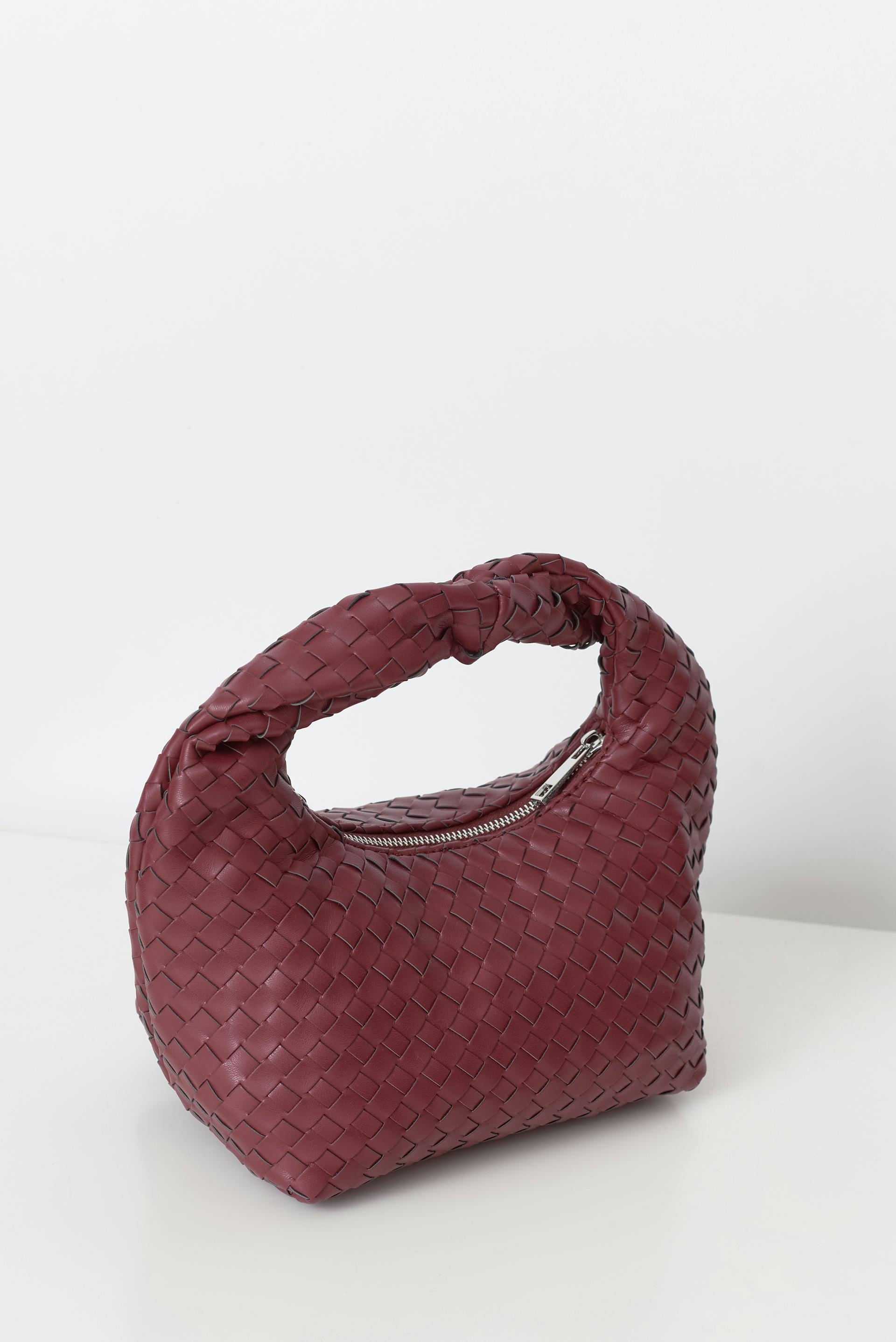 Braided handbag in imitation leather with twisted handle. The bag is red and has zip closure.