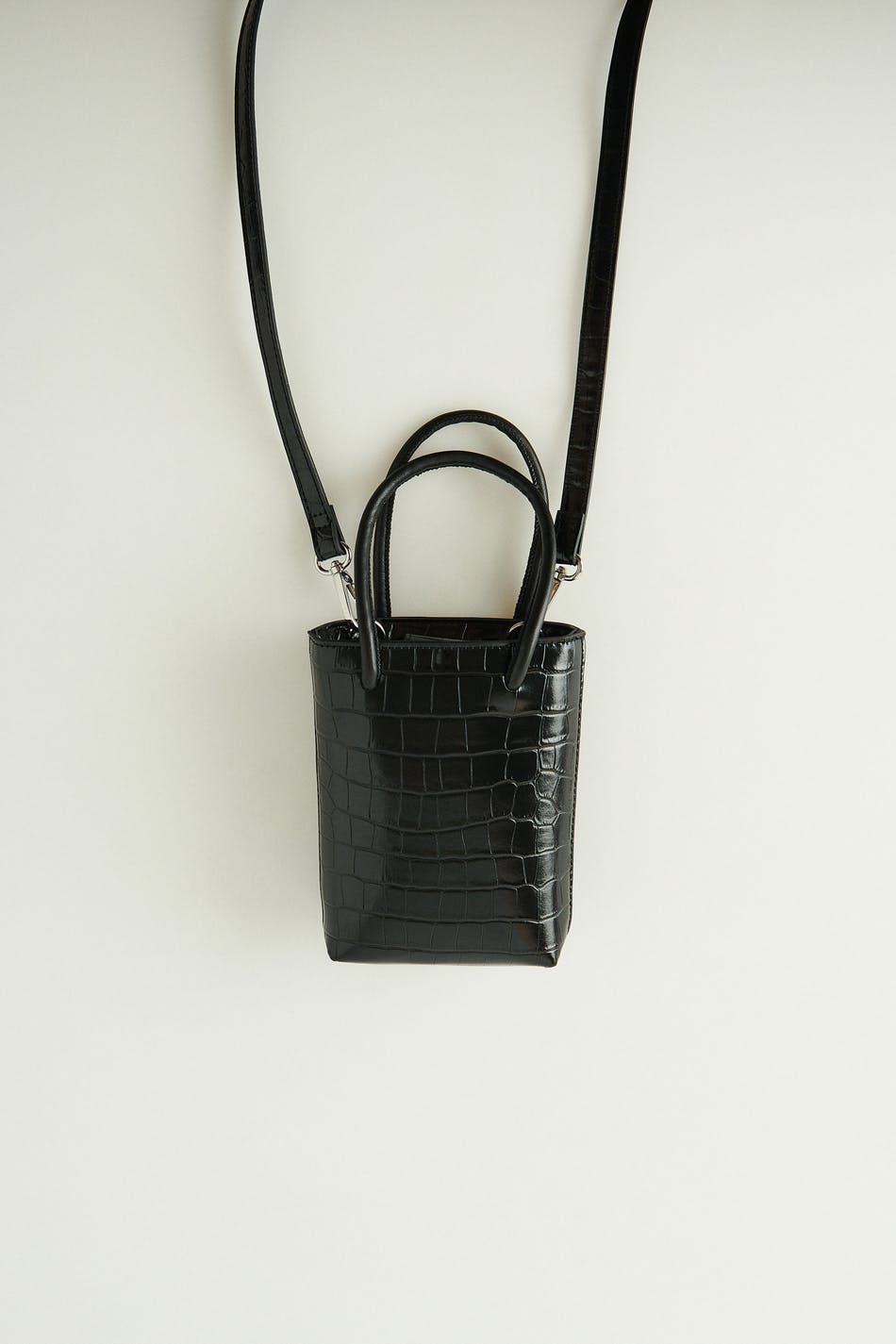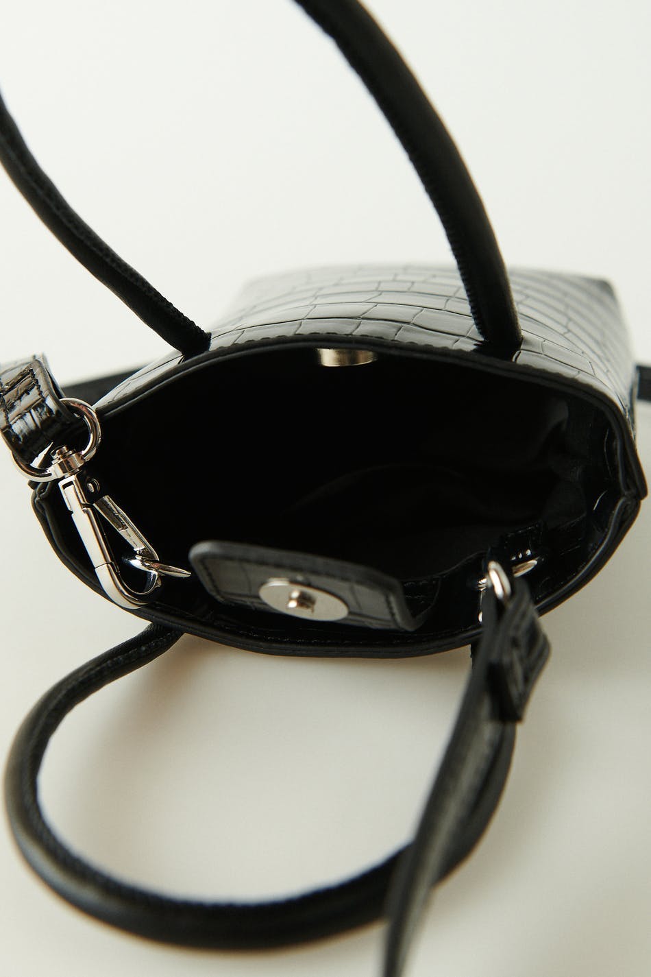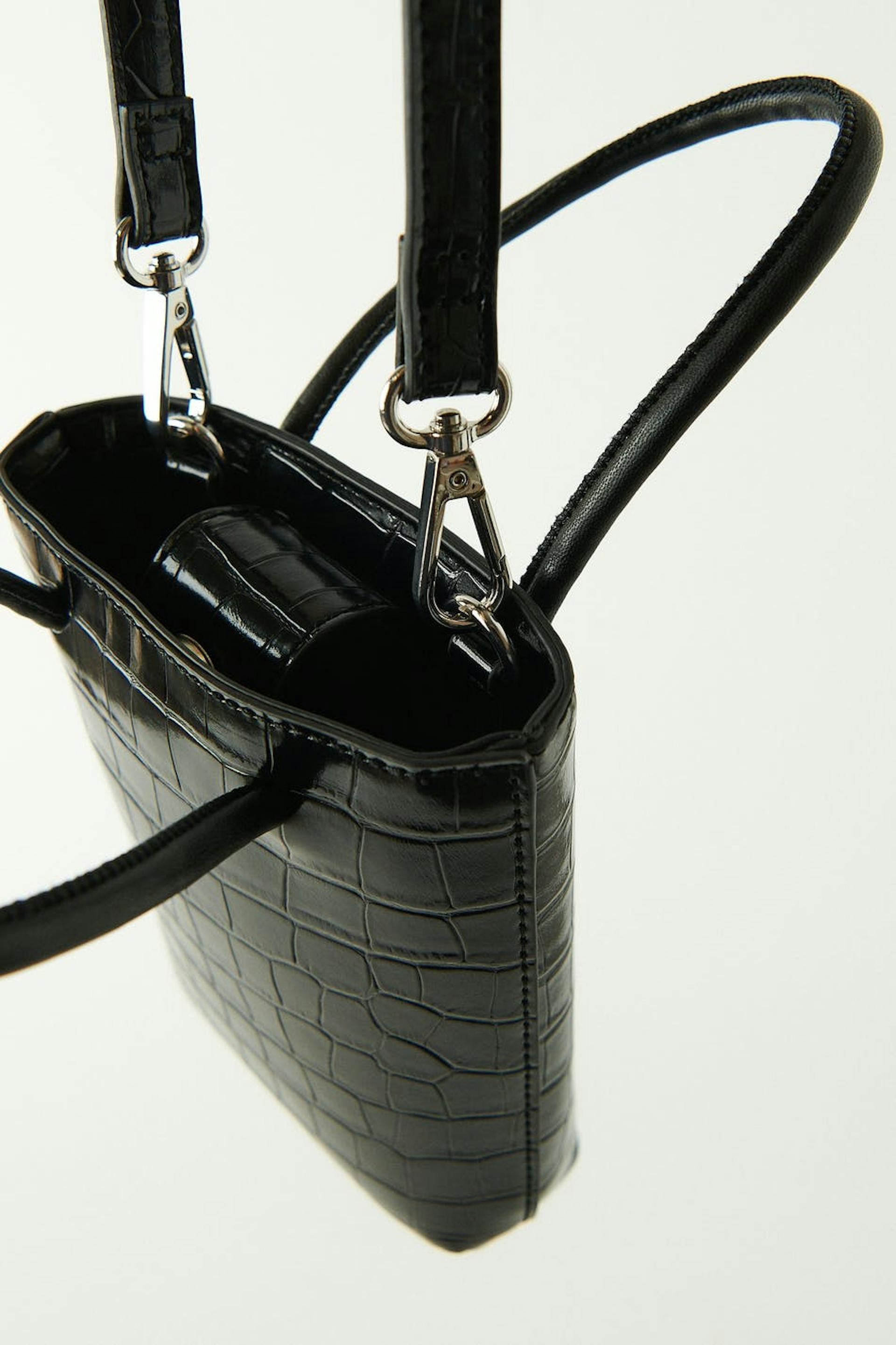 Small bag in PU with design with a crocodile pattern. The bag is black and has closure with metallic button. It has short handles at the top and a lengthy, removable strap.