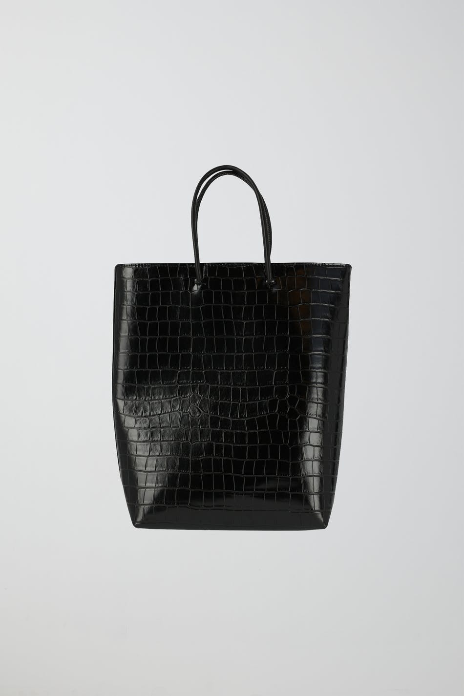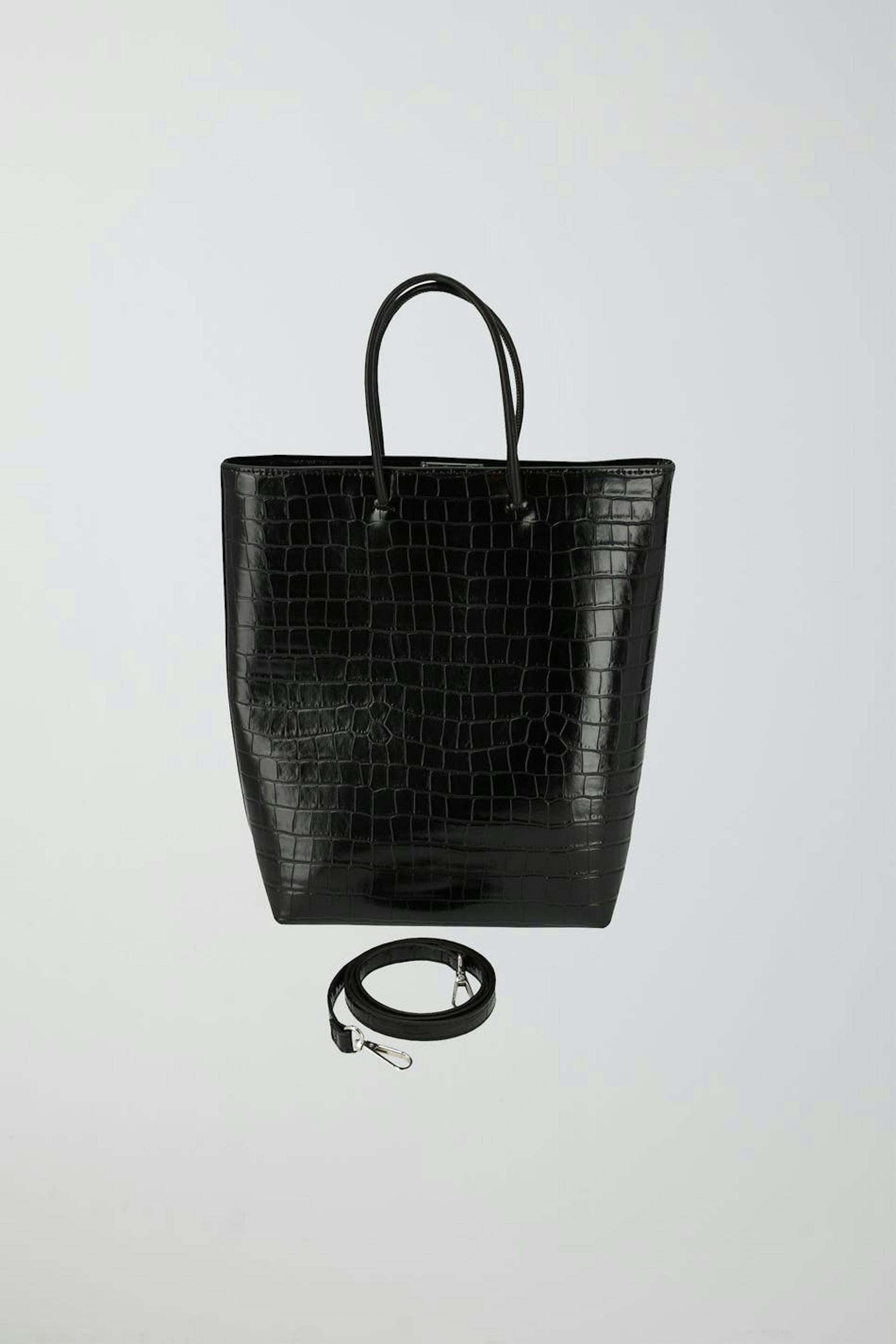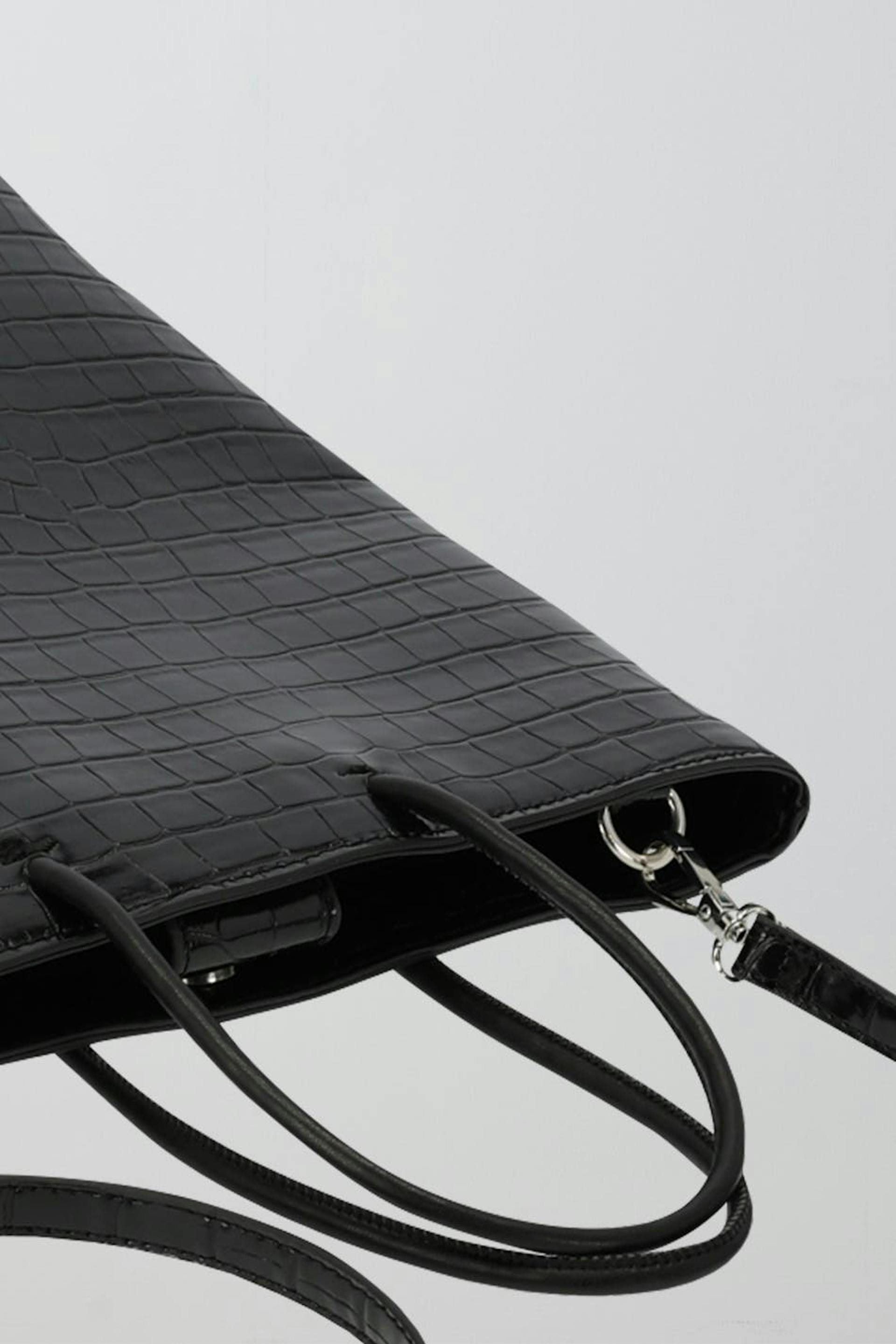 Big shopping bag in imitation leather with double handles at the top. The bag is black and shiny and has a crocodile pattern. It has detachable shoulder strap and closure with magnetic fastening.