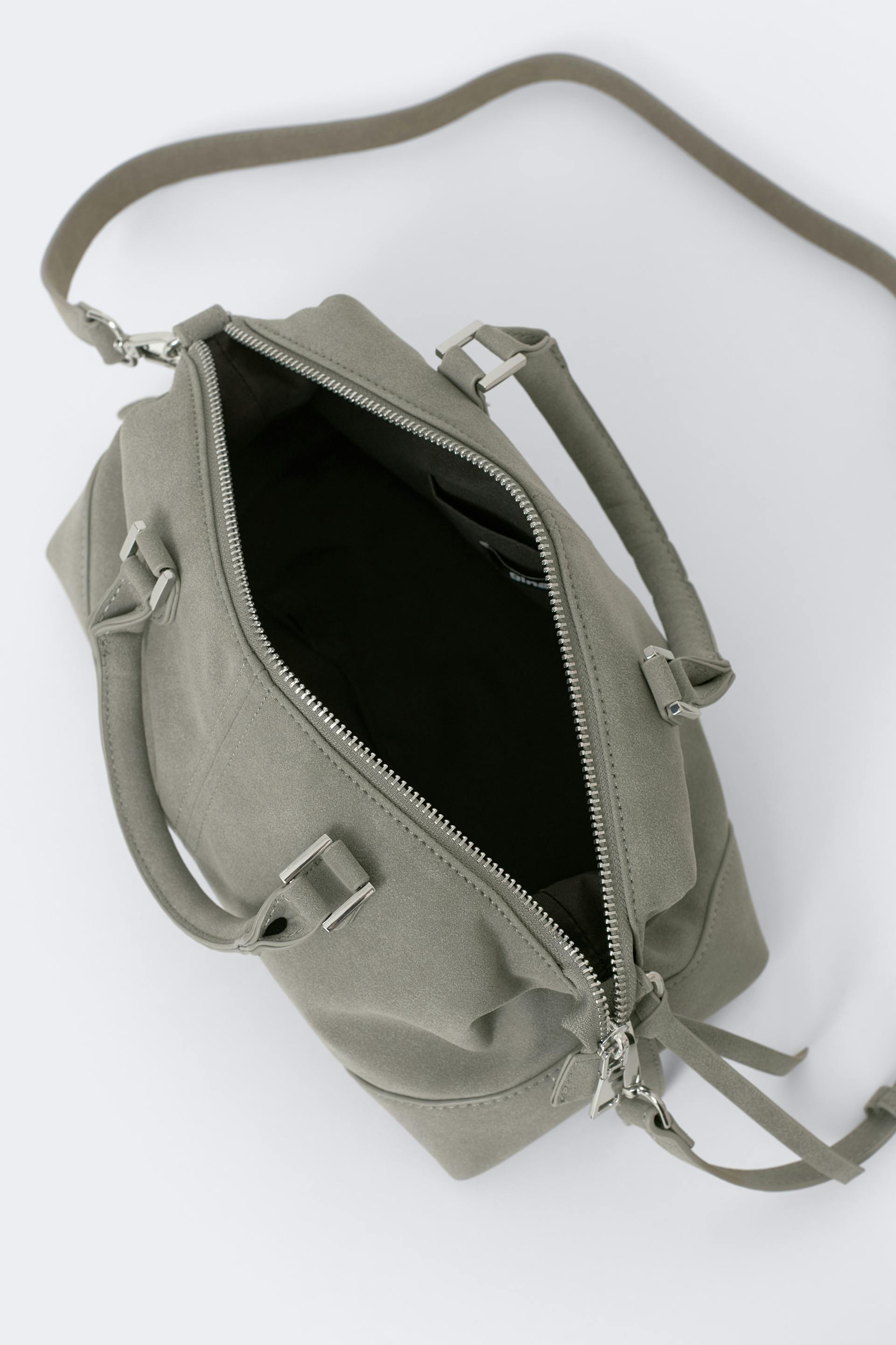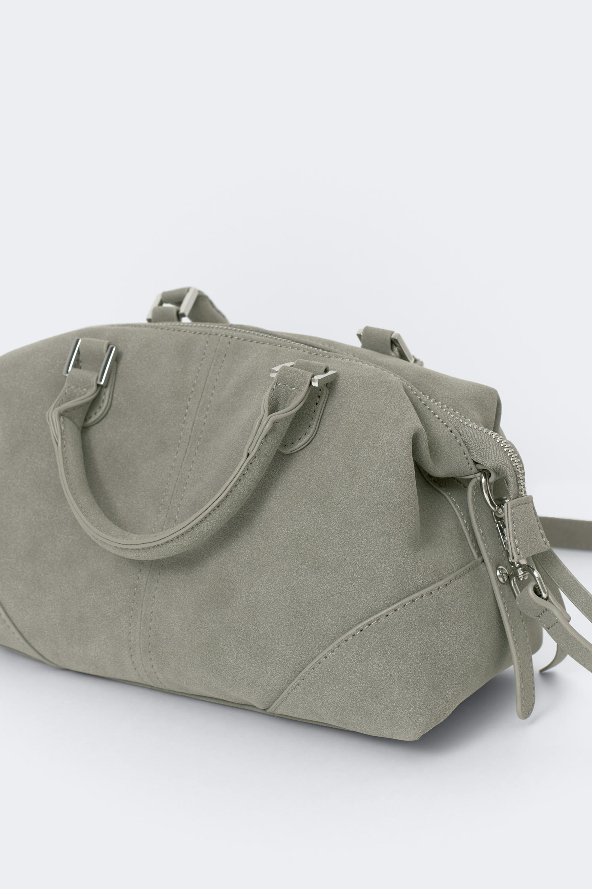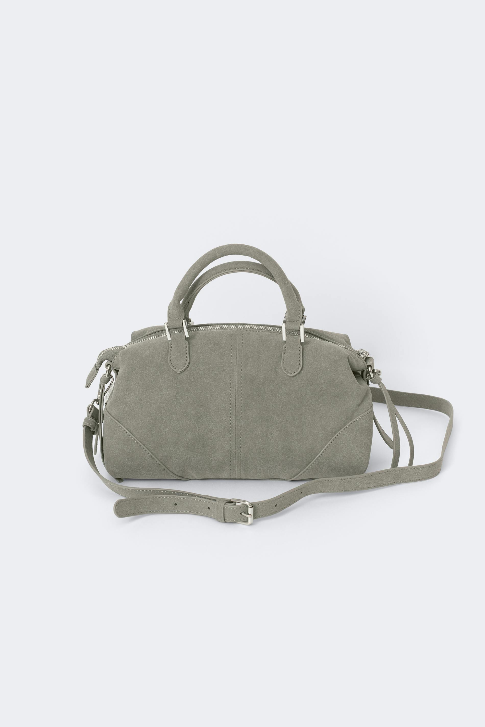 Shoulder bag in imitation suede with double handles at the top. The bag is grey and has silver details. It has zip closure at the top, lined inside, long, detachable shoulder strap and feet in metal underneath.