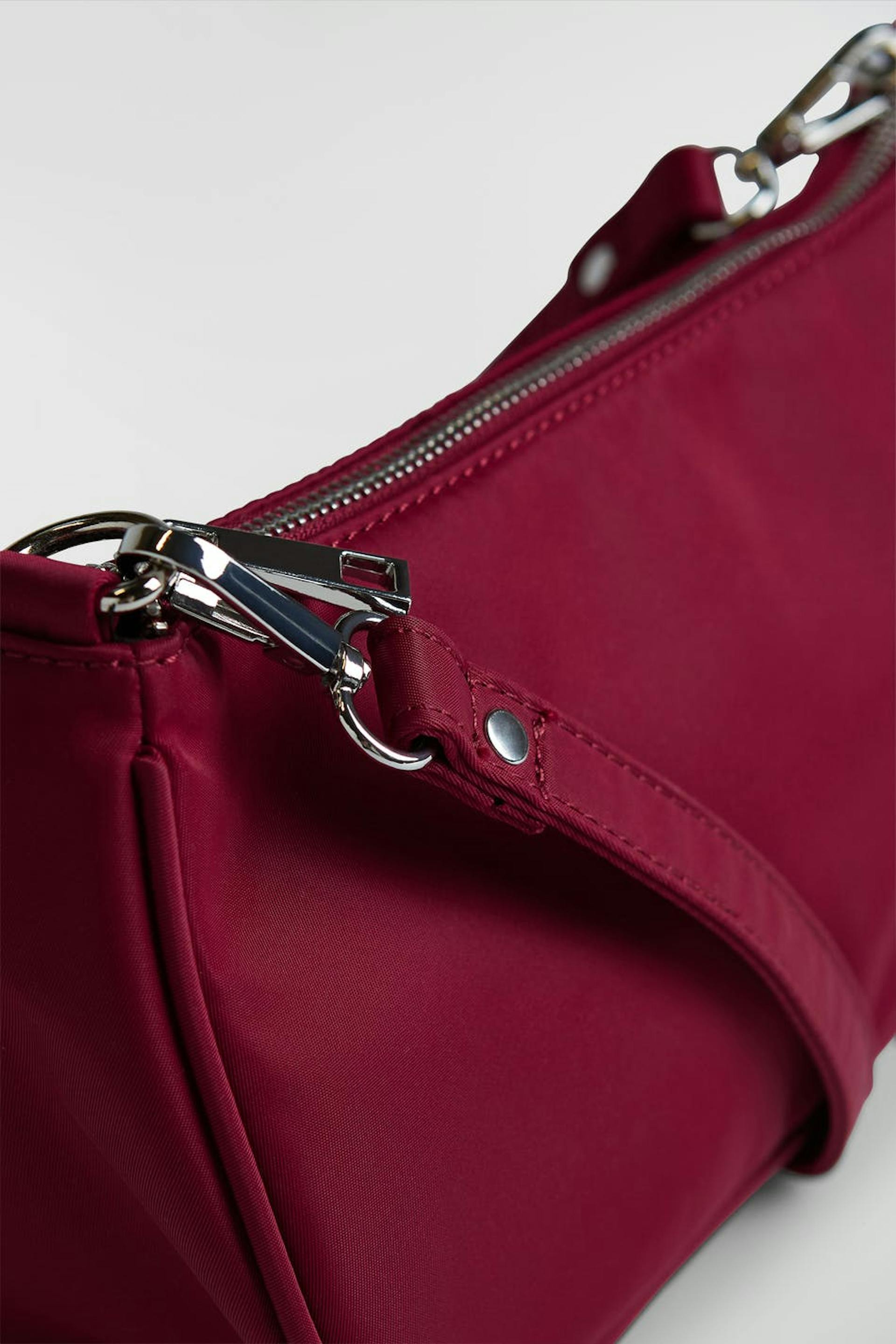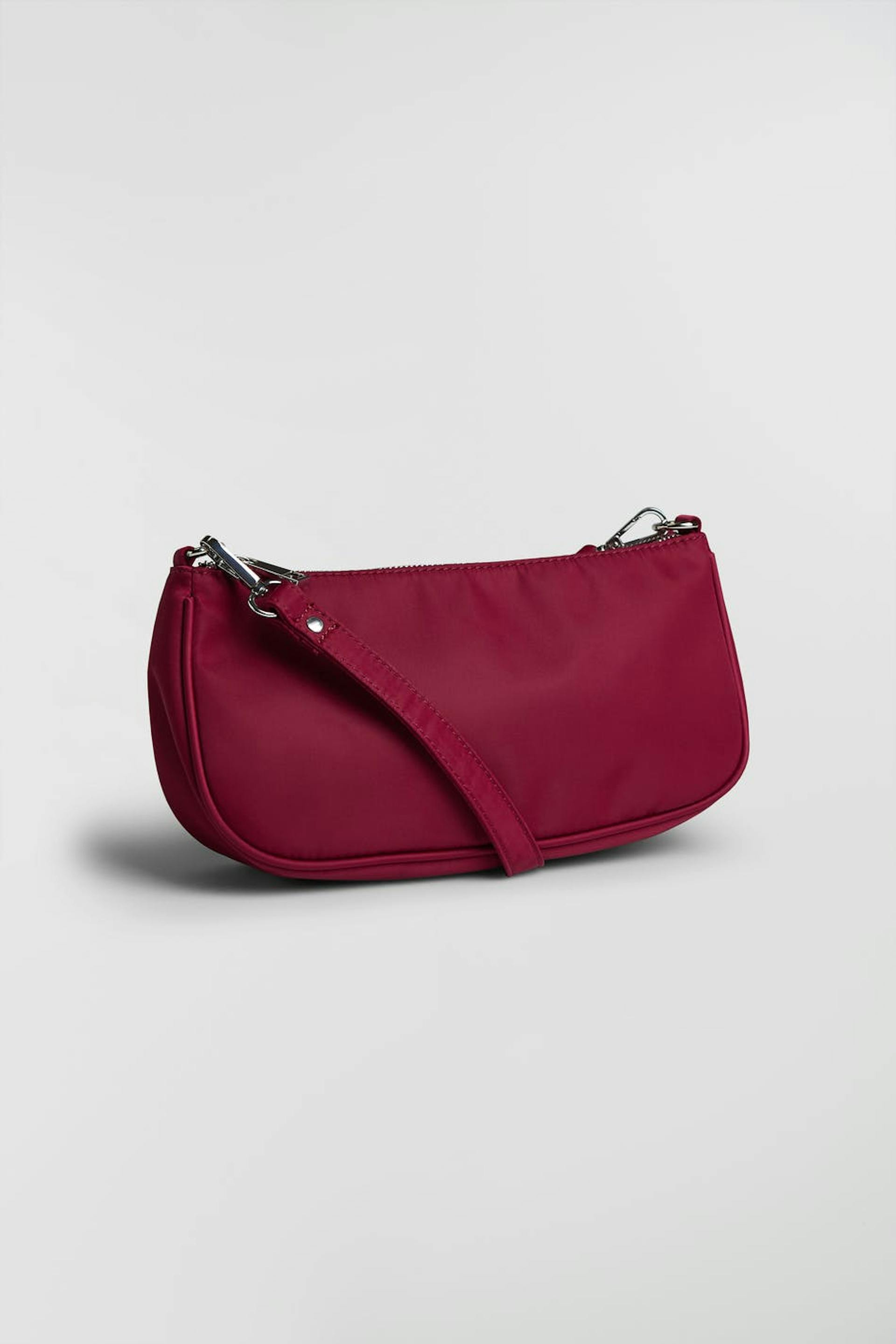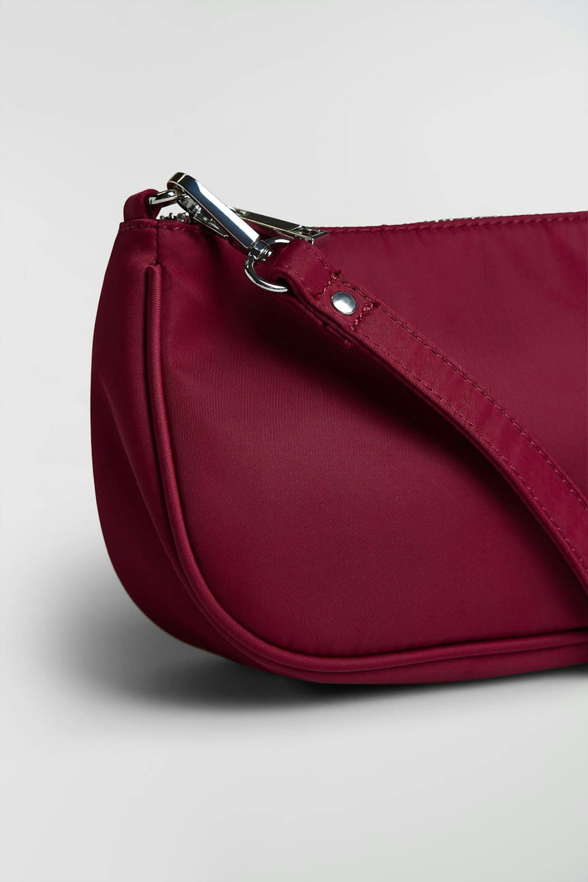Baguette bag with a short shoulder strap. The bag is wine. It is made of nylon.