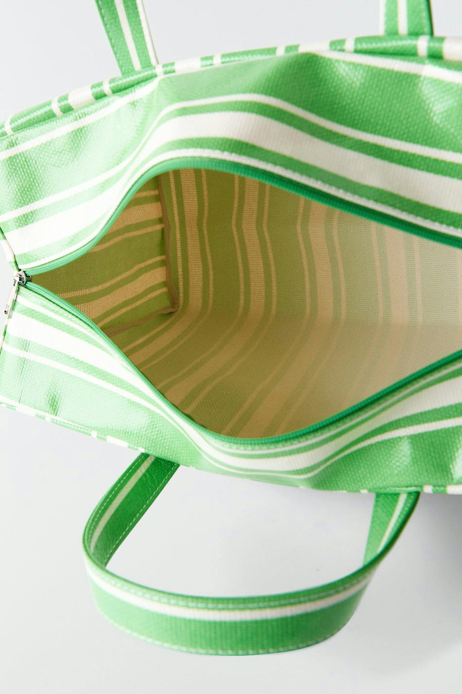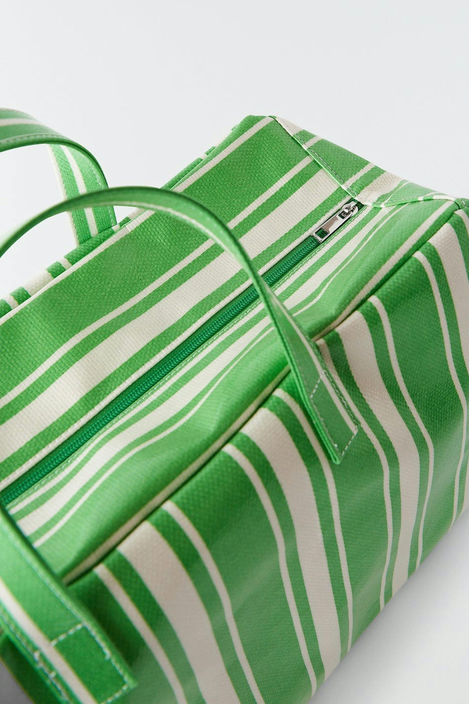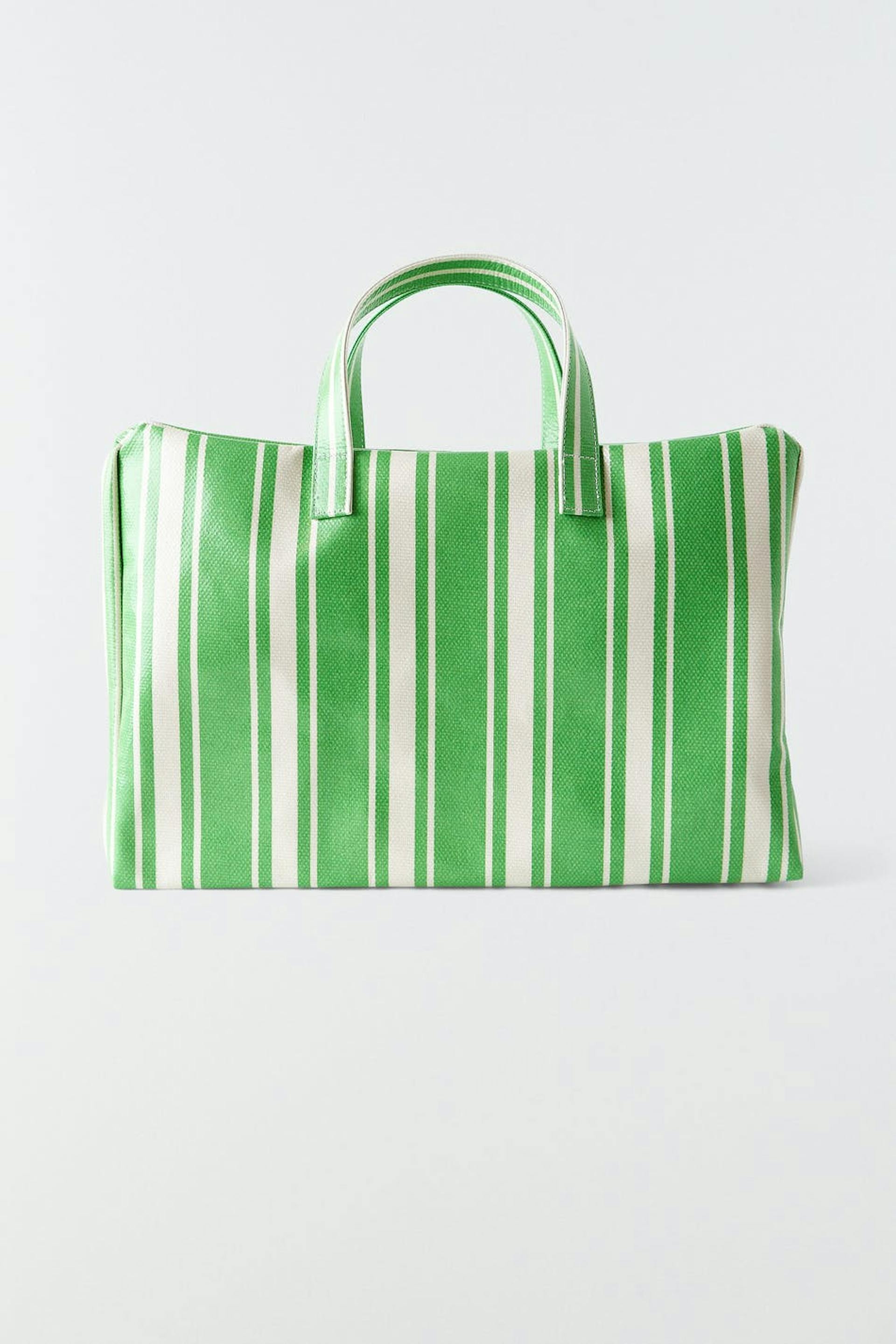 Striped bag with a shopper design. The bag is green and has a spacious main compartment. It has short handles and a zip at the top.