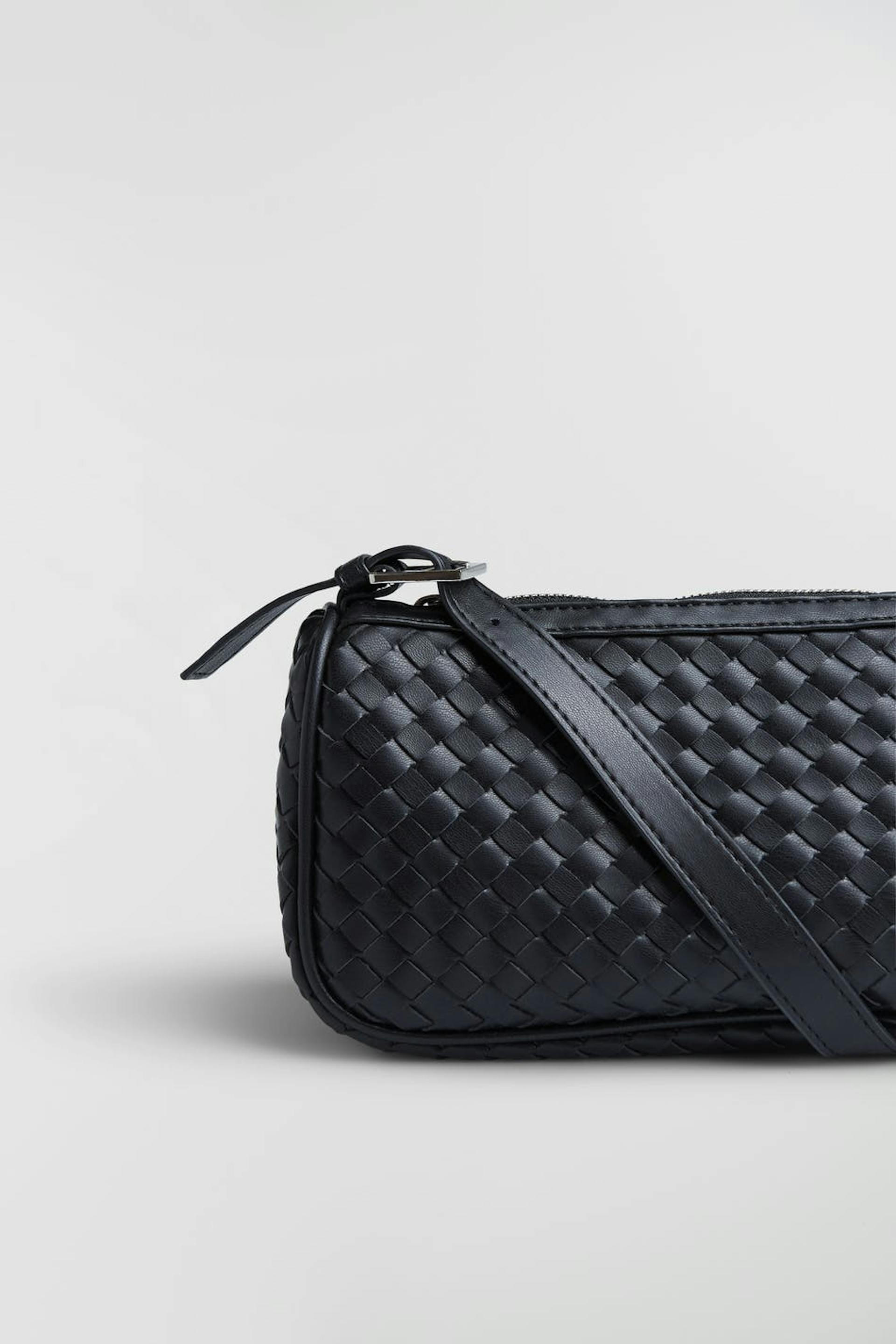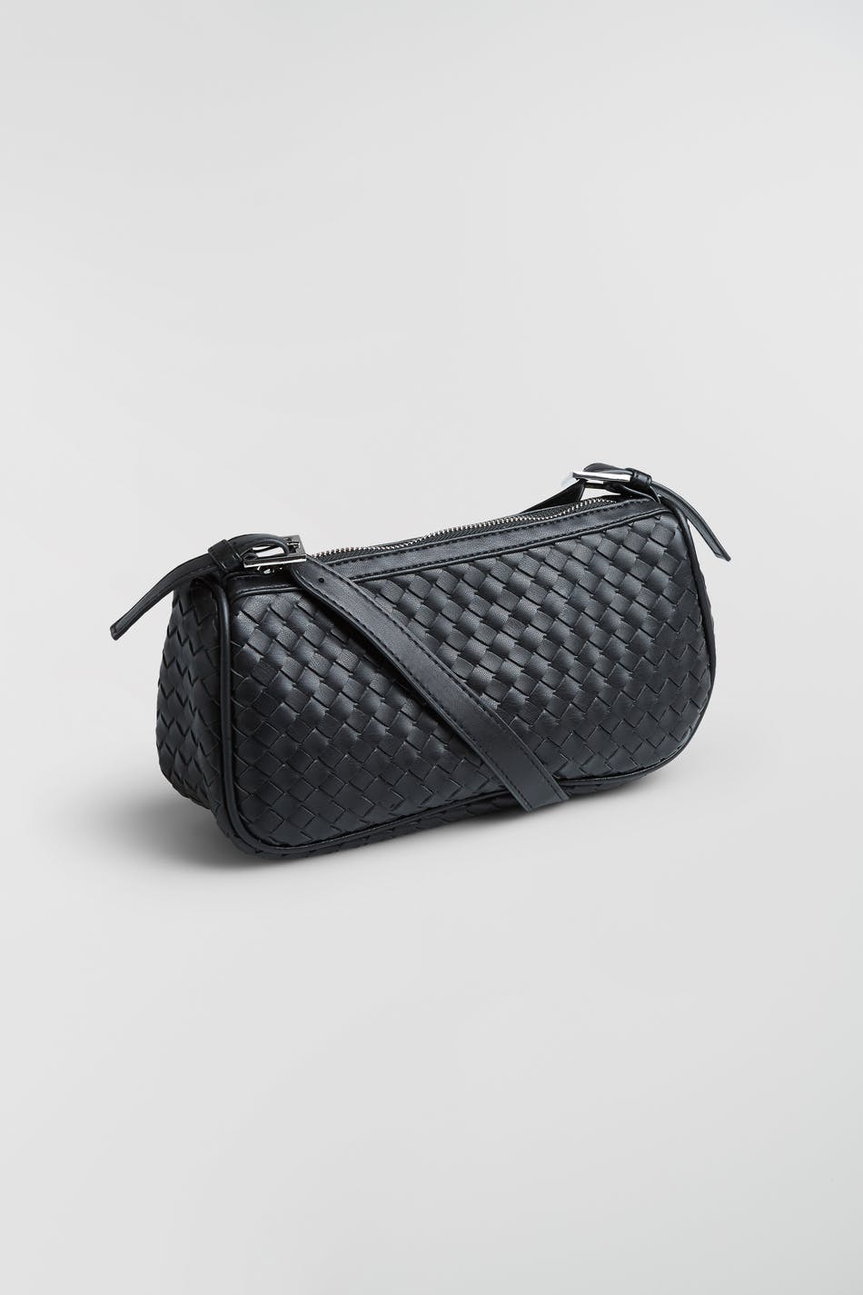 Soft baguette bag with a short shoulder strap. The bag is black and braided. It is made of PU.