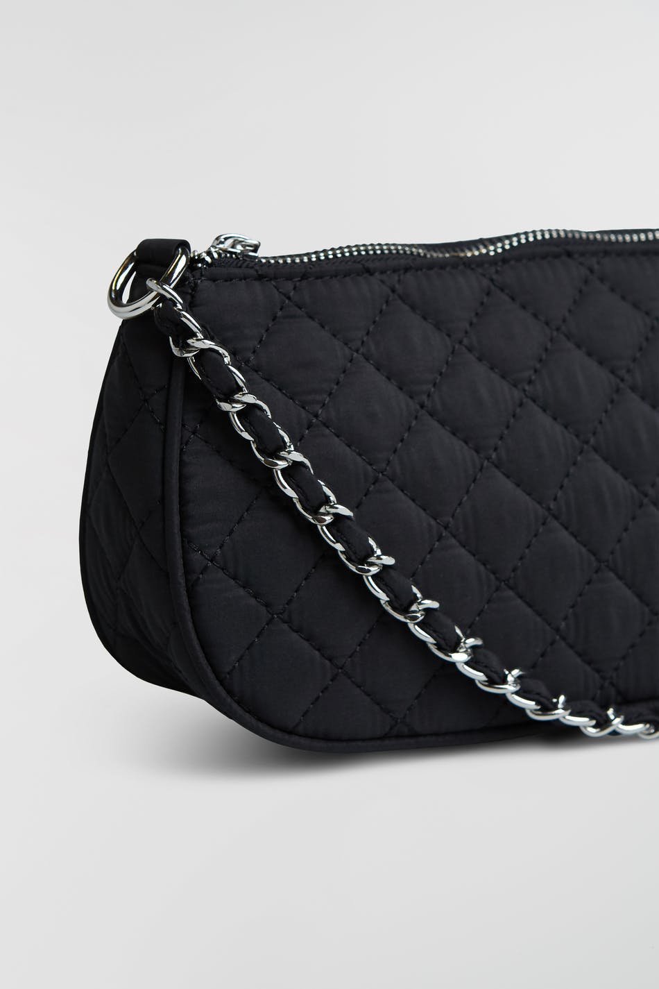 Quilted baguette bag with a shoulder strap with a chain detail. The bag is black and has a zip on top.