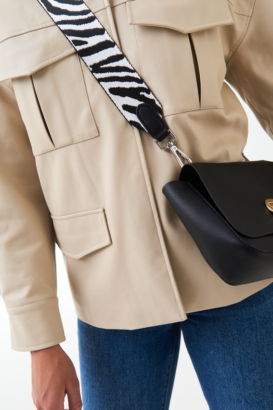 Zebra patterned shoulder strap with an adjustable length. The strap is black and white and has a clasp closure on each side.