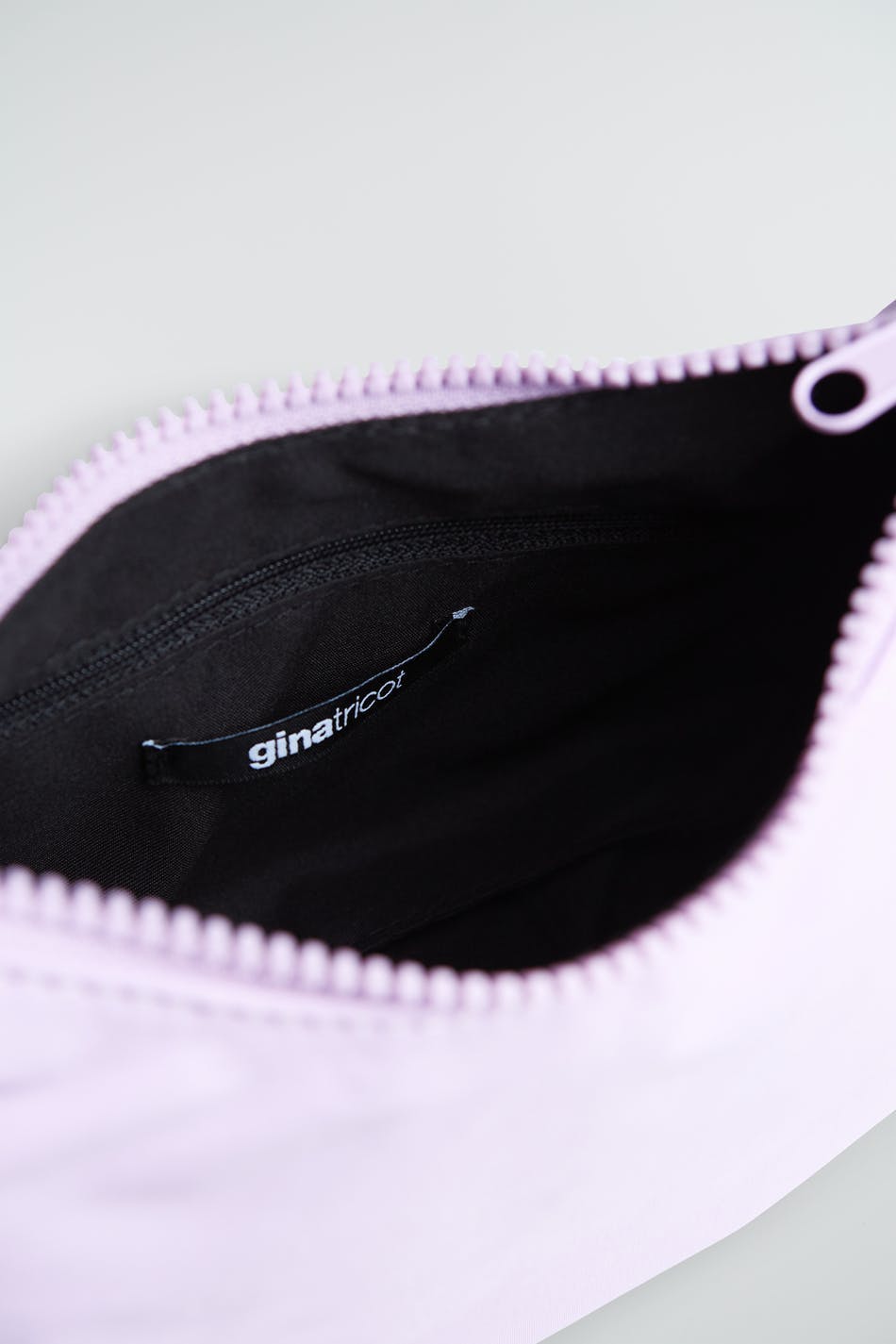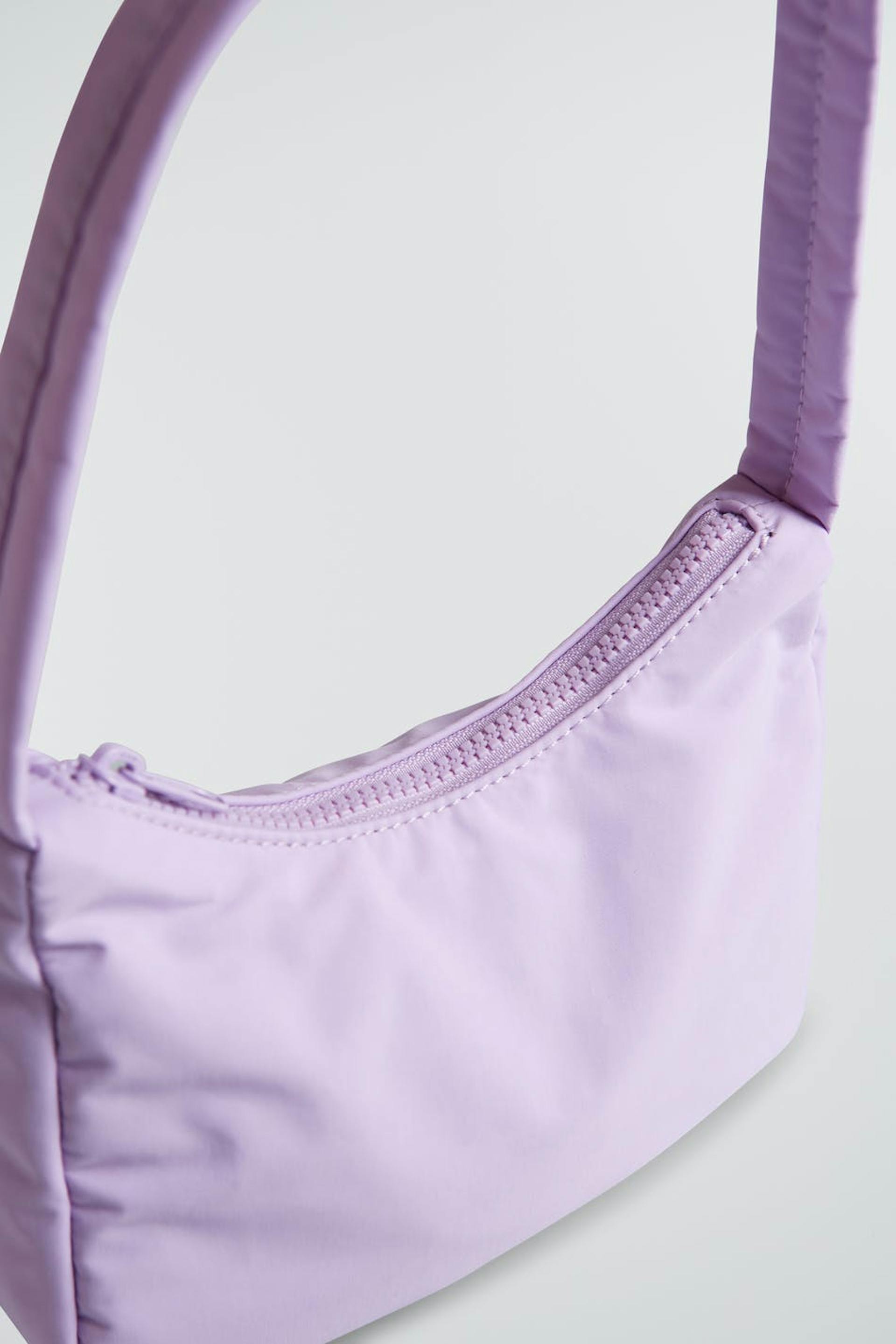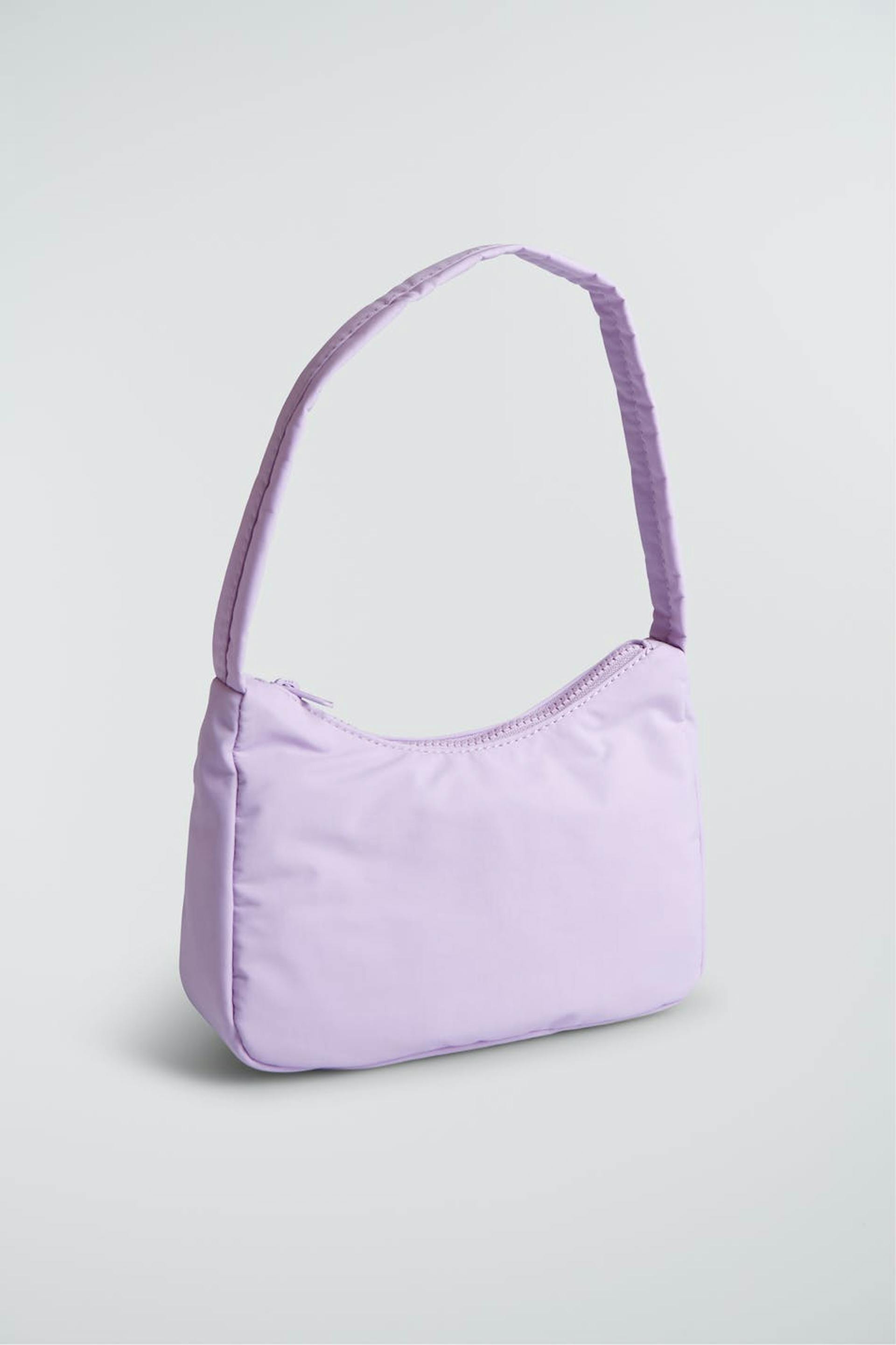 Baguette bag with a short shoulder strap. The bag is light purple. It is made of nylon.