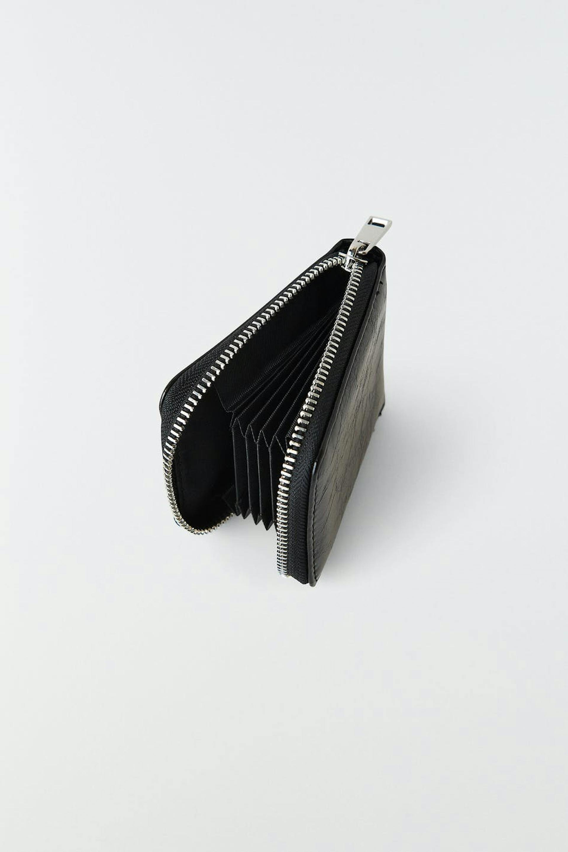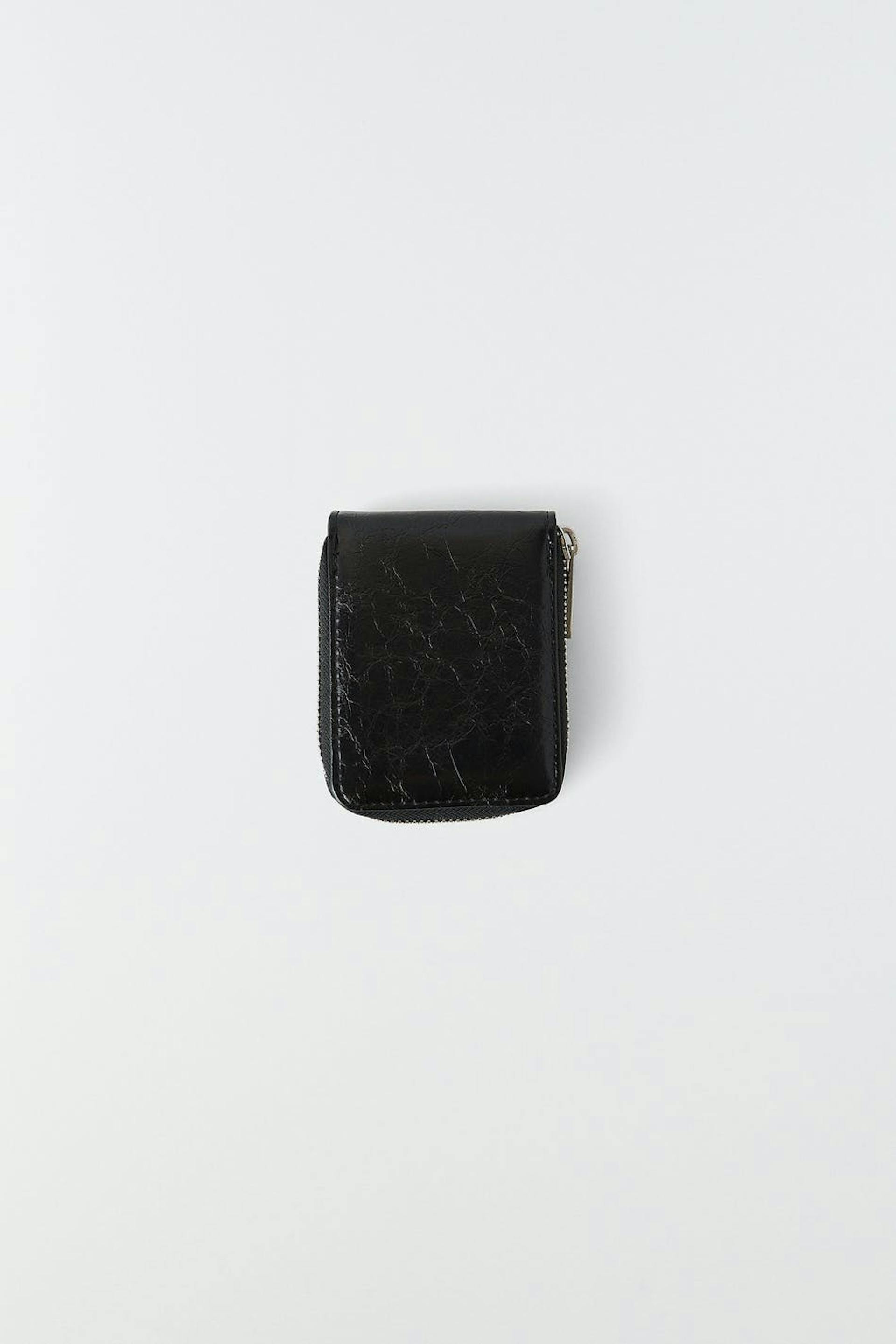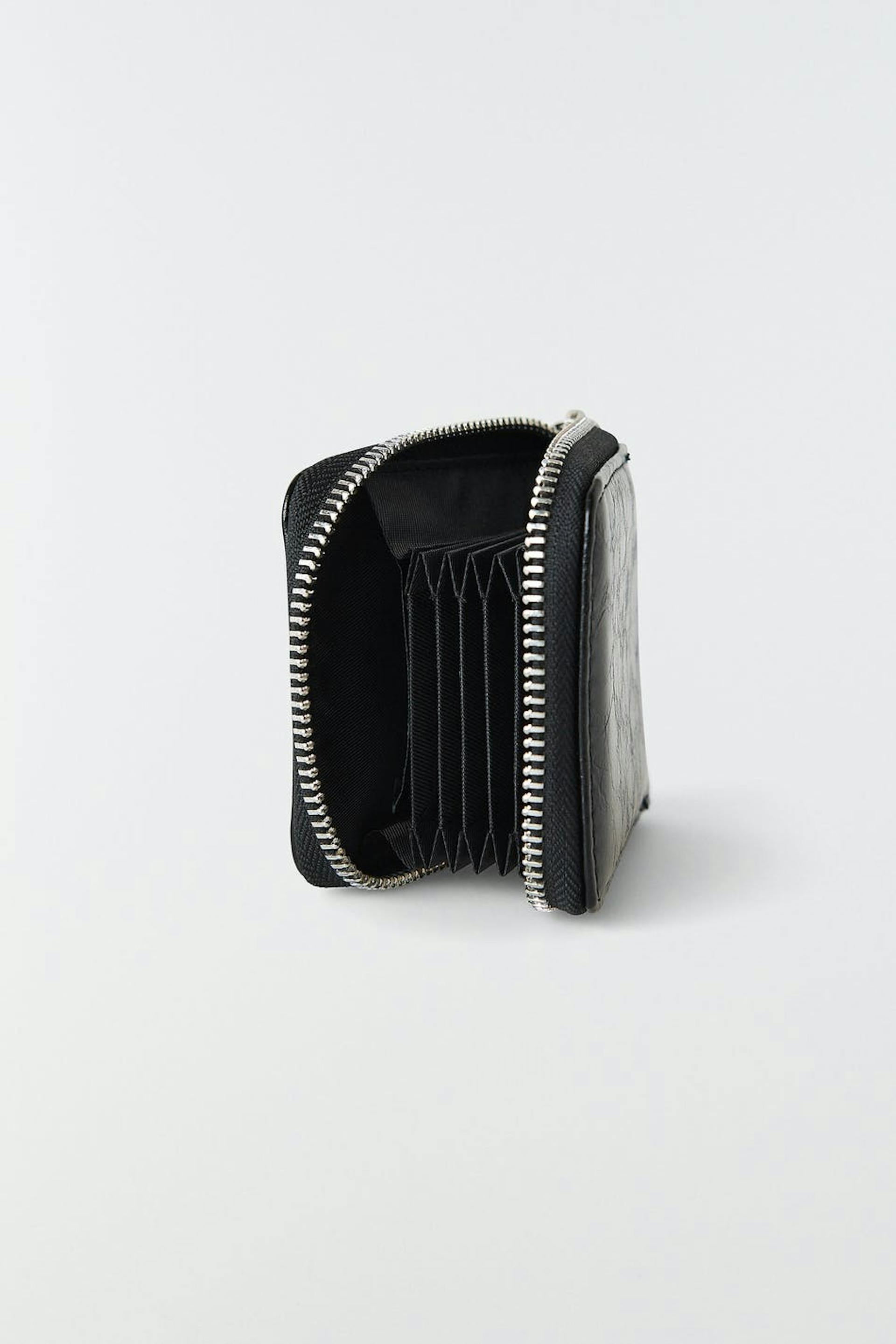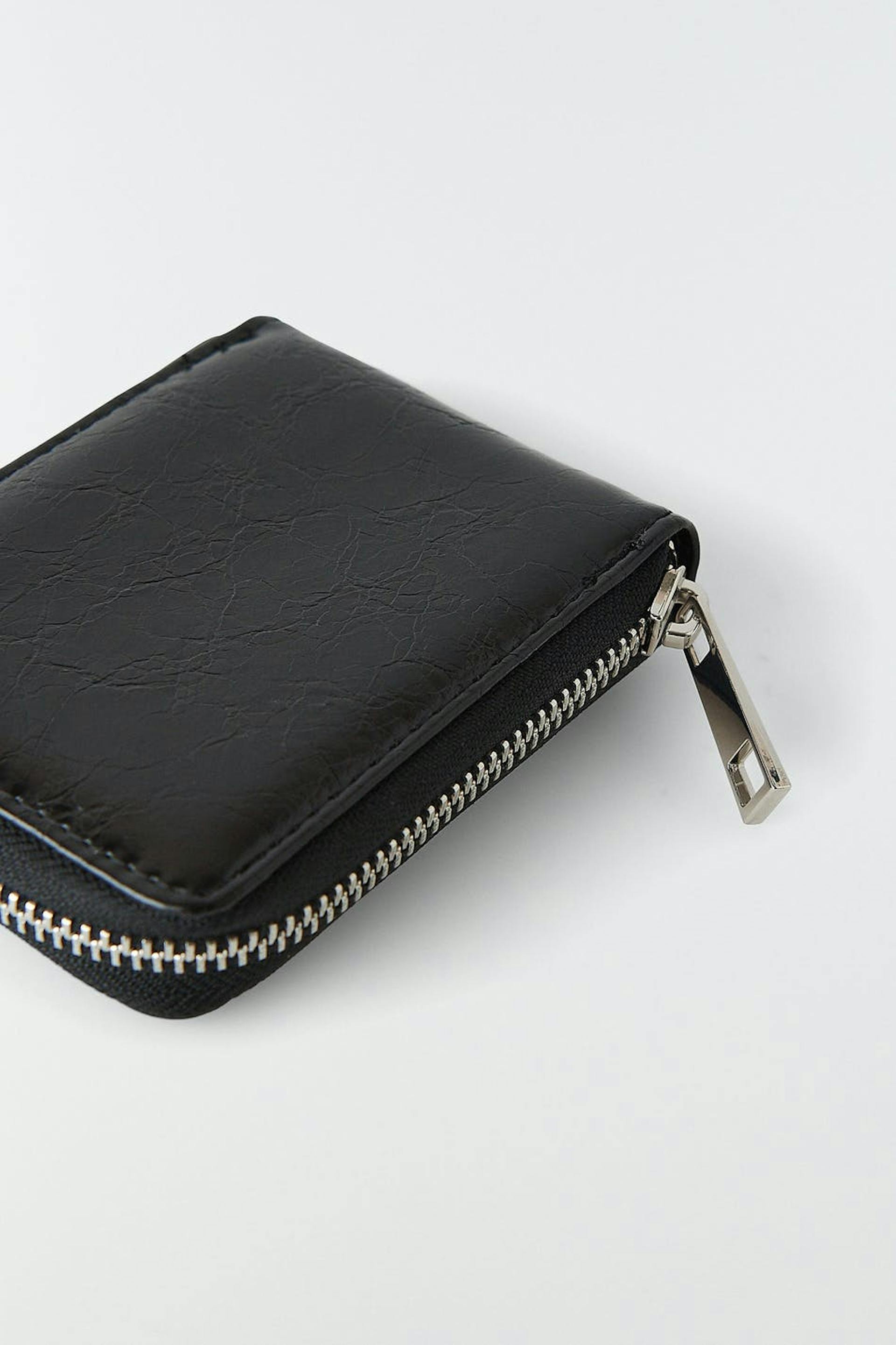 Faux leather wallet with zip closure. The wallet is black and has internal compartments.