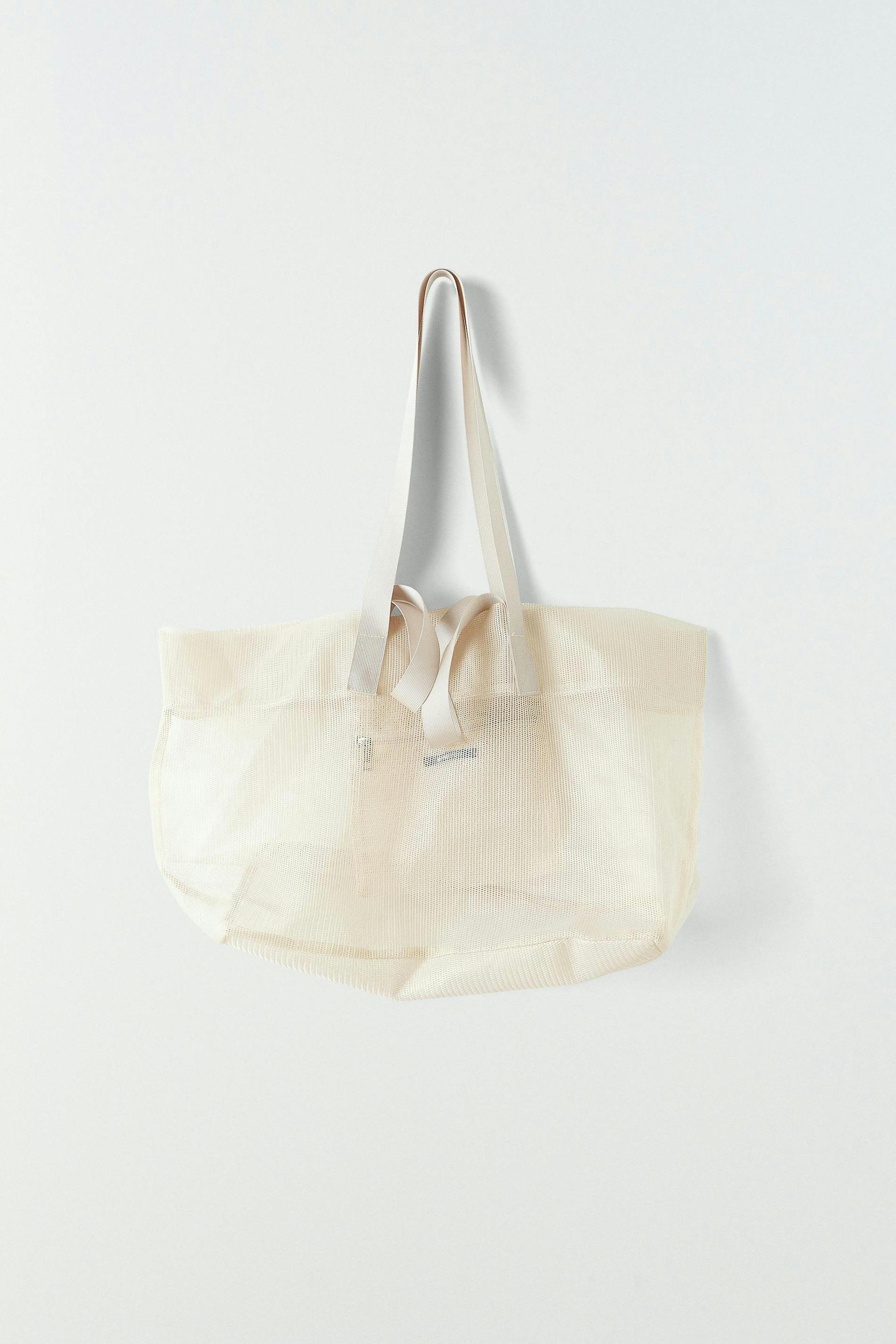 Striped shopper in mesh with big handles. The bag is beige and has a zip pocket on the inside.