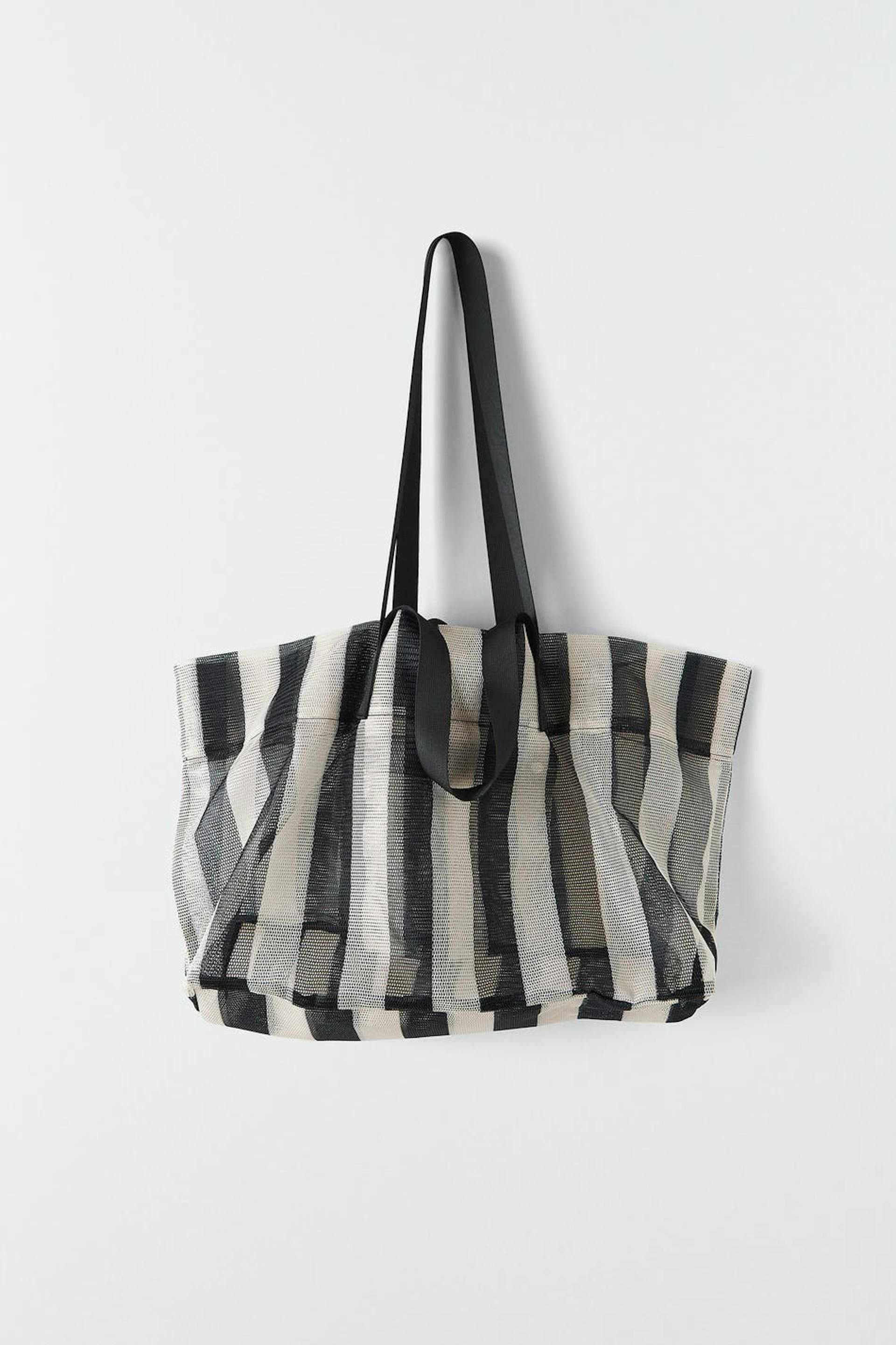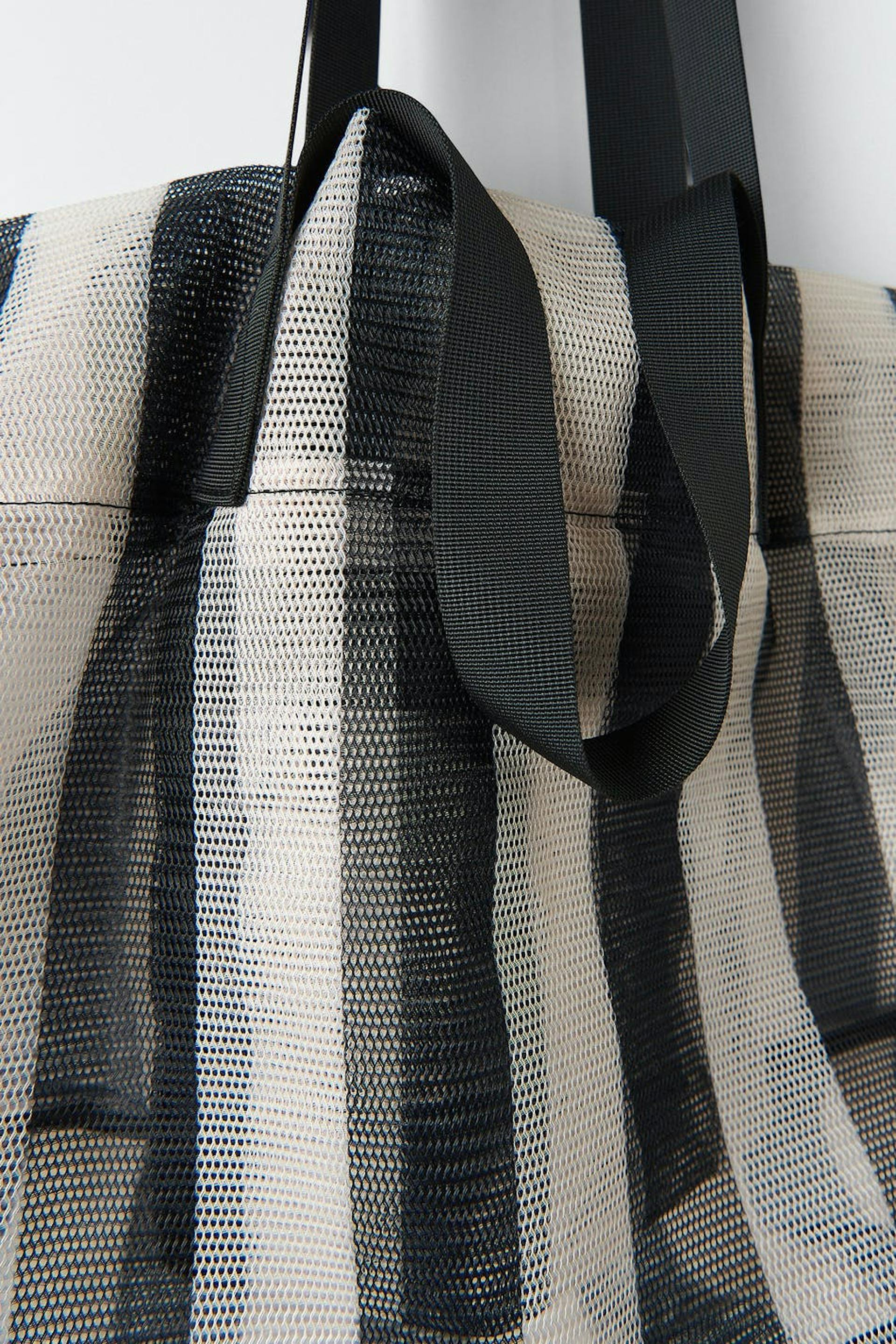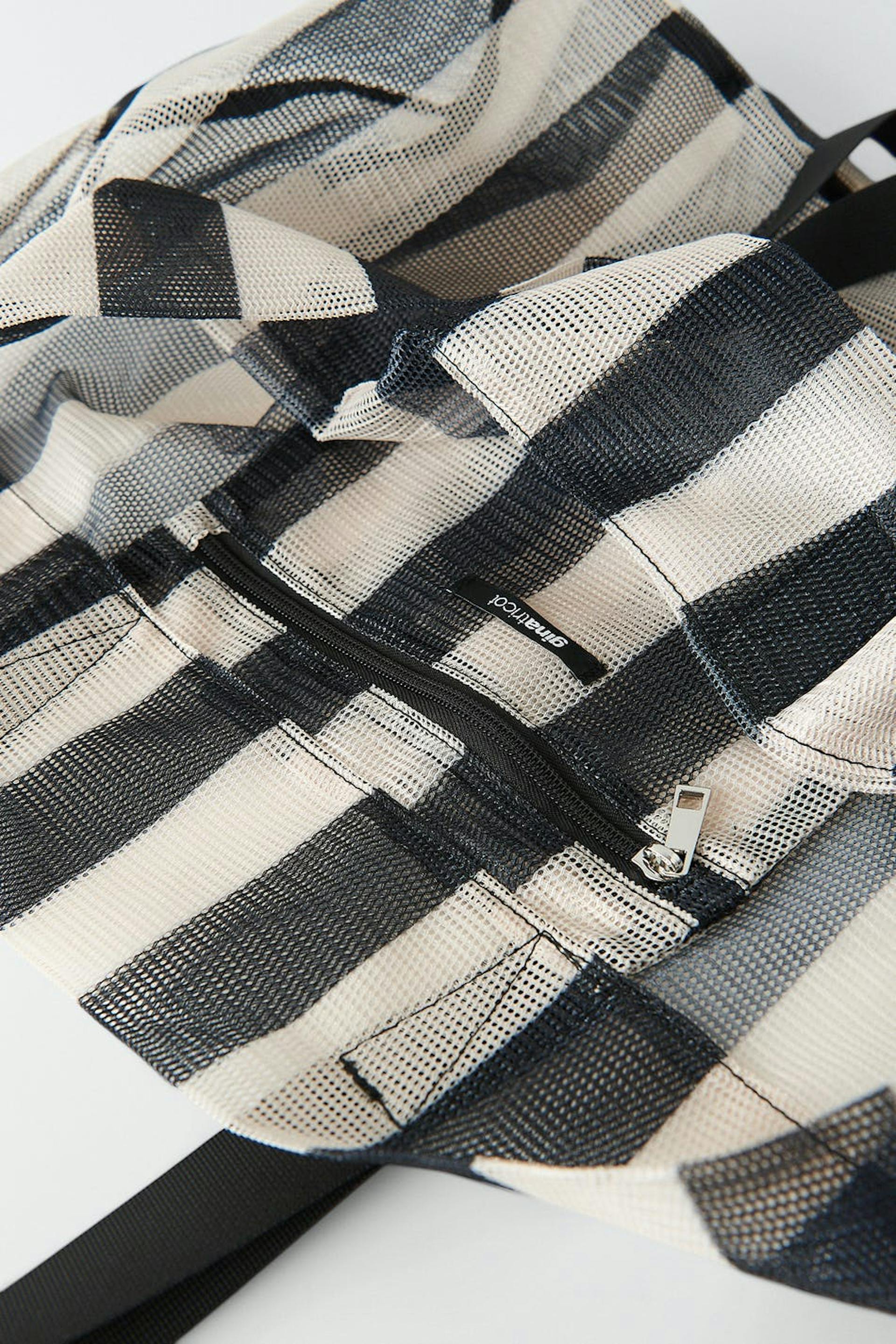 Striped bag in mesh with big handles. The bag is black and has a zip pocket on the inside.