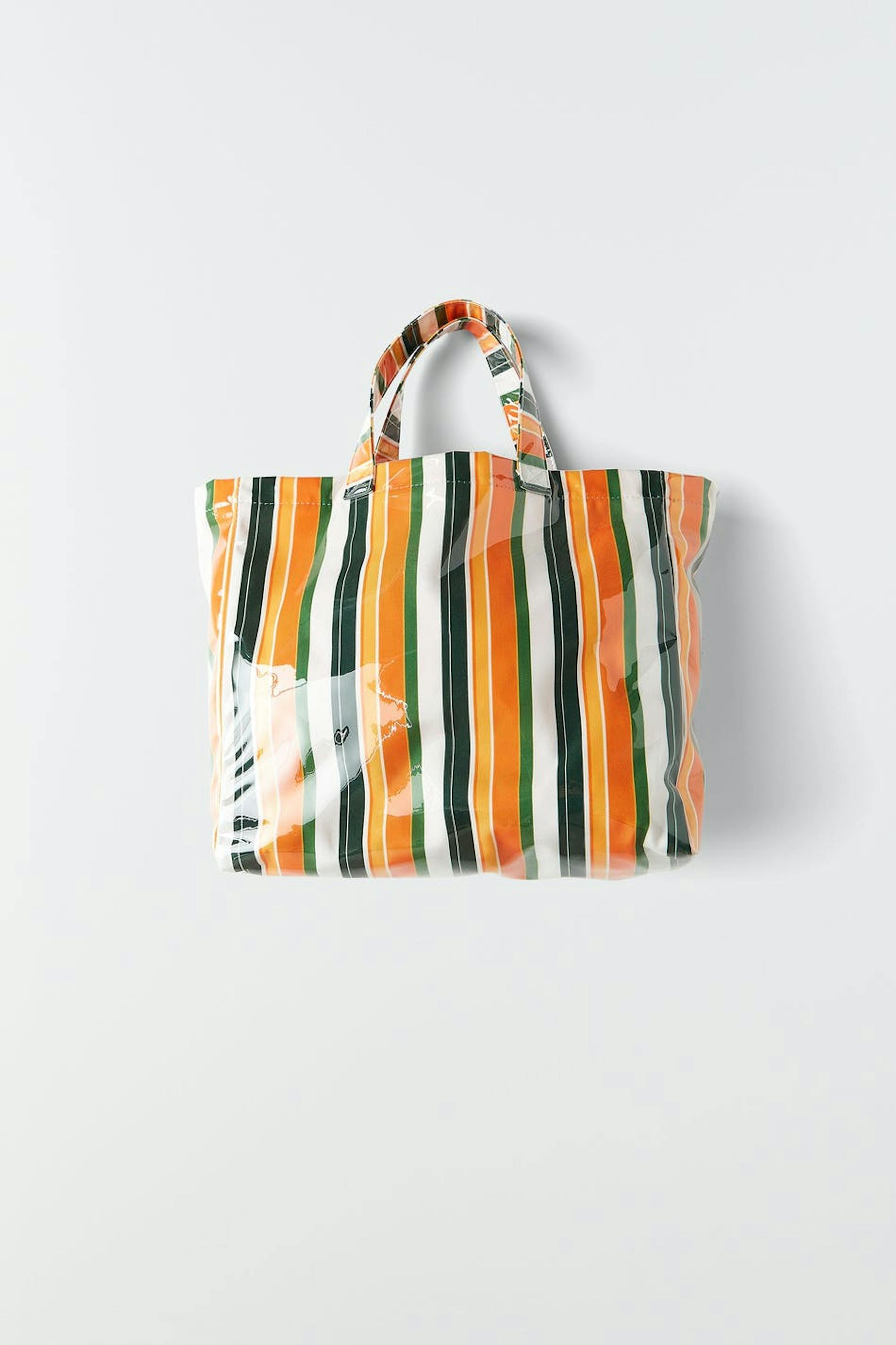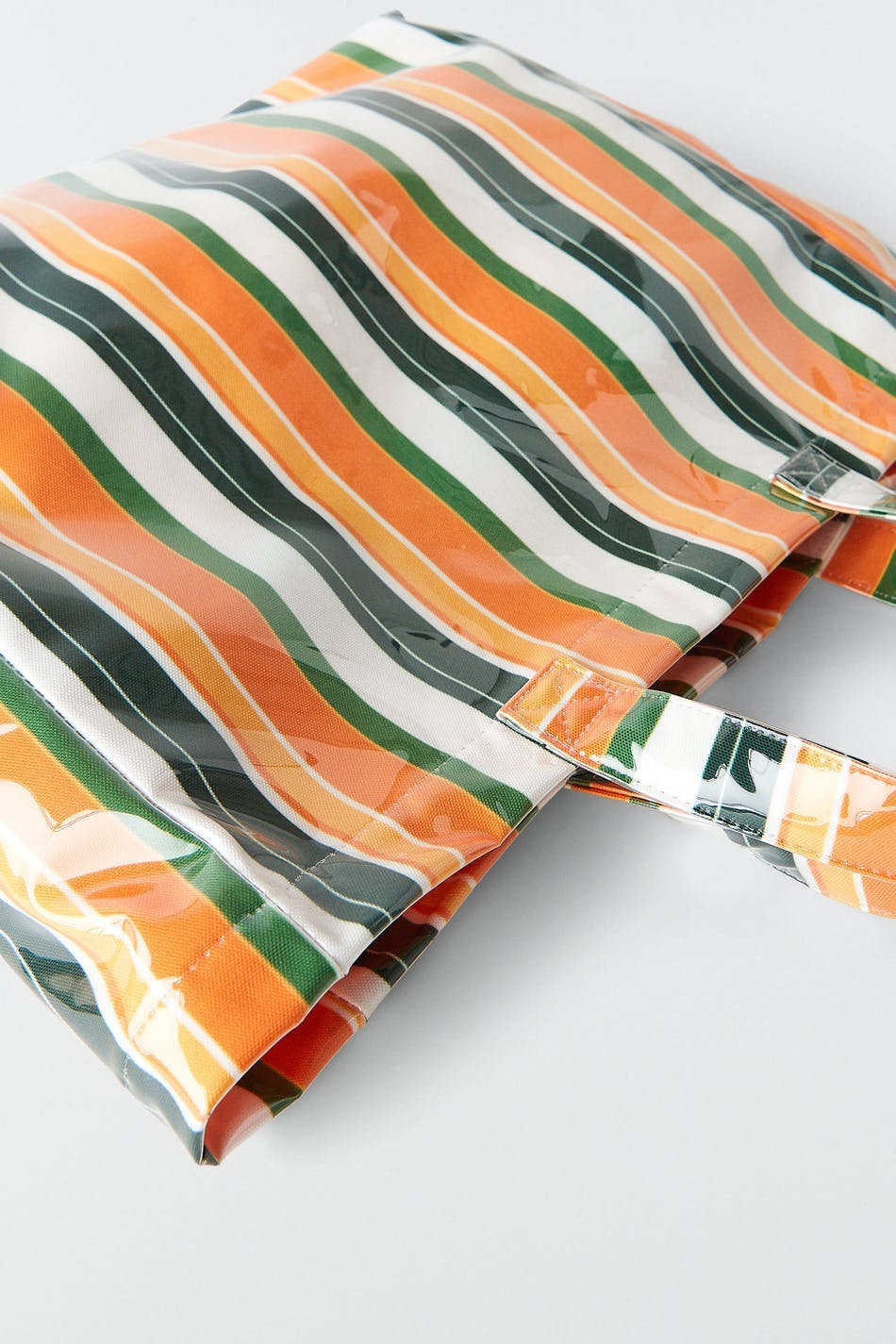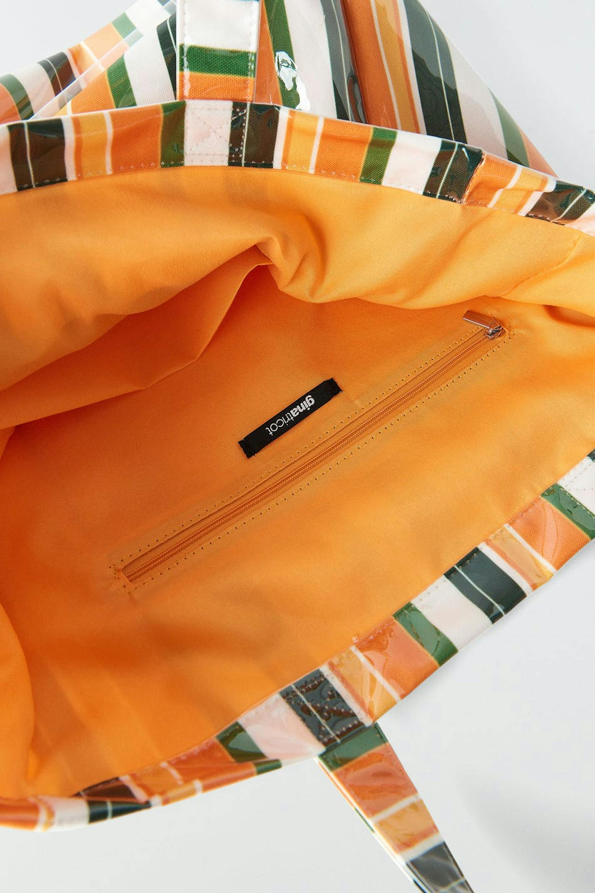 Striped bag with shopper design. The bag is orange and has a shiny material. It has two handles at the top and an inner compartment.