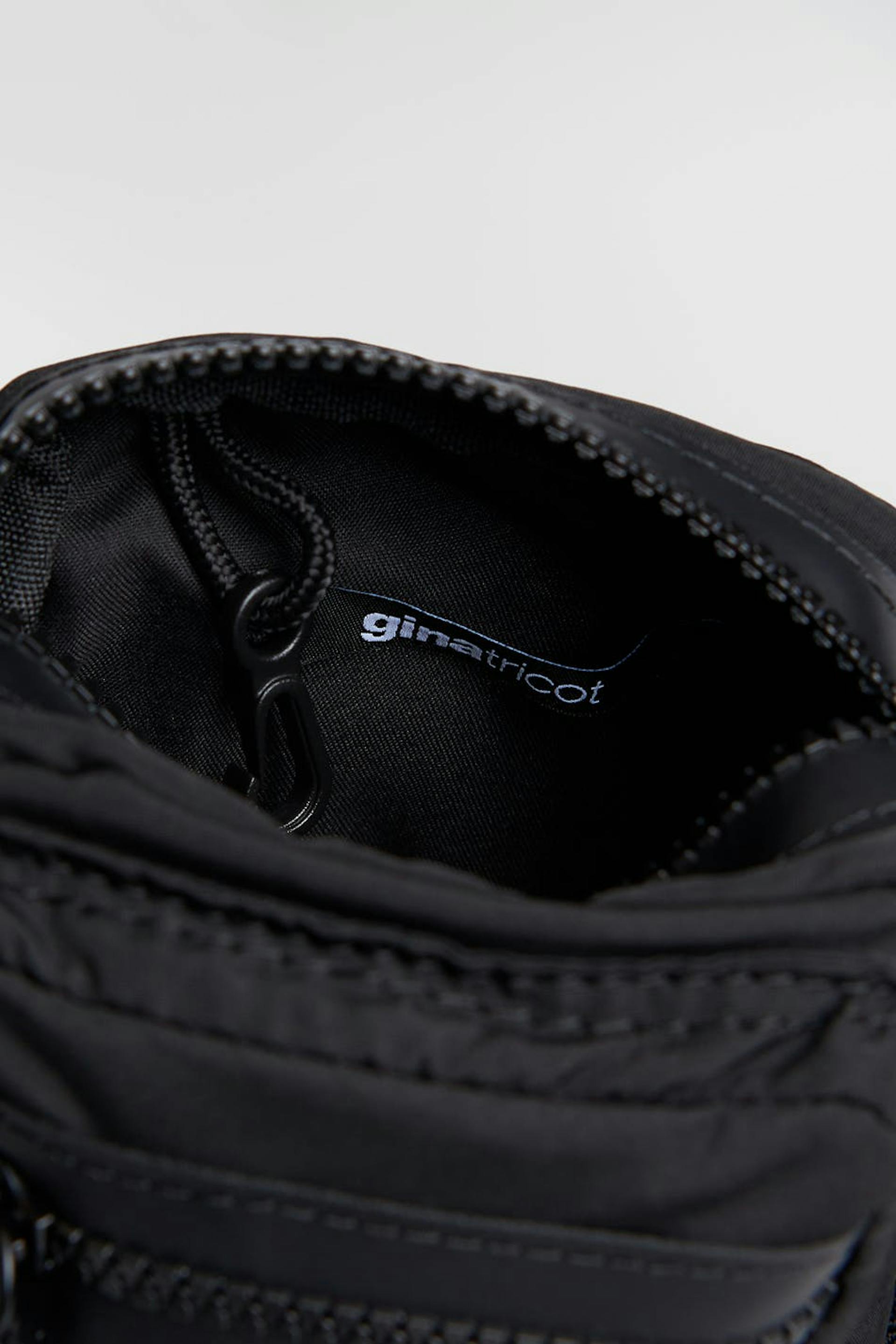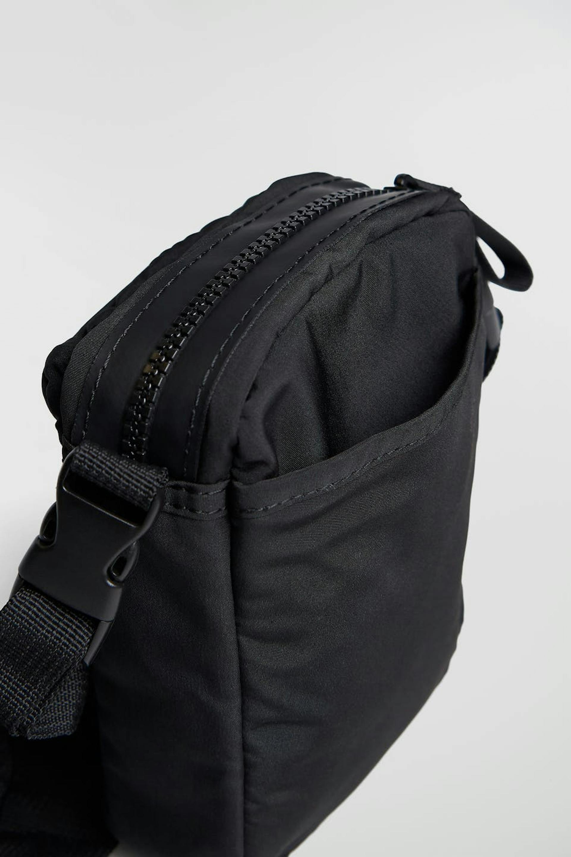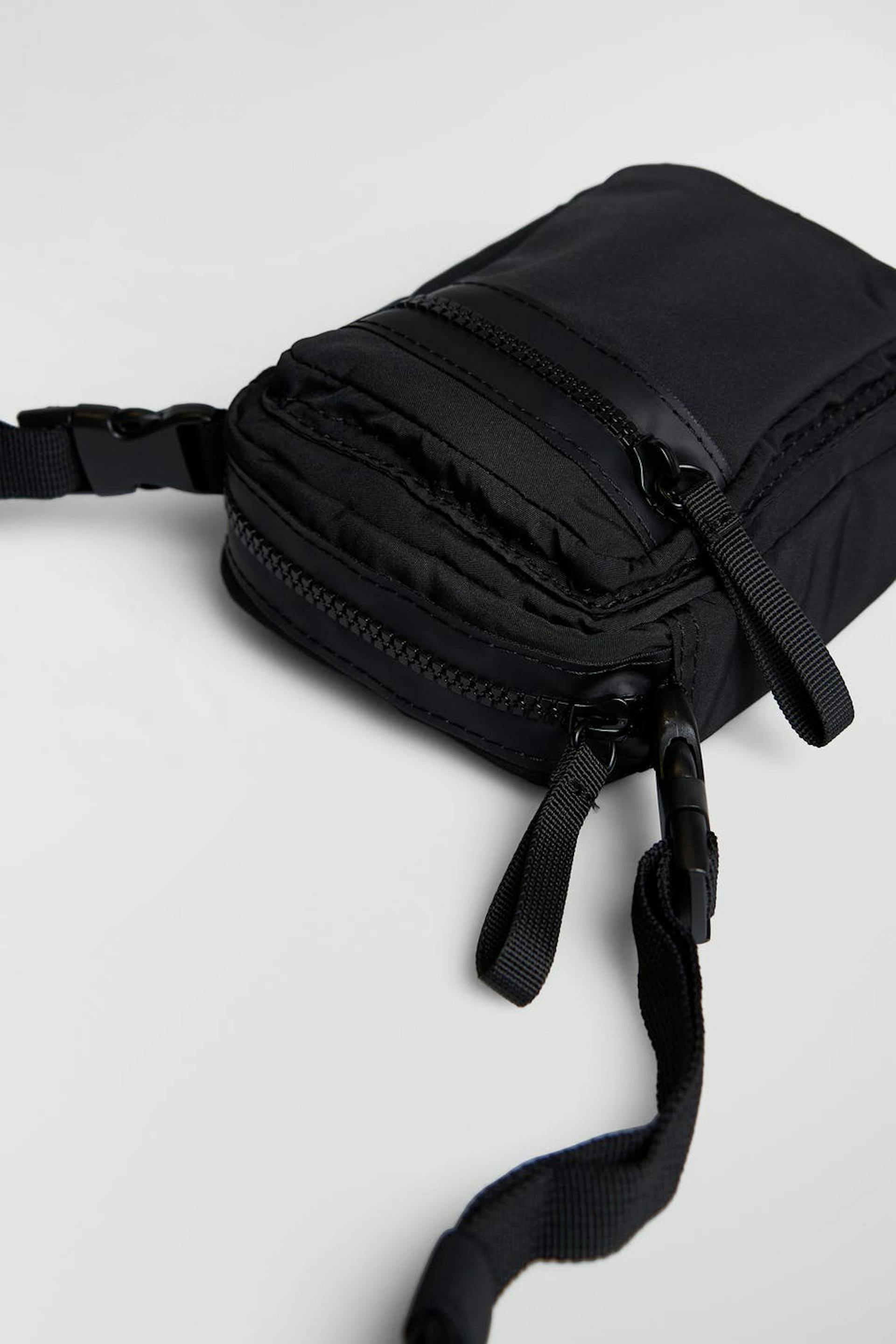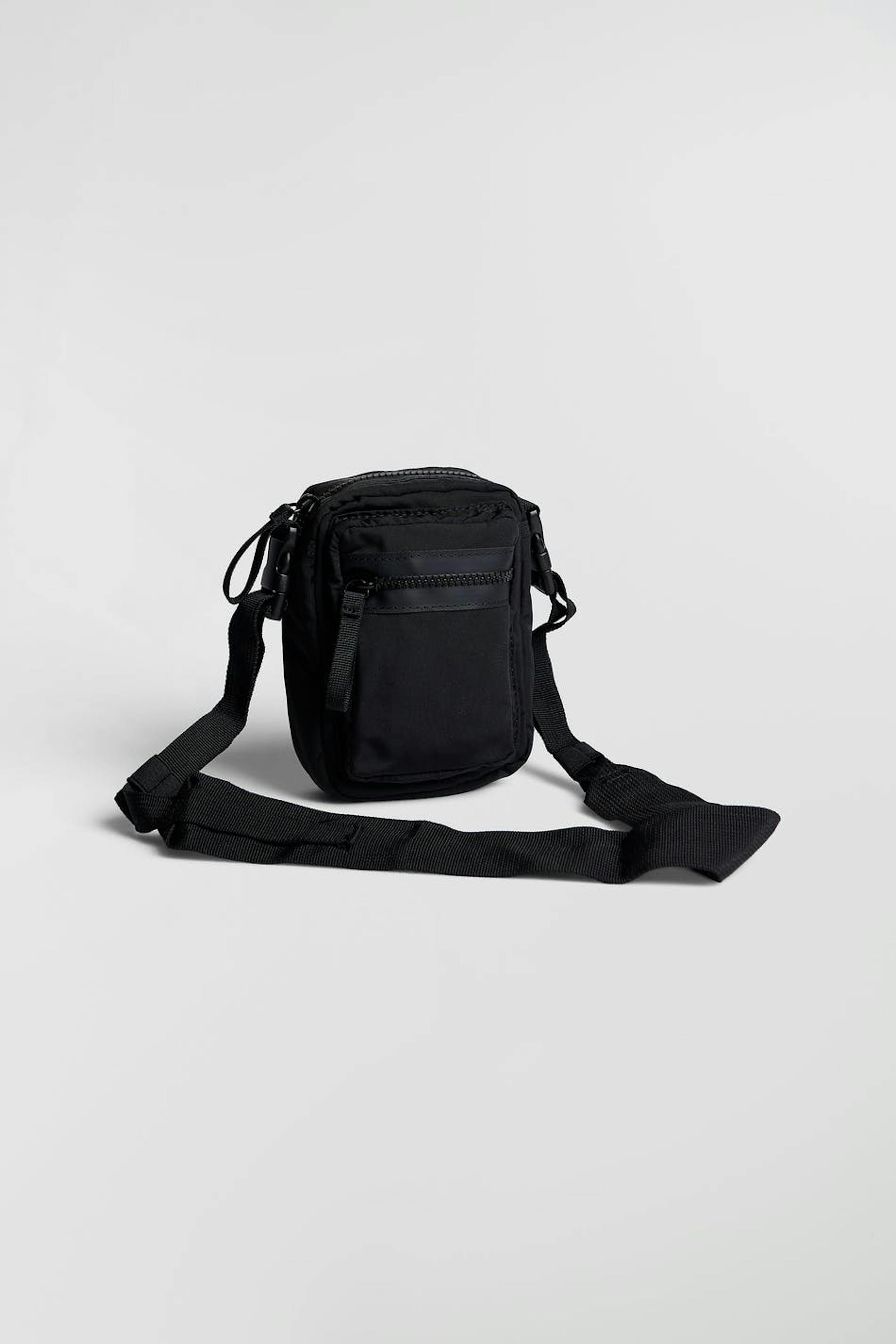 Mobile bag by Gina Lab with multiple outer compartments. The bag is black and has a material in recycled polyester coloured by We aRe SpinDye®. It has a detachable shoulder strap with buckles, a zip closure and a lobster clasp closure at the top.