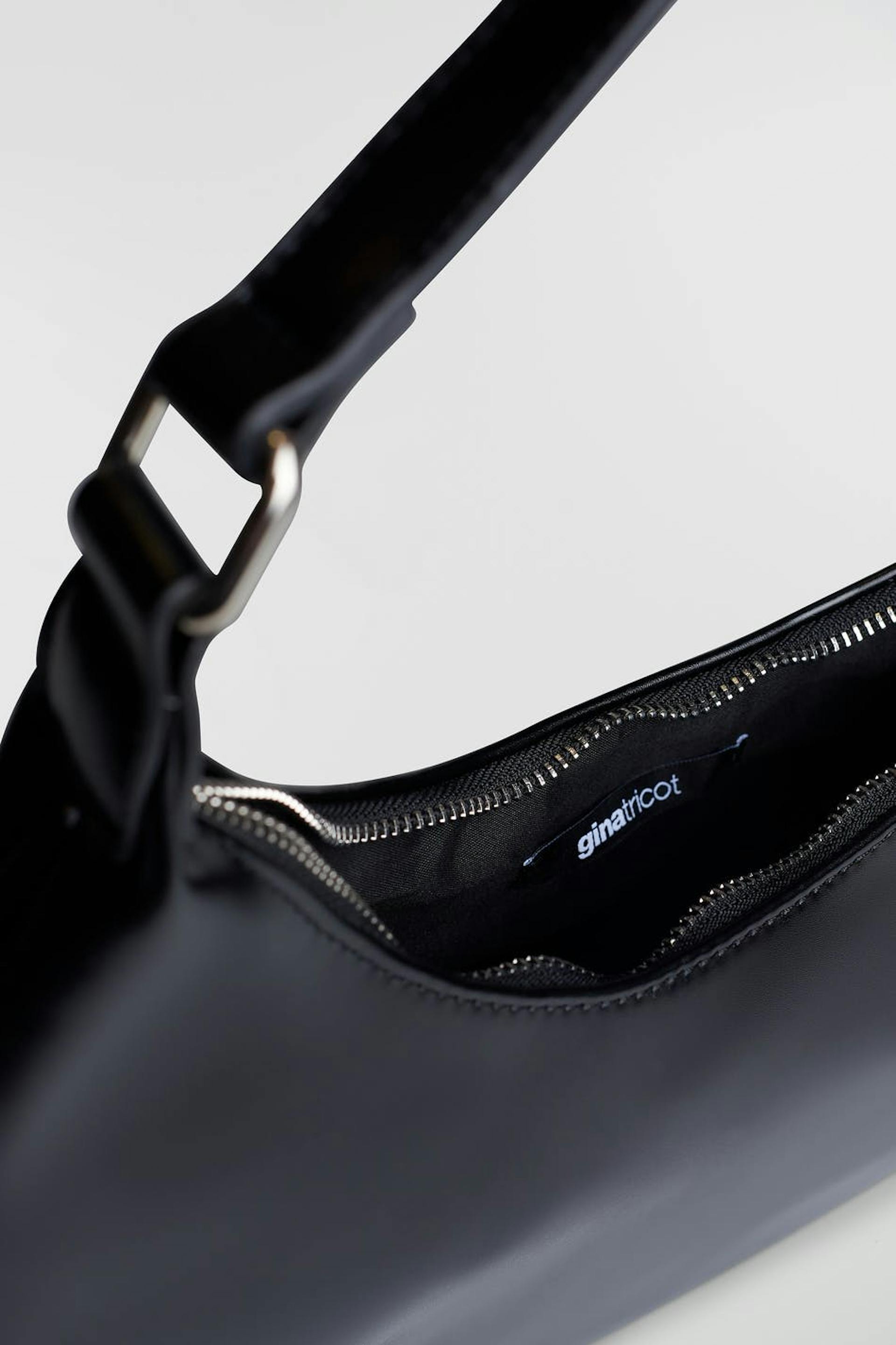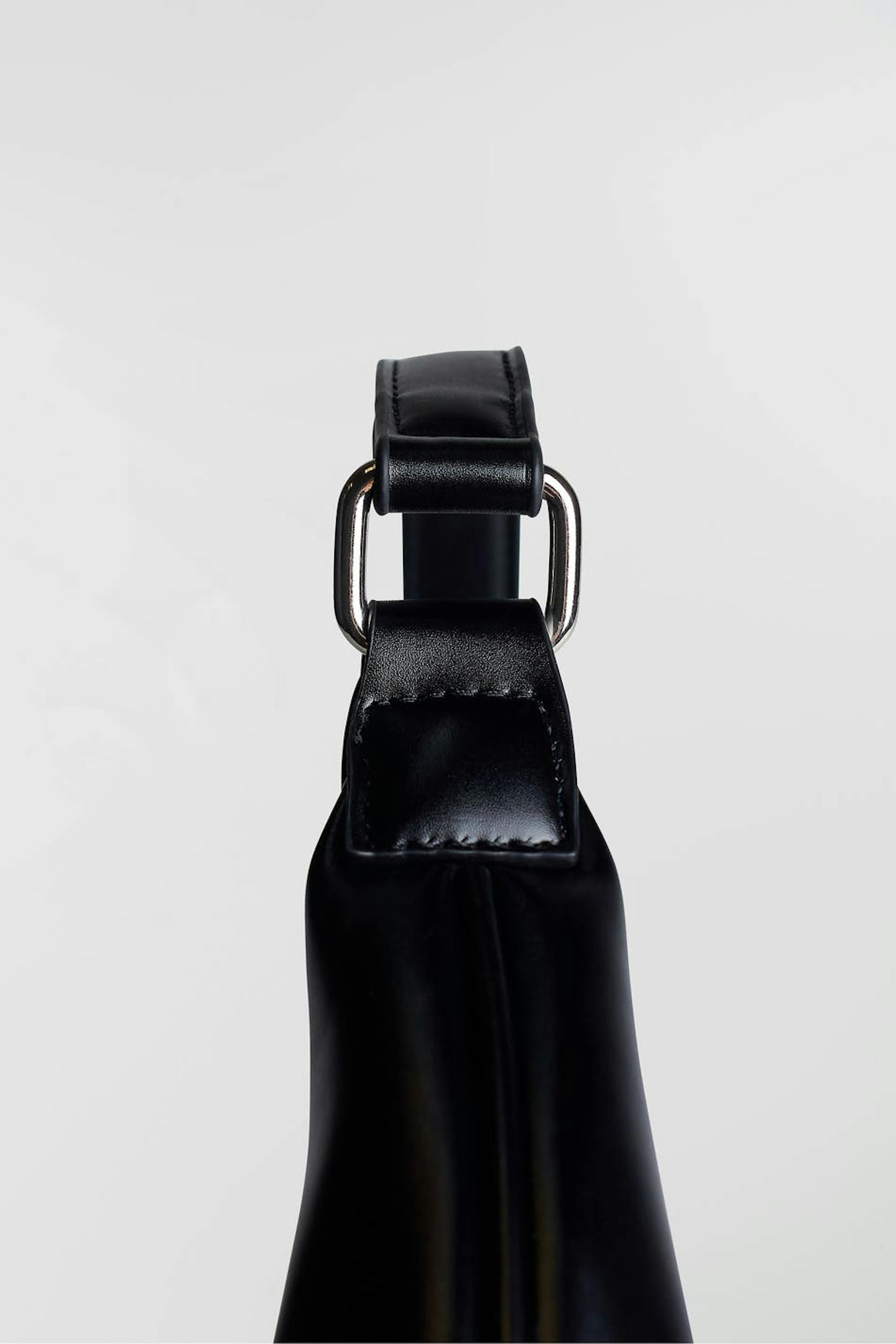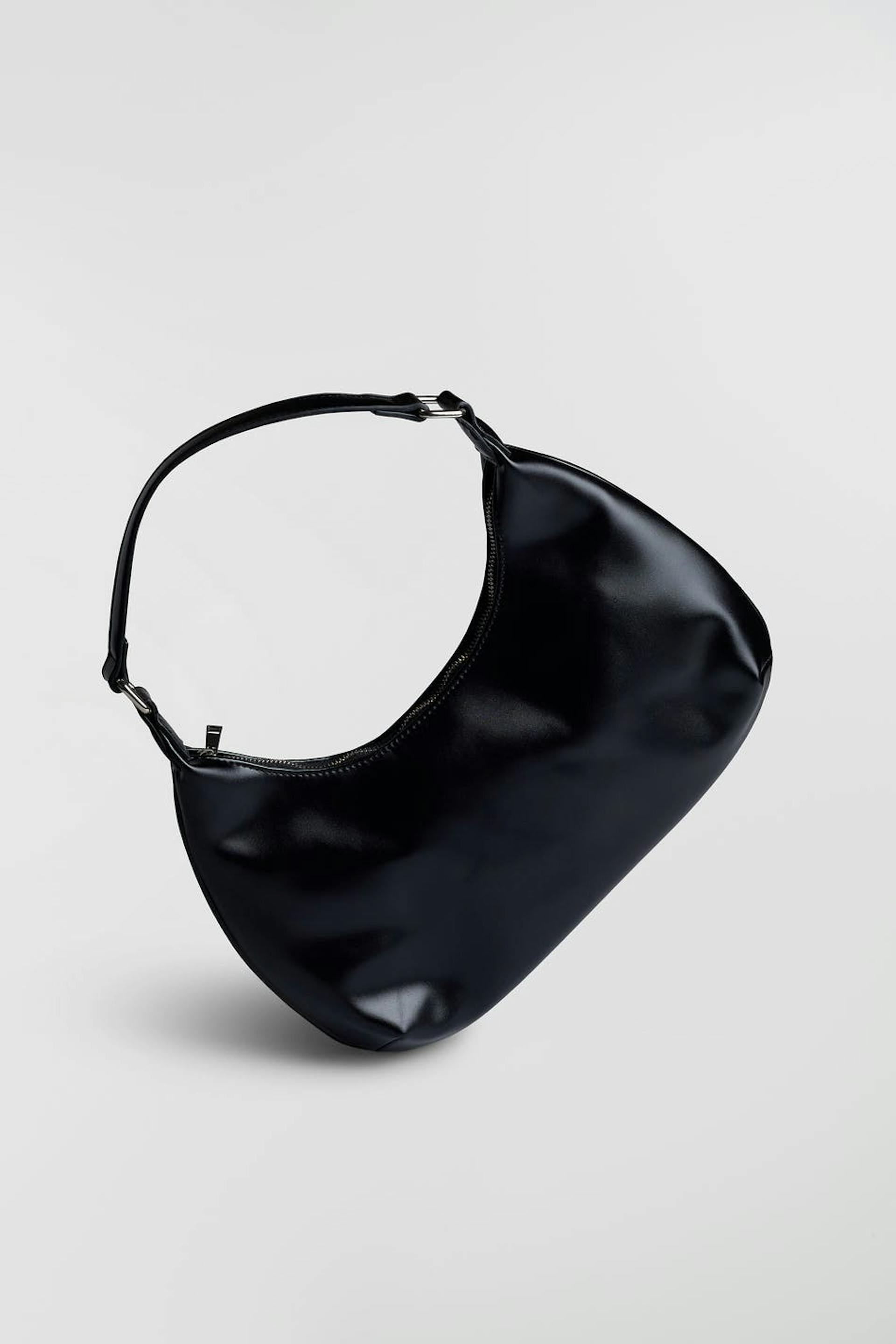 Bag with a short shoulder strap. The bag is black and has a zip on top.