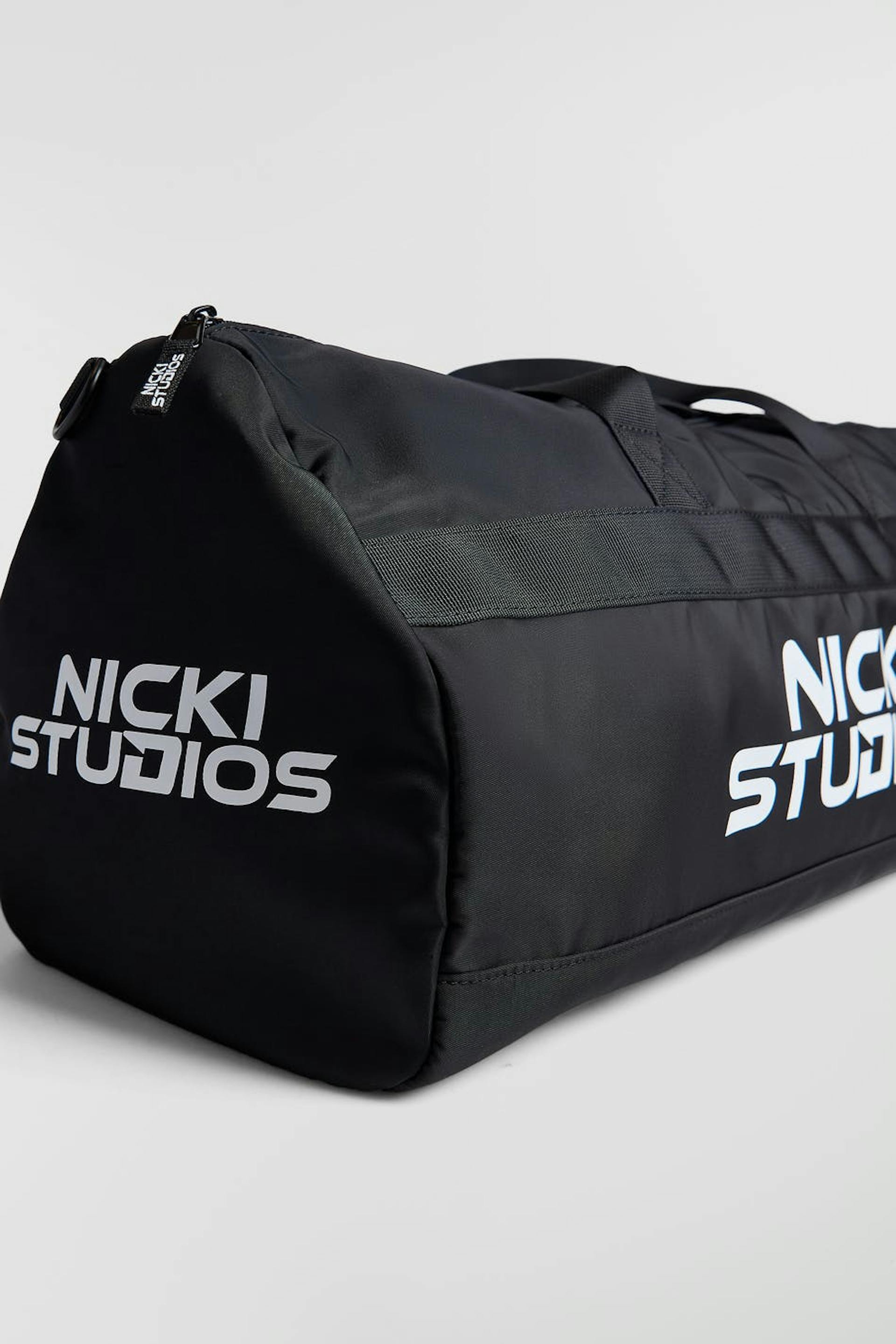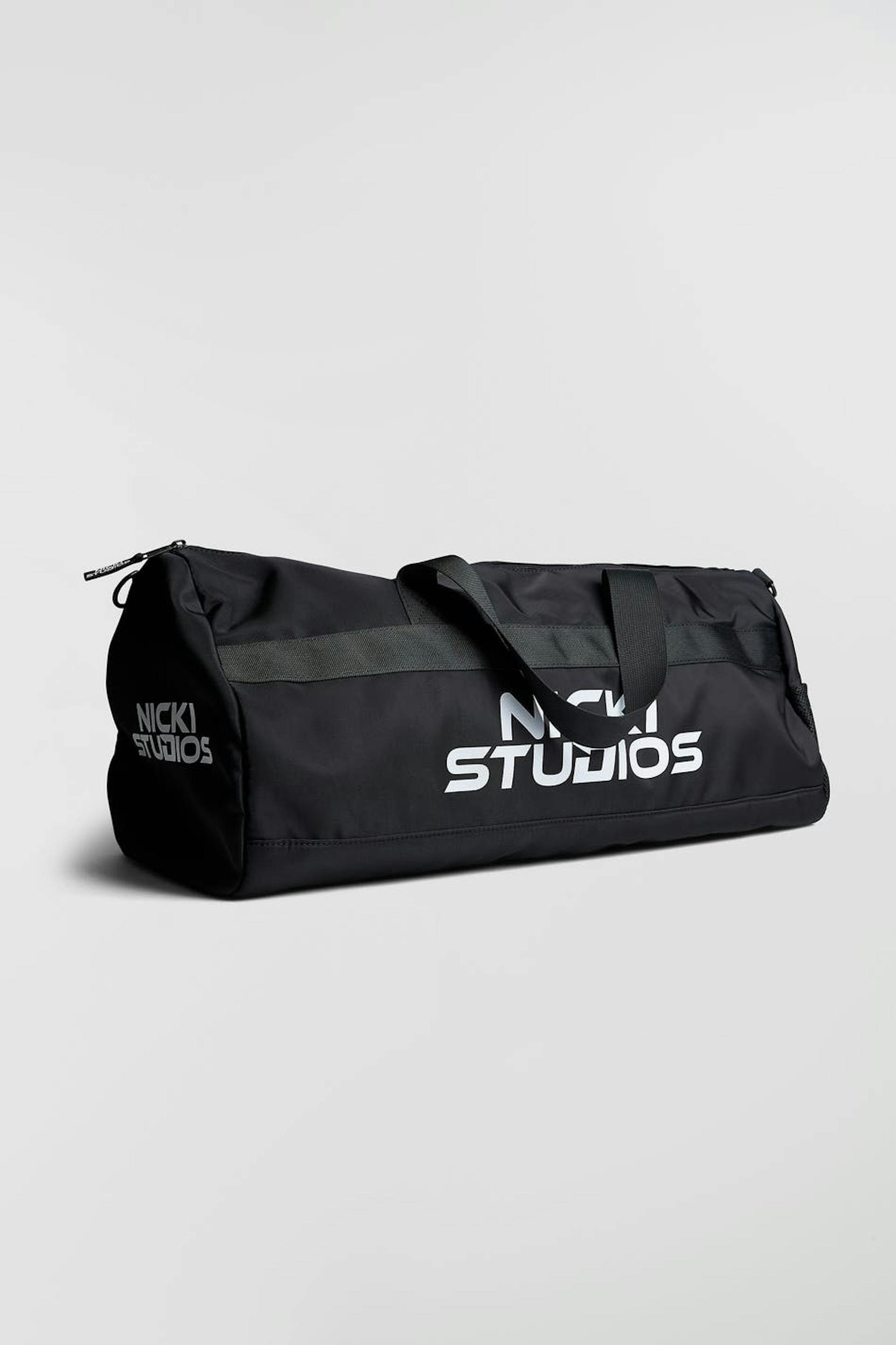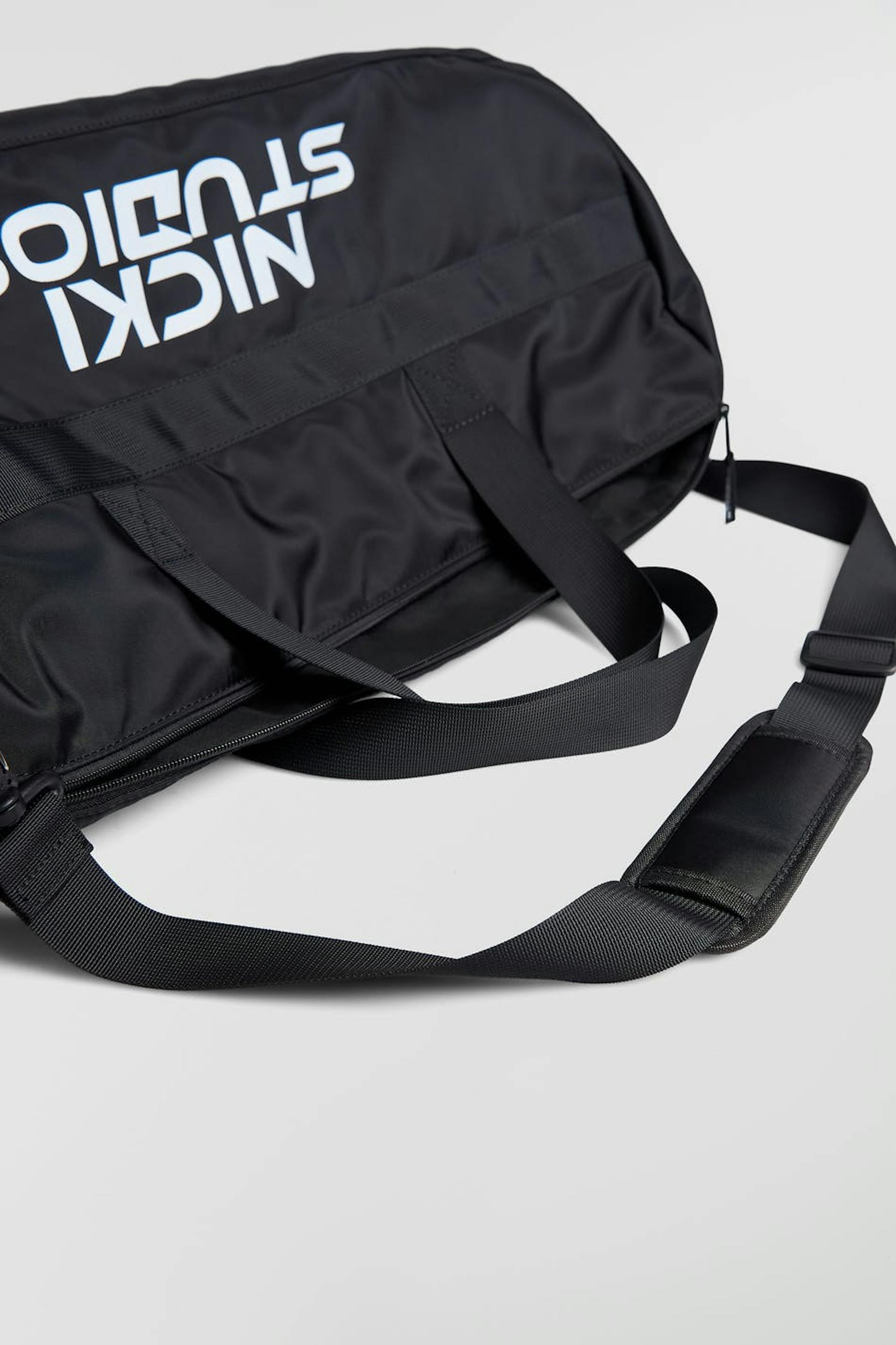 Nicki Studios X Gina Tricot. Padded duffle bag with big main compartment with zip and detachable shoulder strap. The bag is black and has a big brand logo at the front. It has handles at the top and inner compartments.