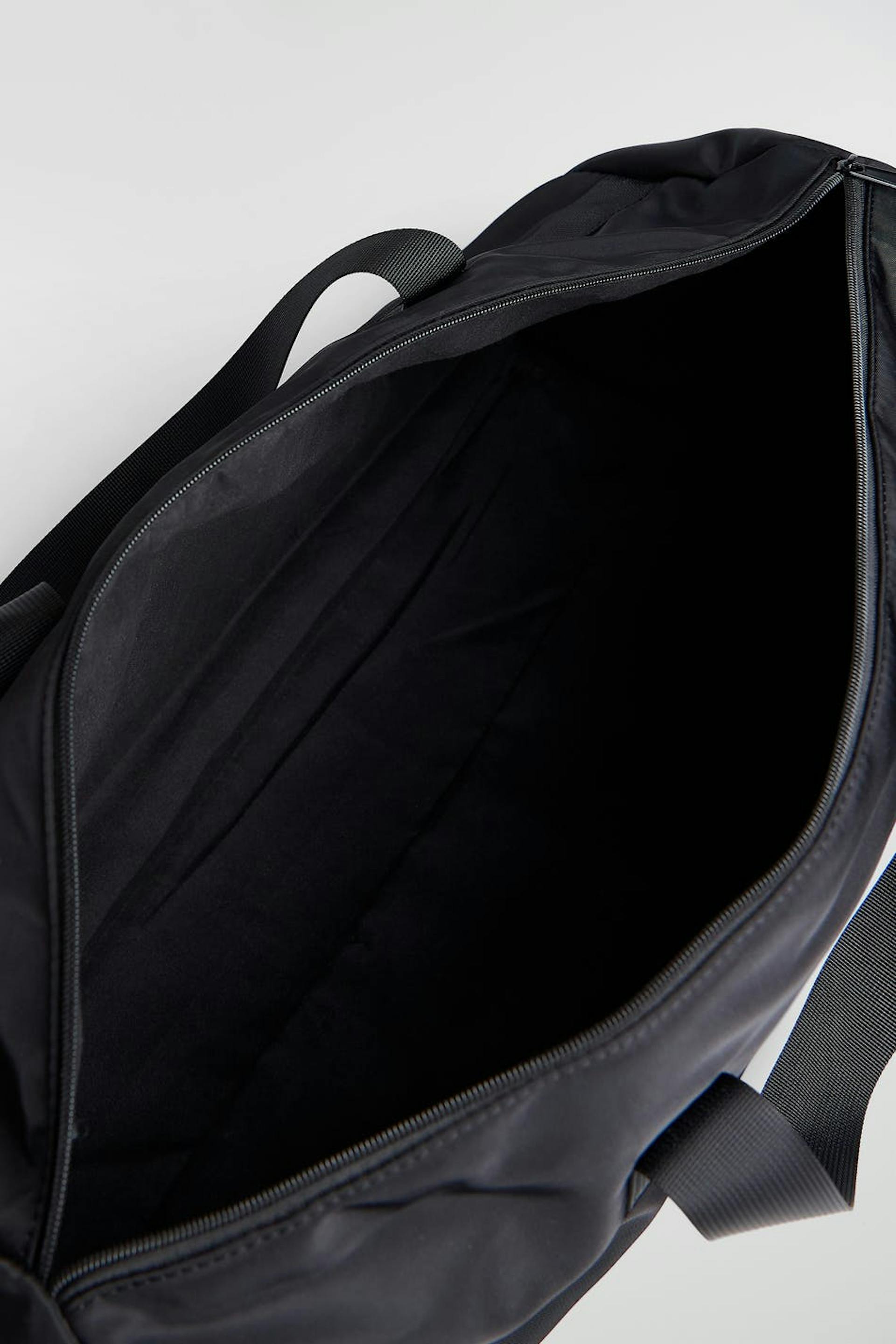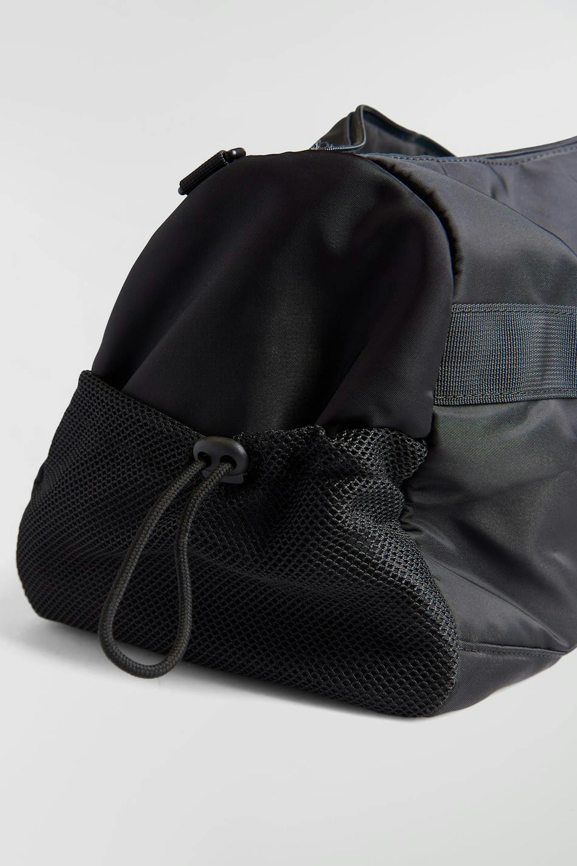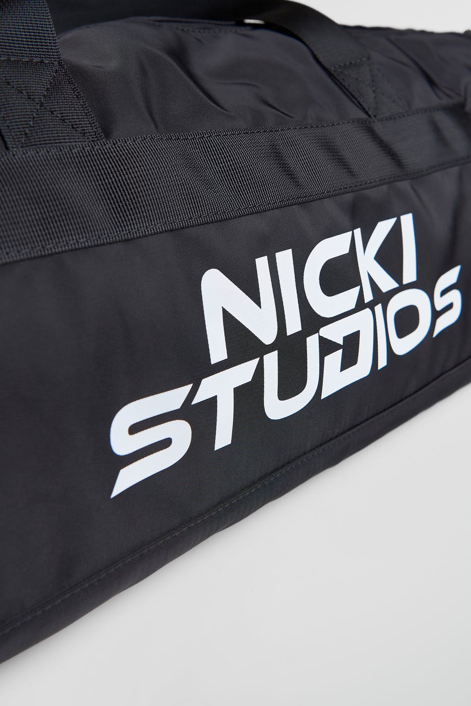 Nicki Studios X Gina Tricot. Padded duffle bag with big main compartment with zip and detachable shoulder strap. The bag is black and has a big brand logo at the front. It has handles at the top and inner compartments.