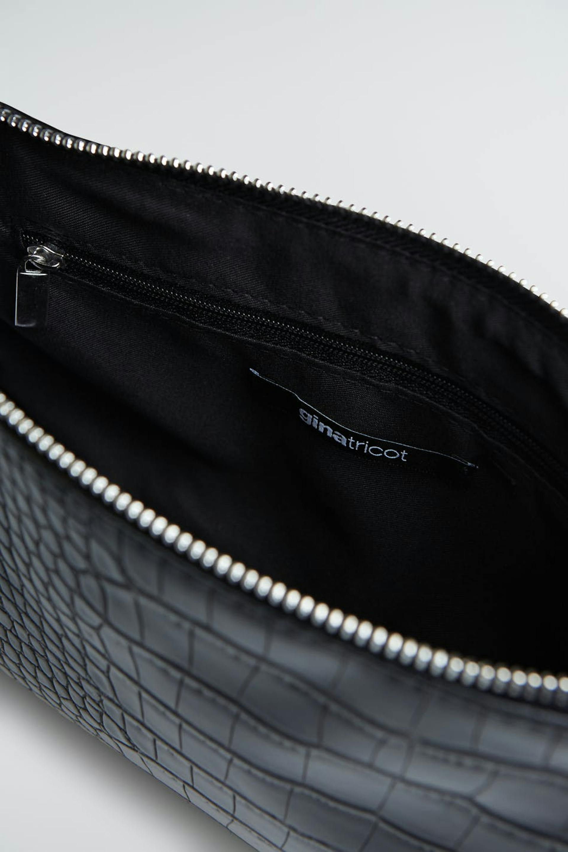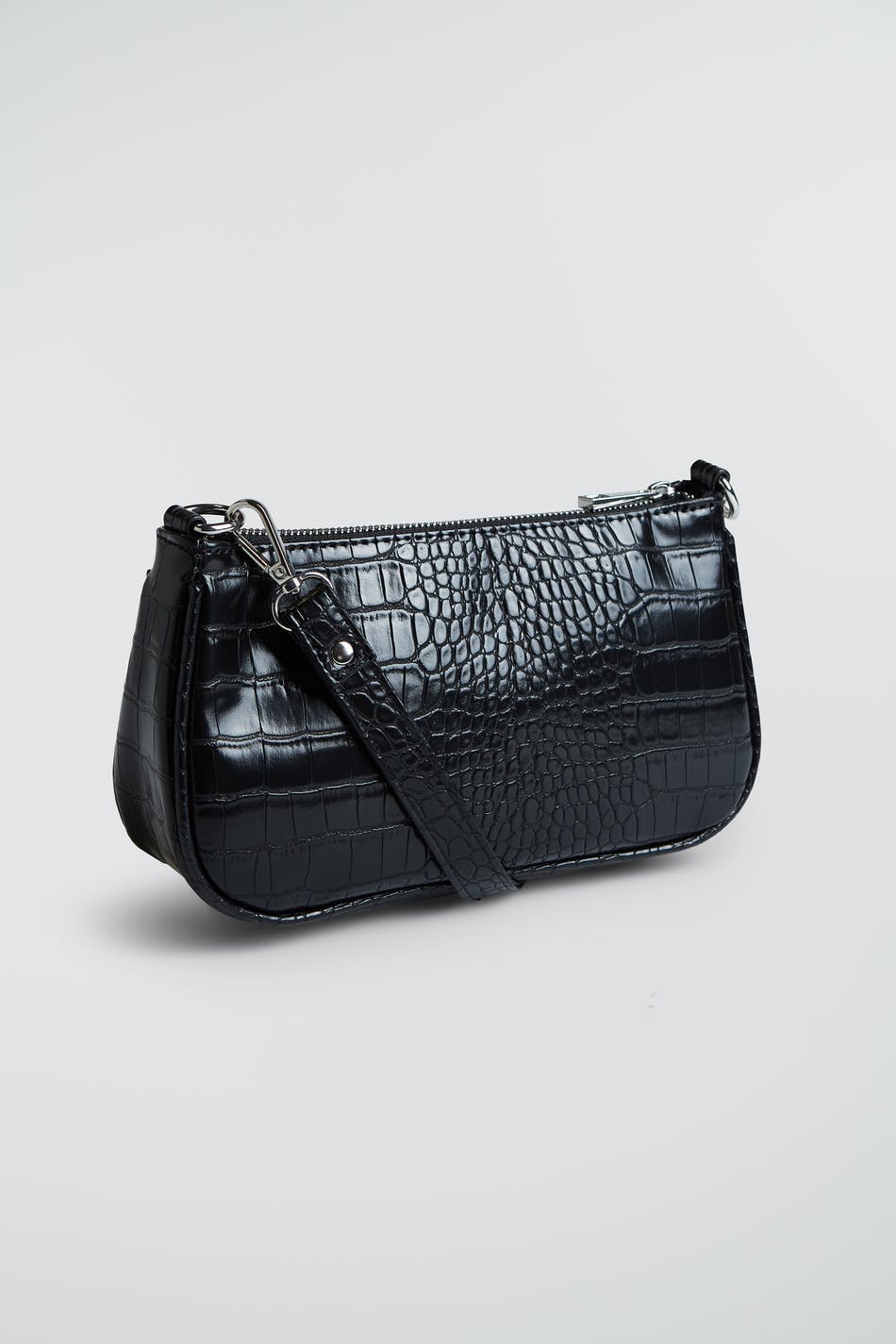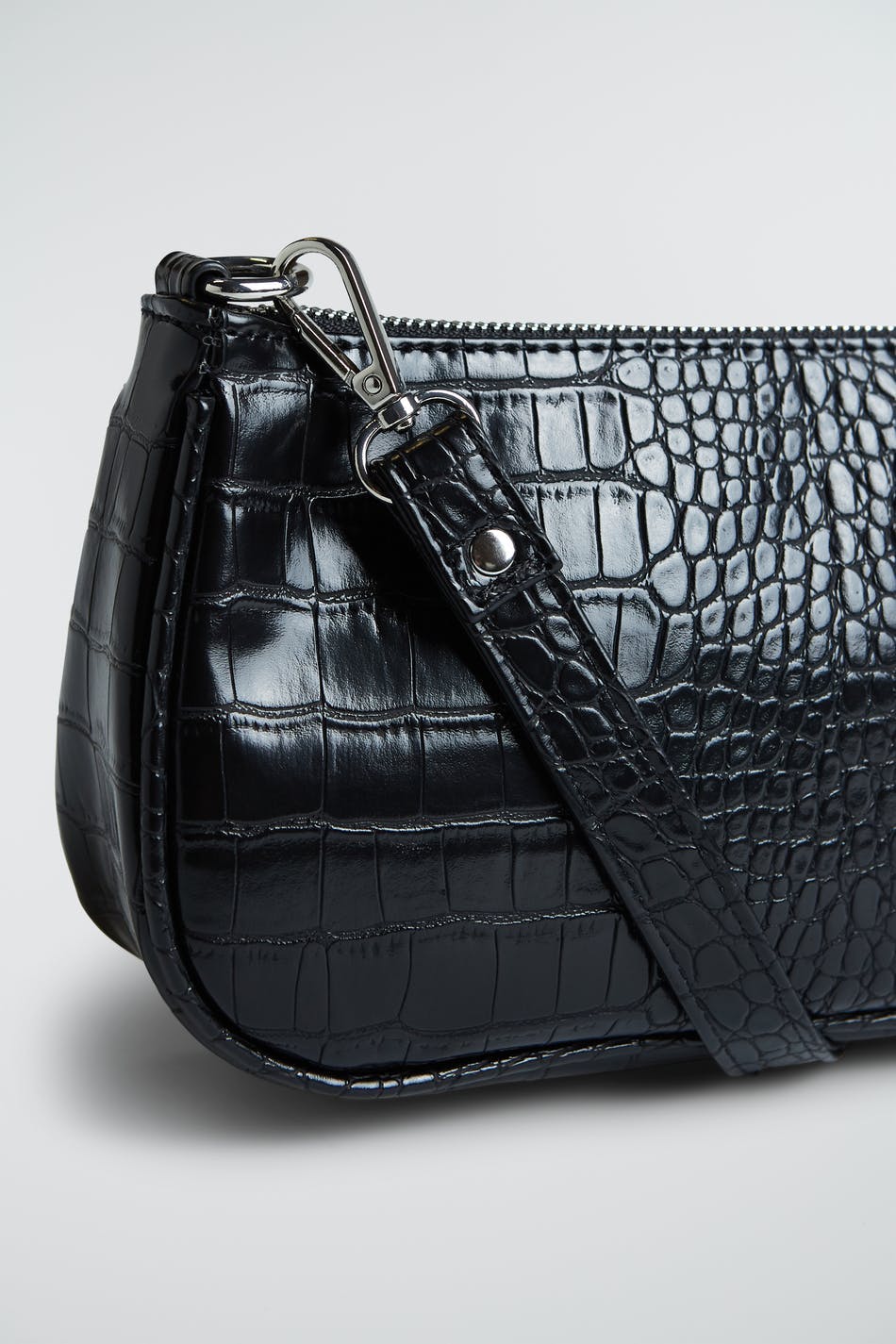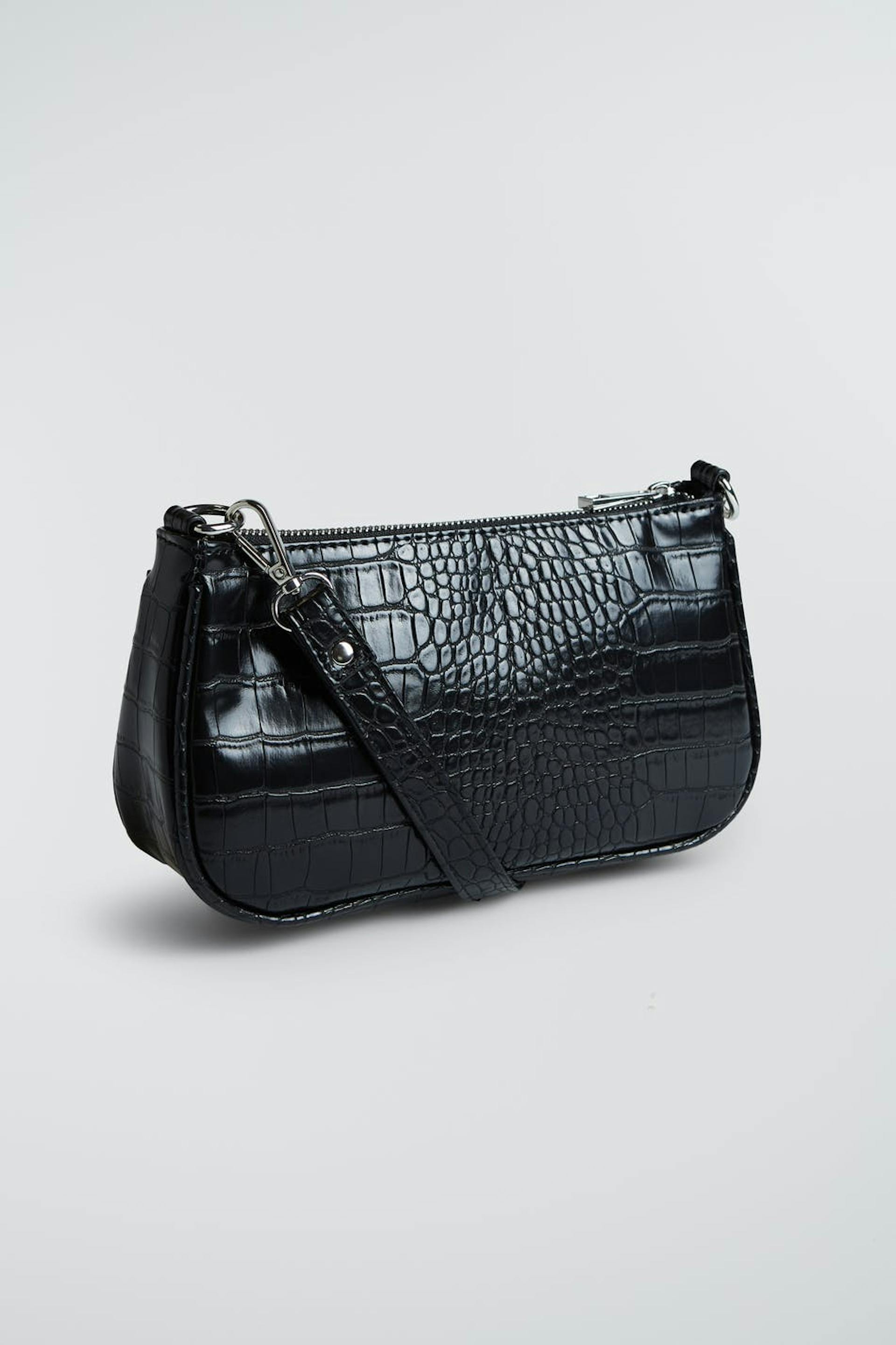 Baguette bag with a crocodile pattern and a short, detachable shoulder strap. The bag is black and has a zip on top. It has a small interior pocket.
