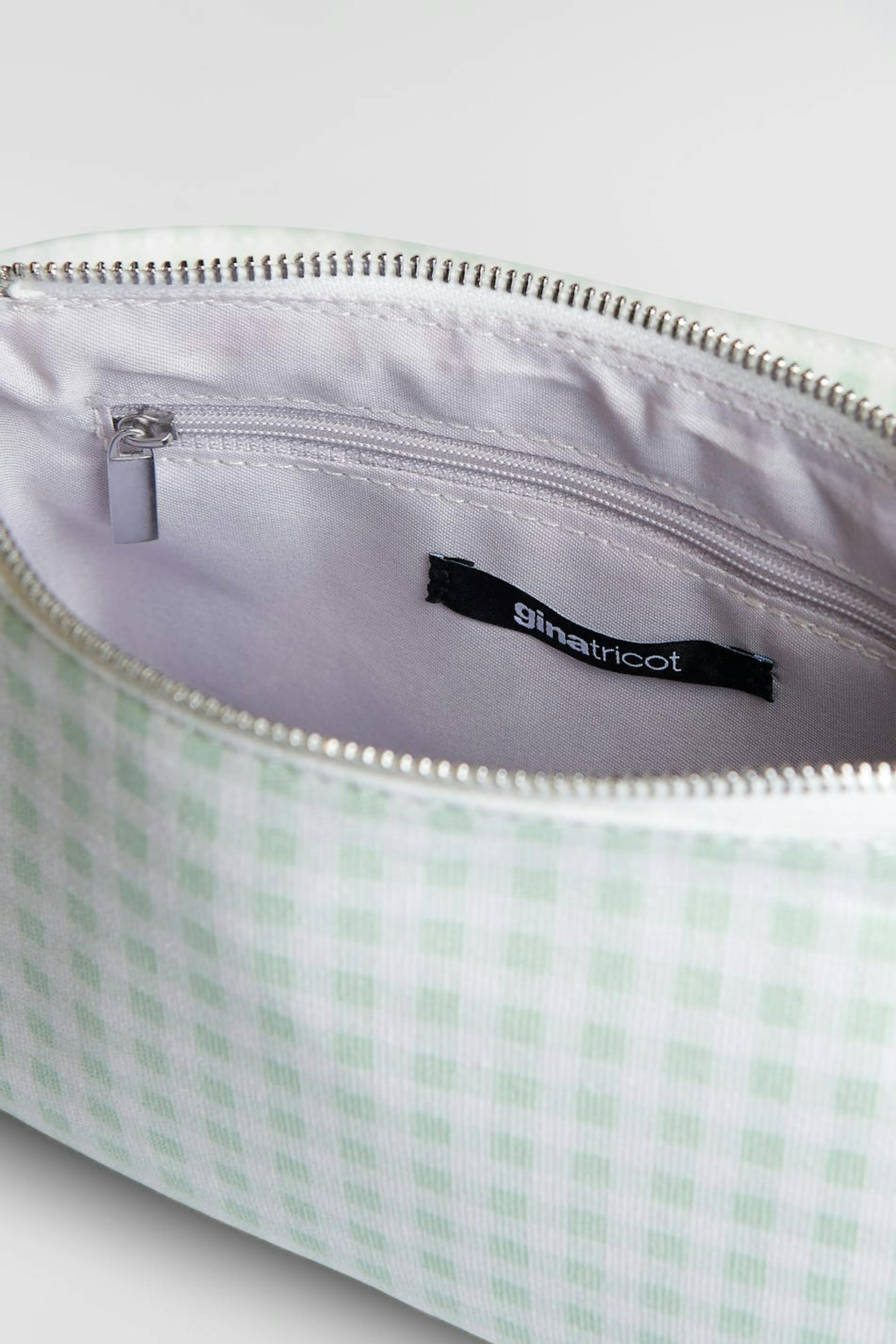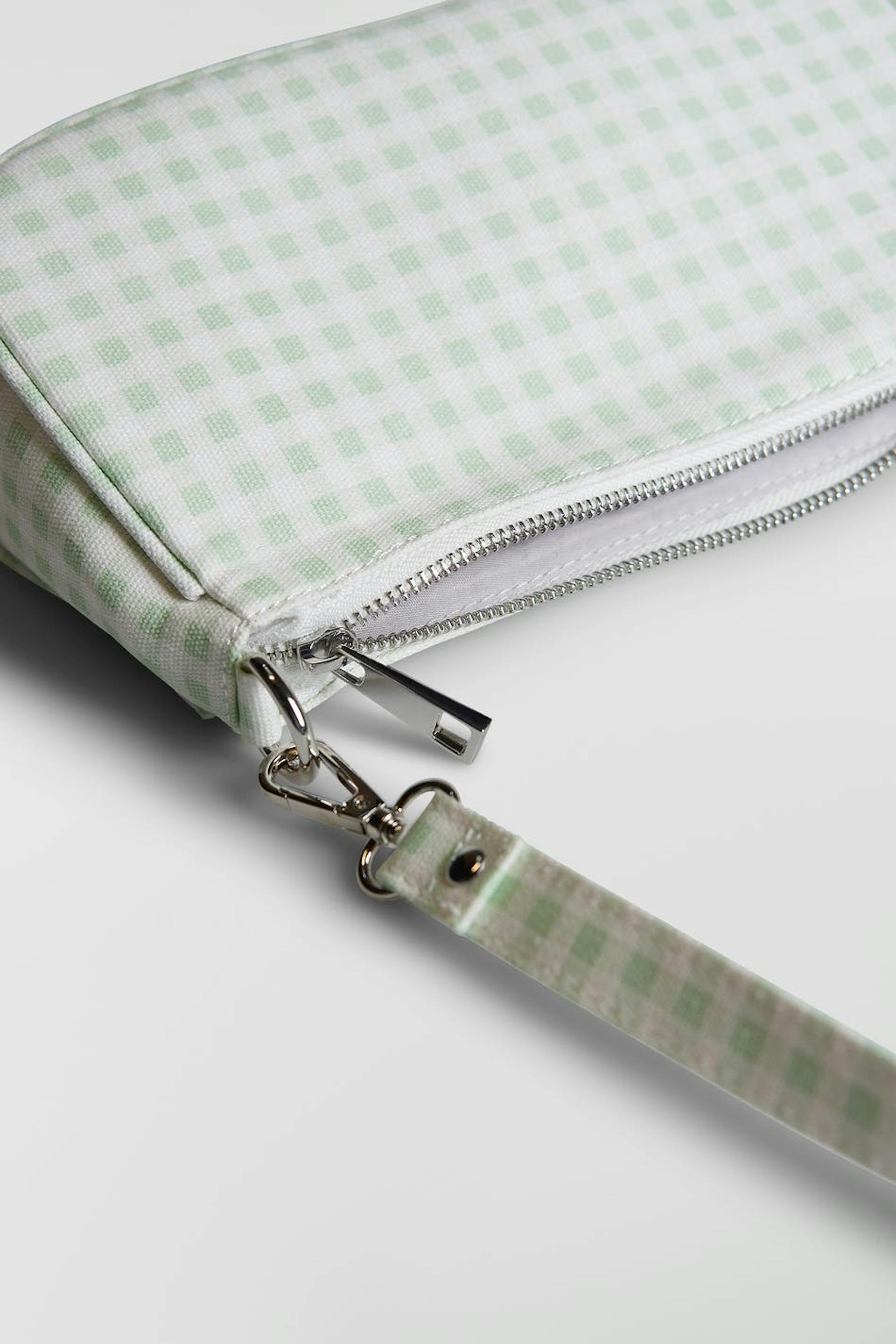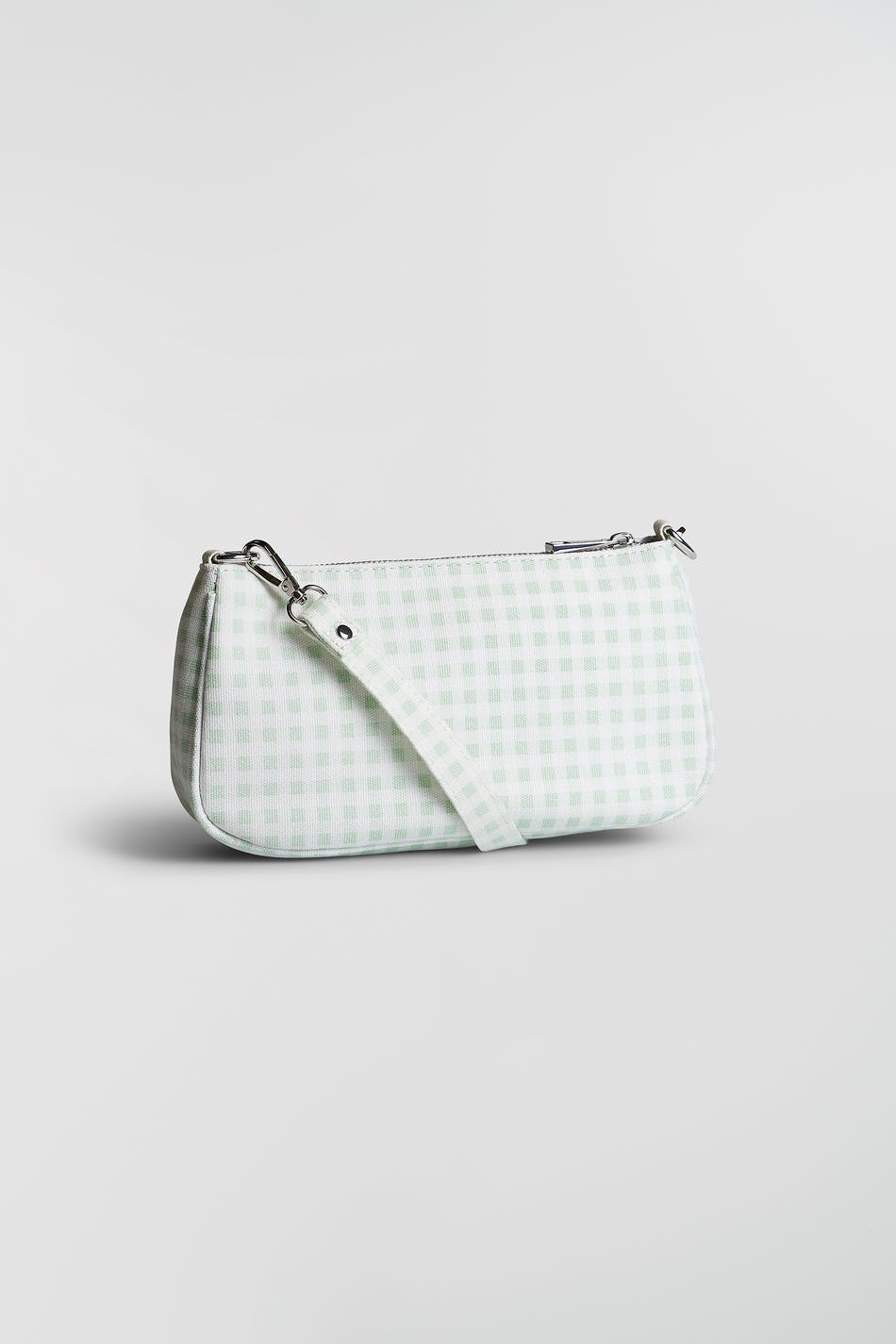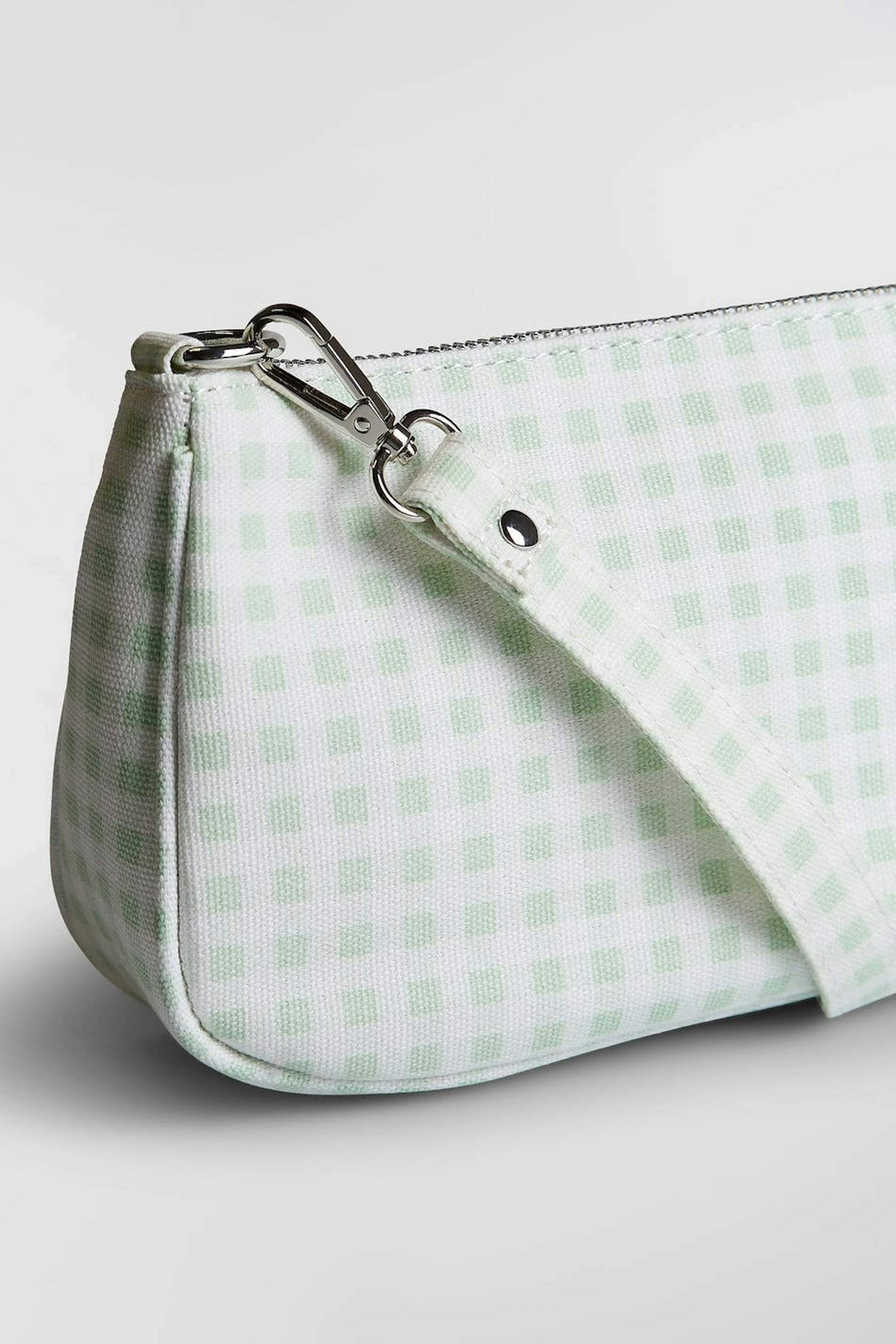 Checked baguette bag with a short, detachable shoulder strap. The bag is green and white and has a zip on top.