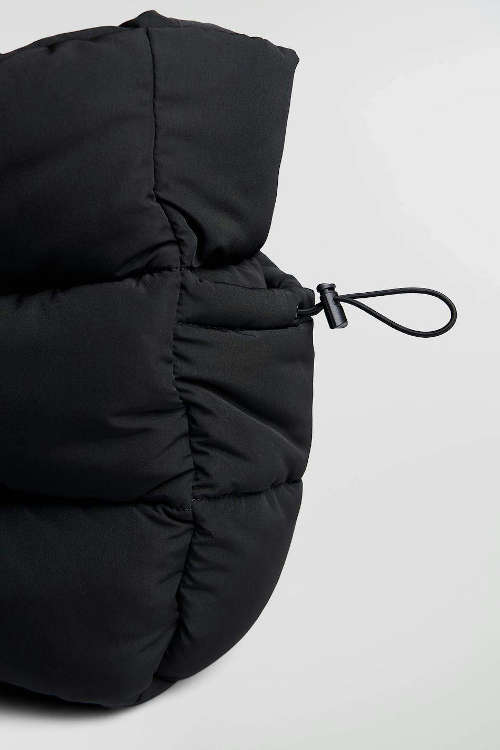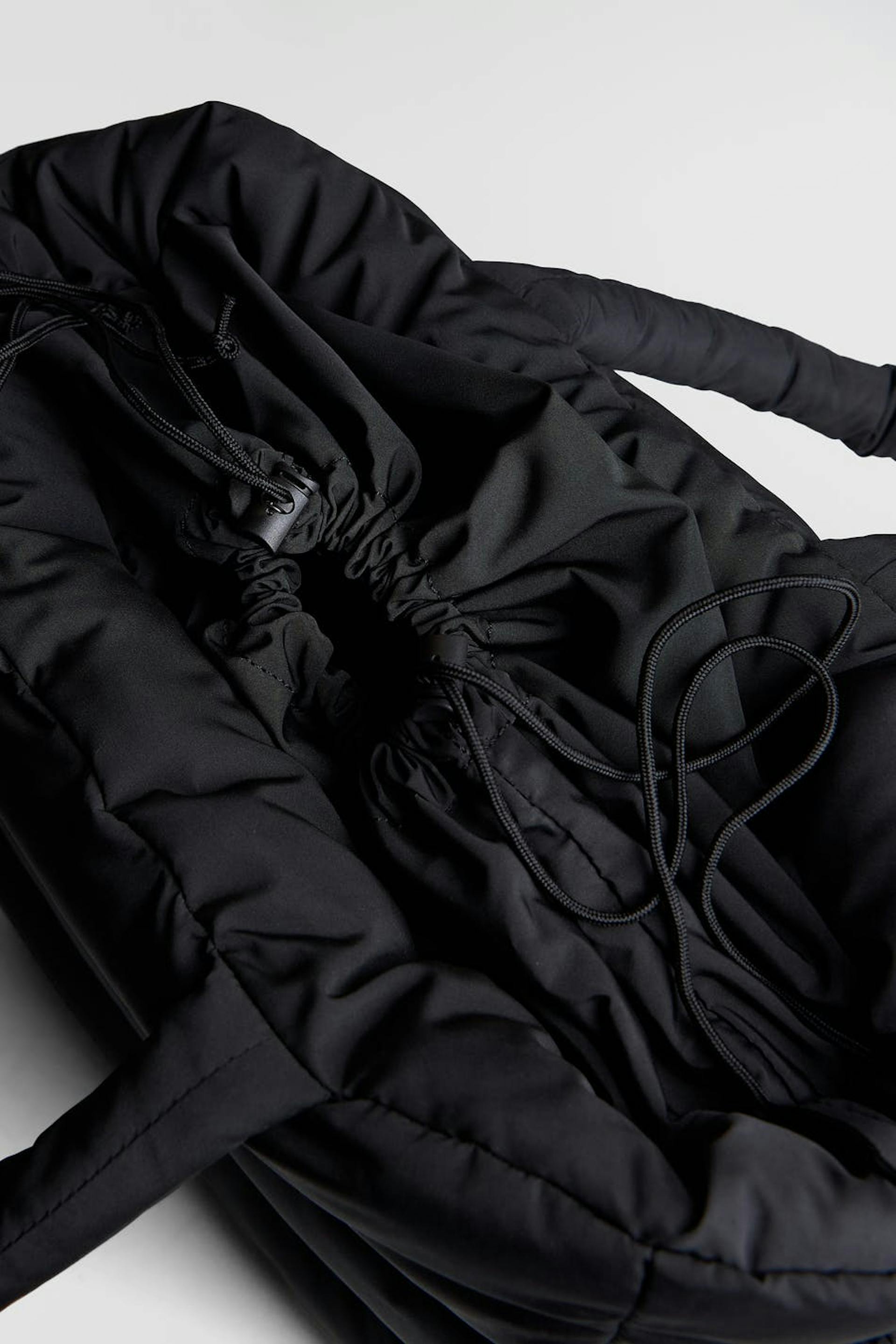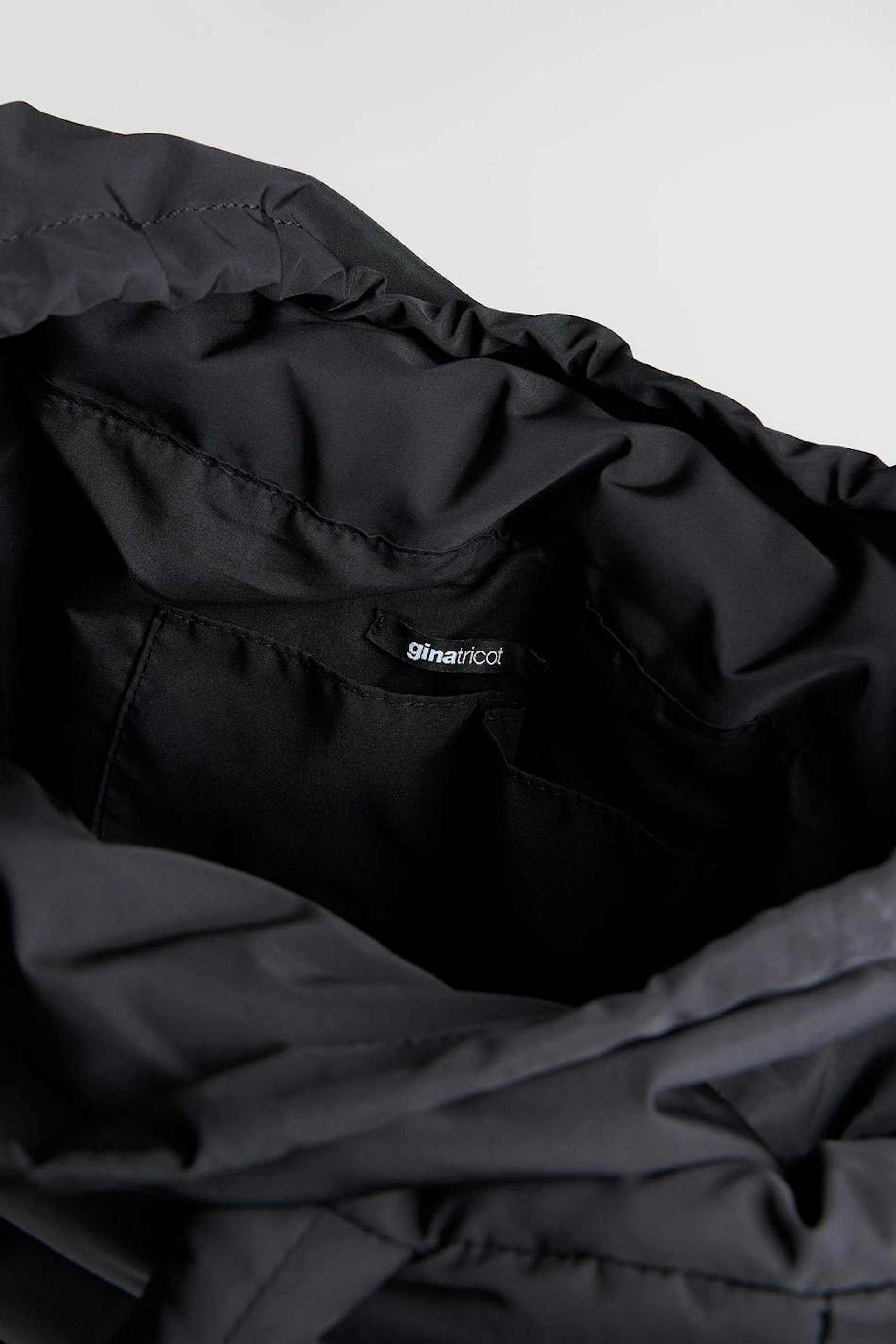 Padded bag by Gina Lab with handle at the top. The bag is black and has a material in recycled polyester coloured by We aRe SpinDye®. It has two outer compartments, a closure with an elasticized drawstring and an inner compartment.