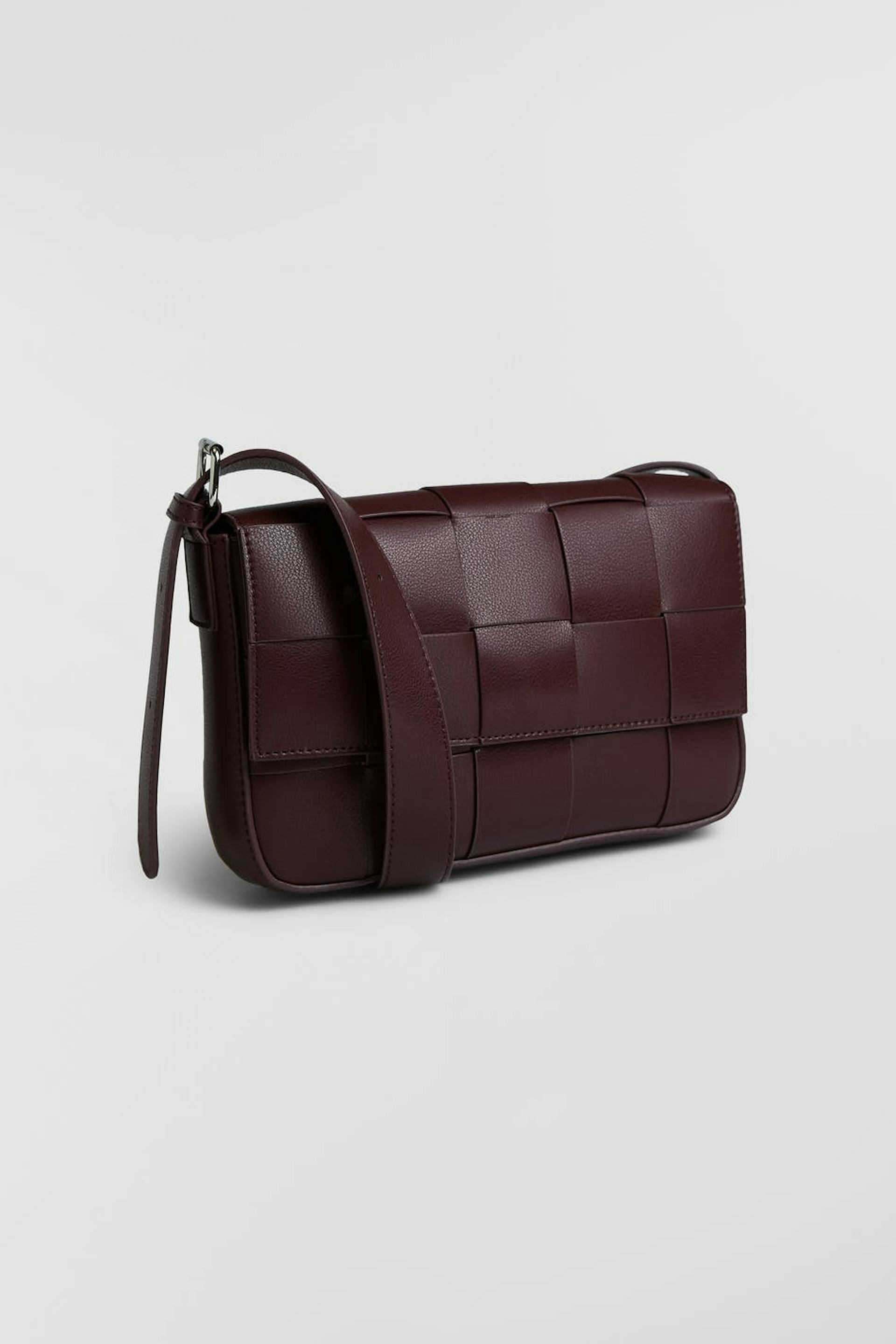 Braided bag with an adjustable shoulder strap. The bag is brown. It is made of PU.