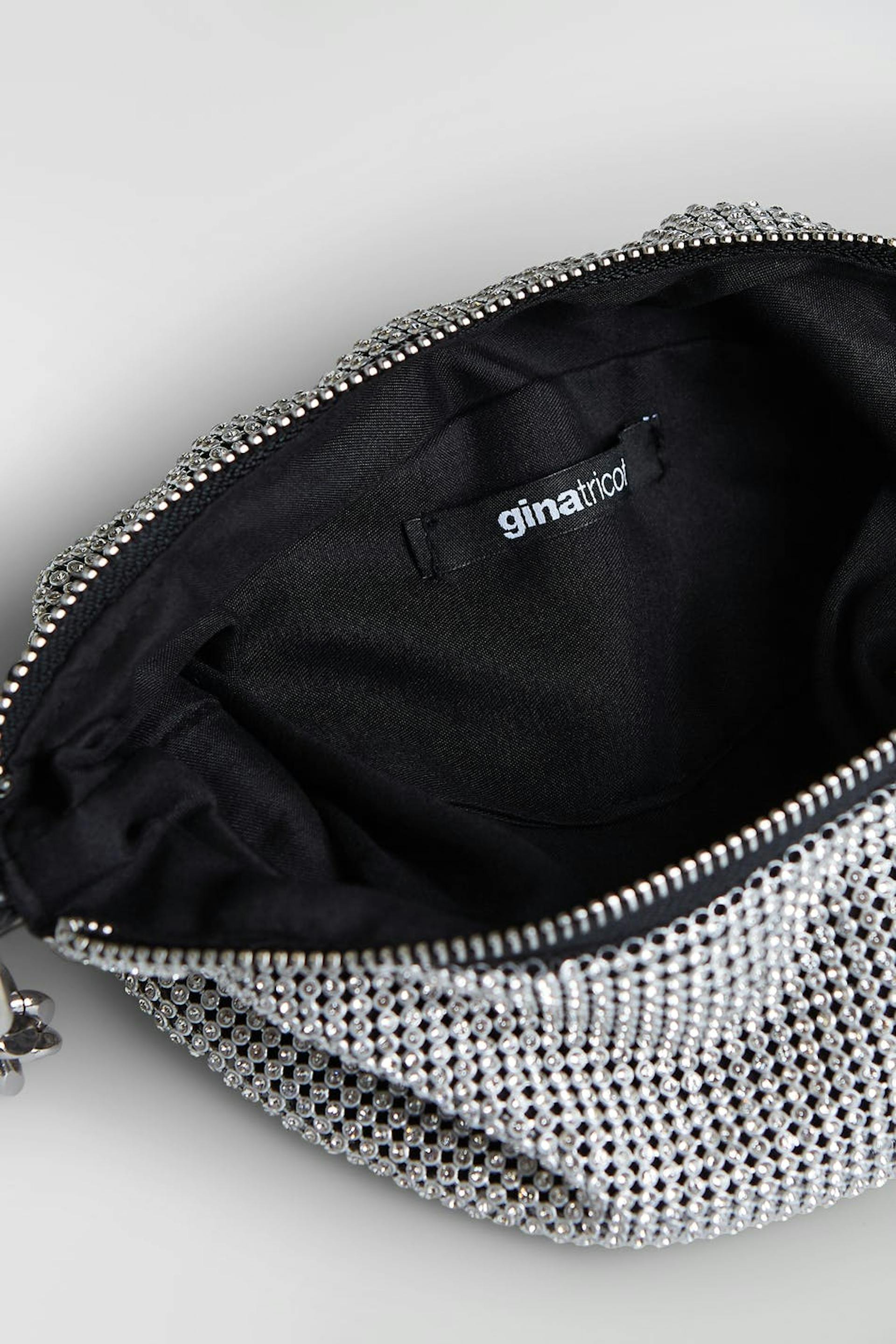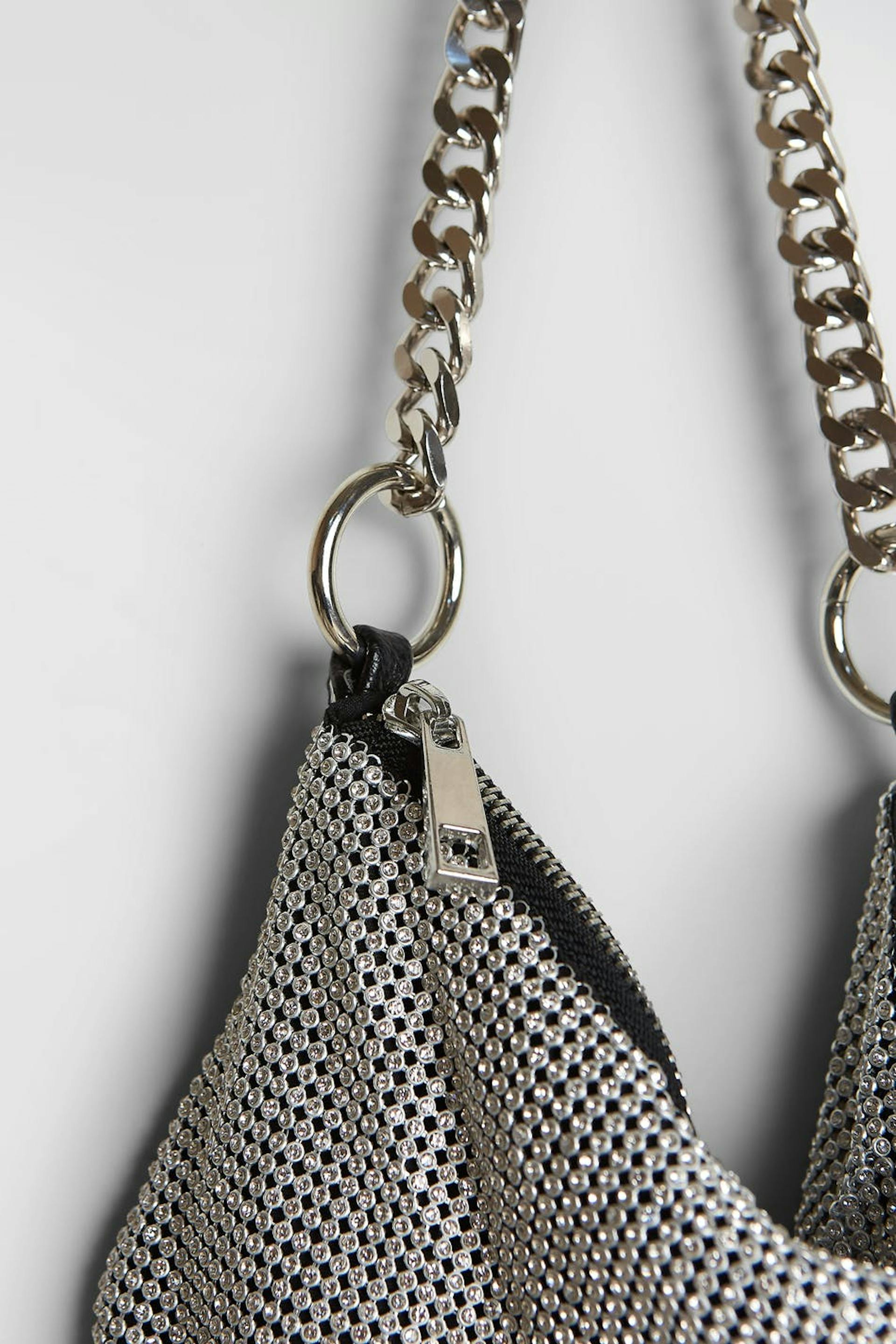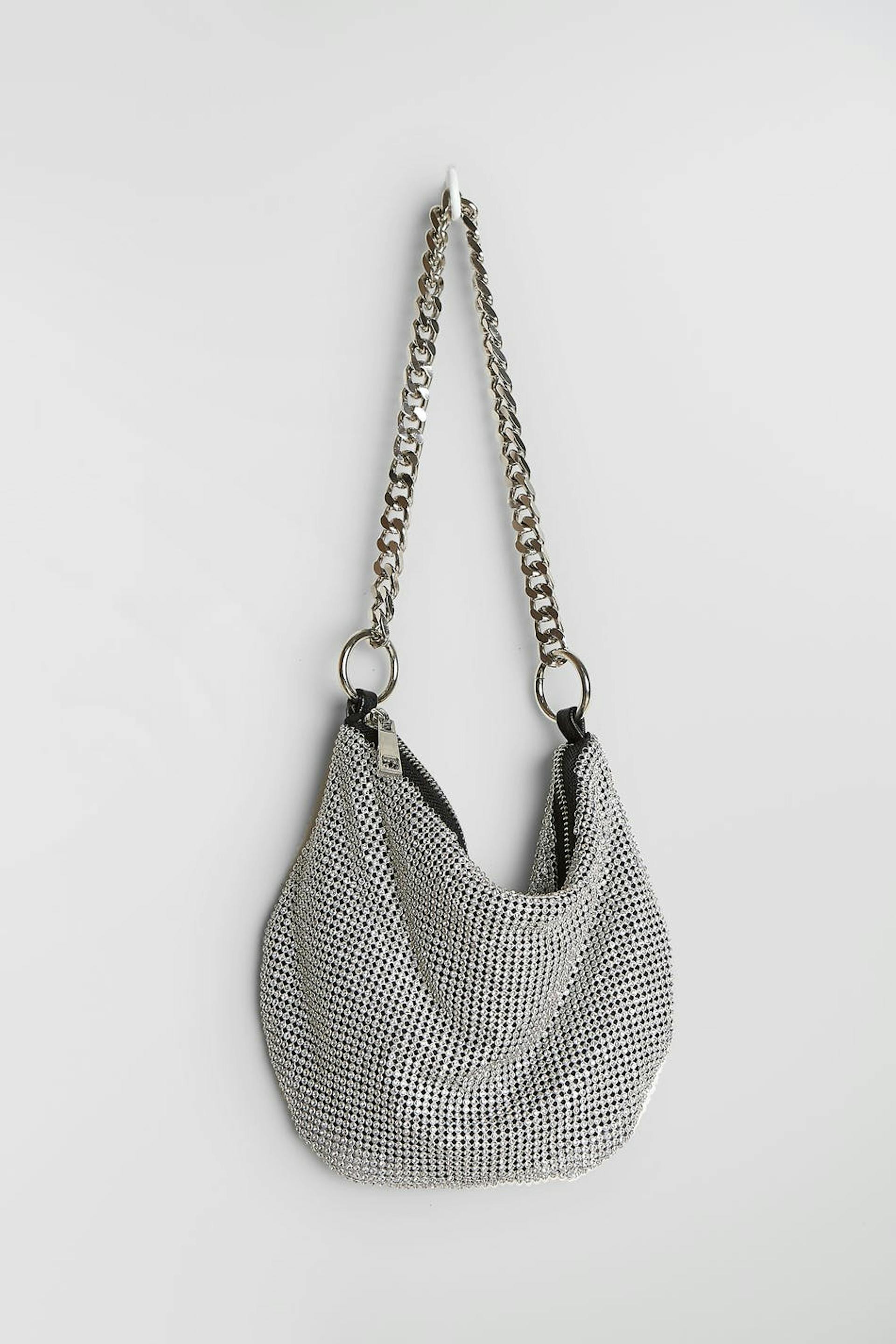Bag with an all-covering material with rhinestone. The bag is perfect for the party and silver coloured and has a shoulder strap with a chain design. It has a zip on top.