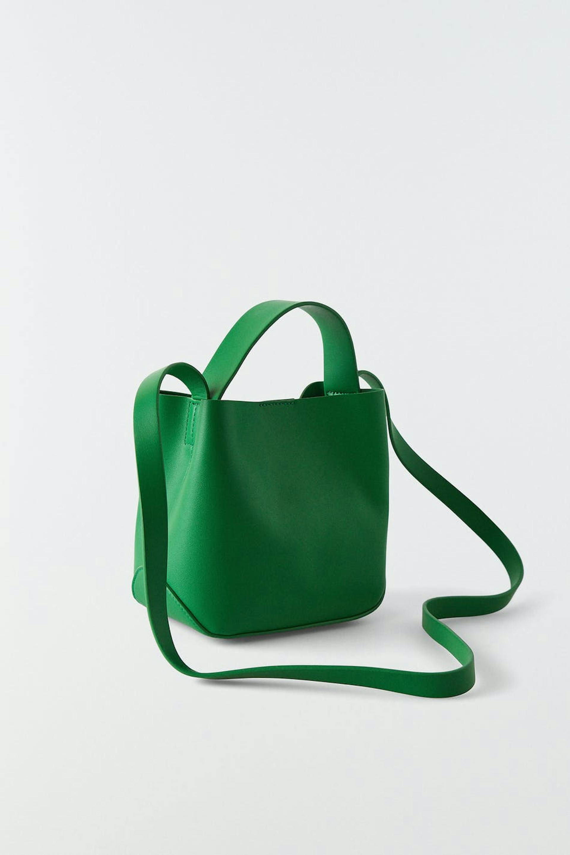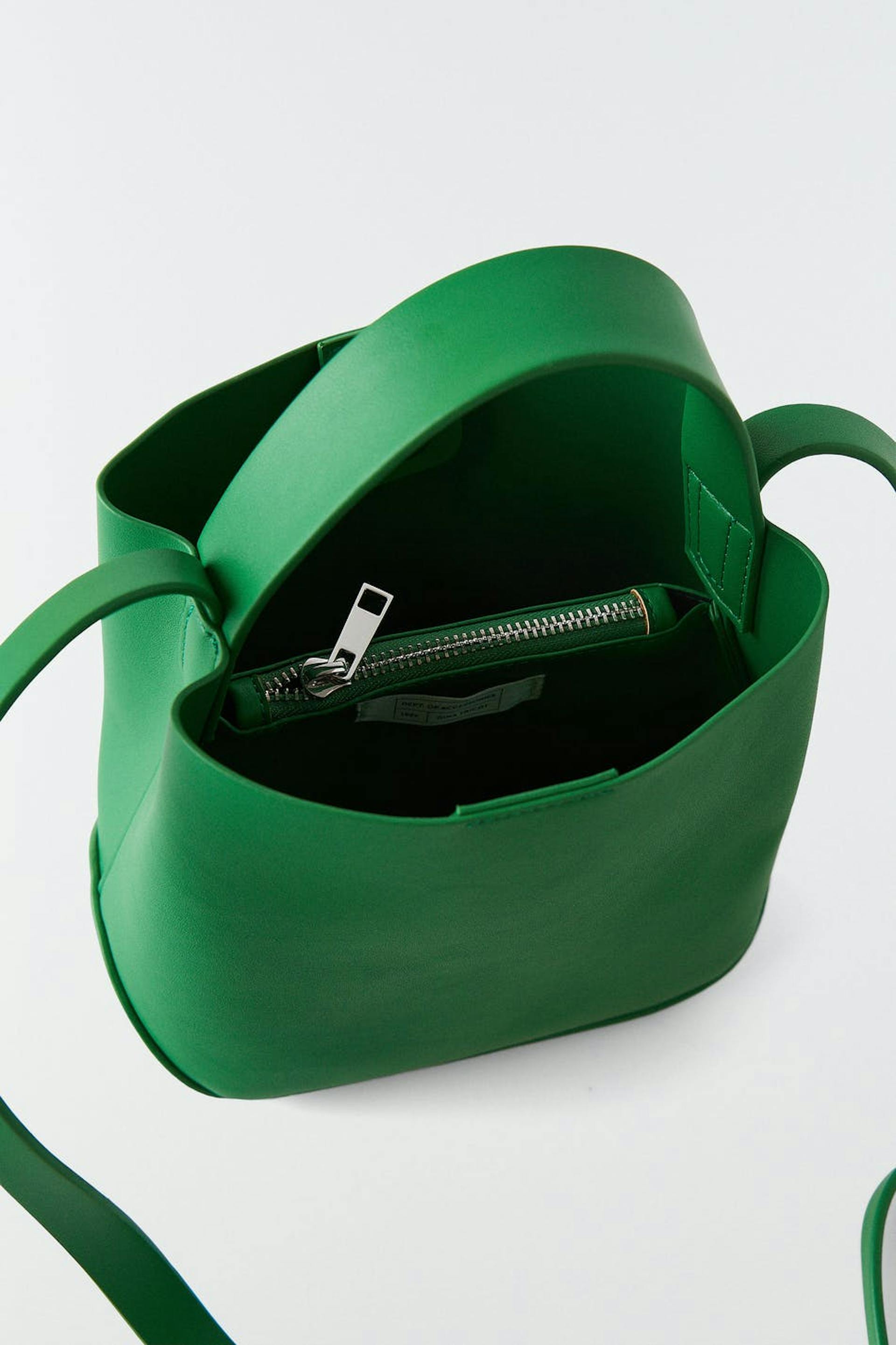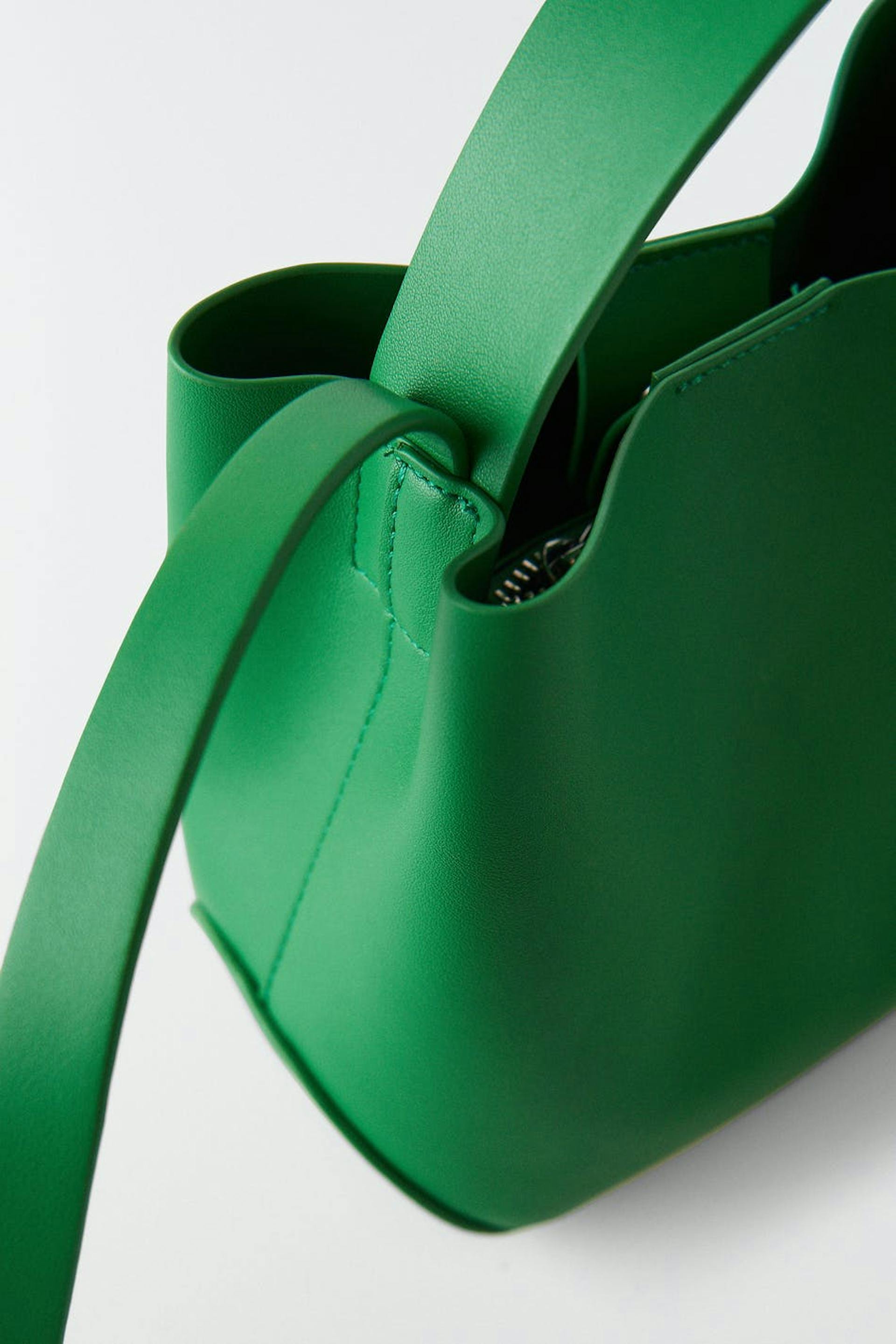 Bag in PU with small handle at the top. The bag is green and has a long shoulder strap. It has an inner compartment and closure with metallic button.