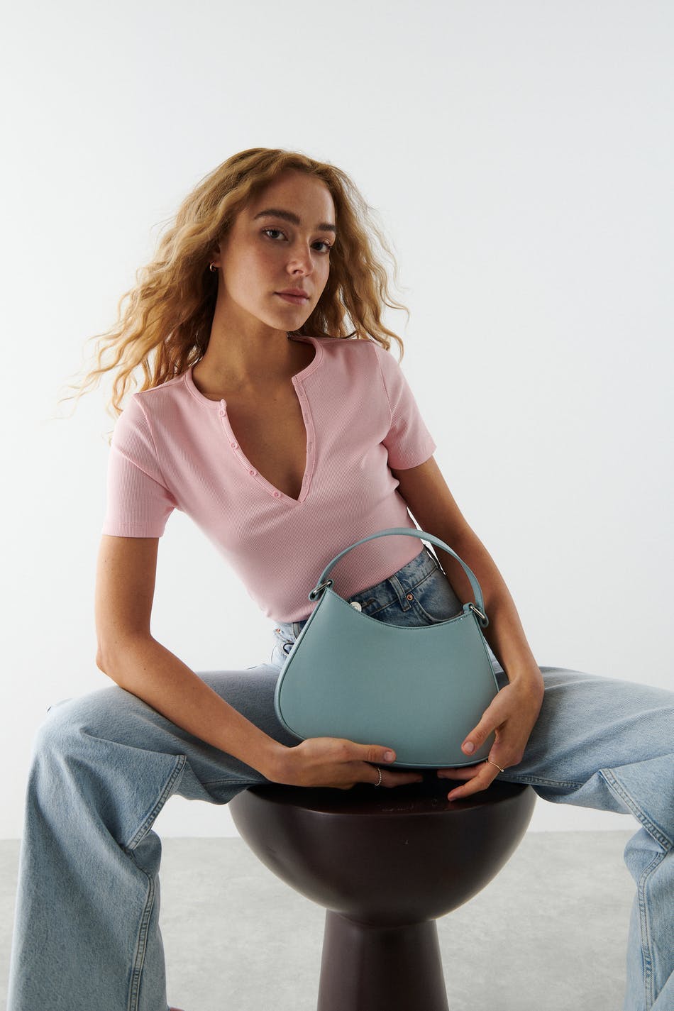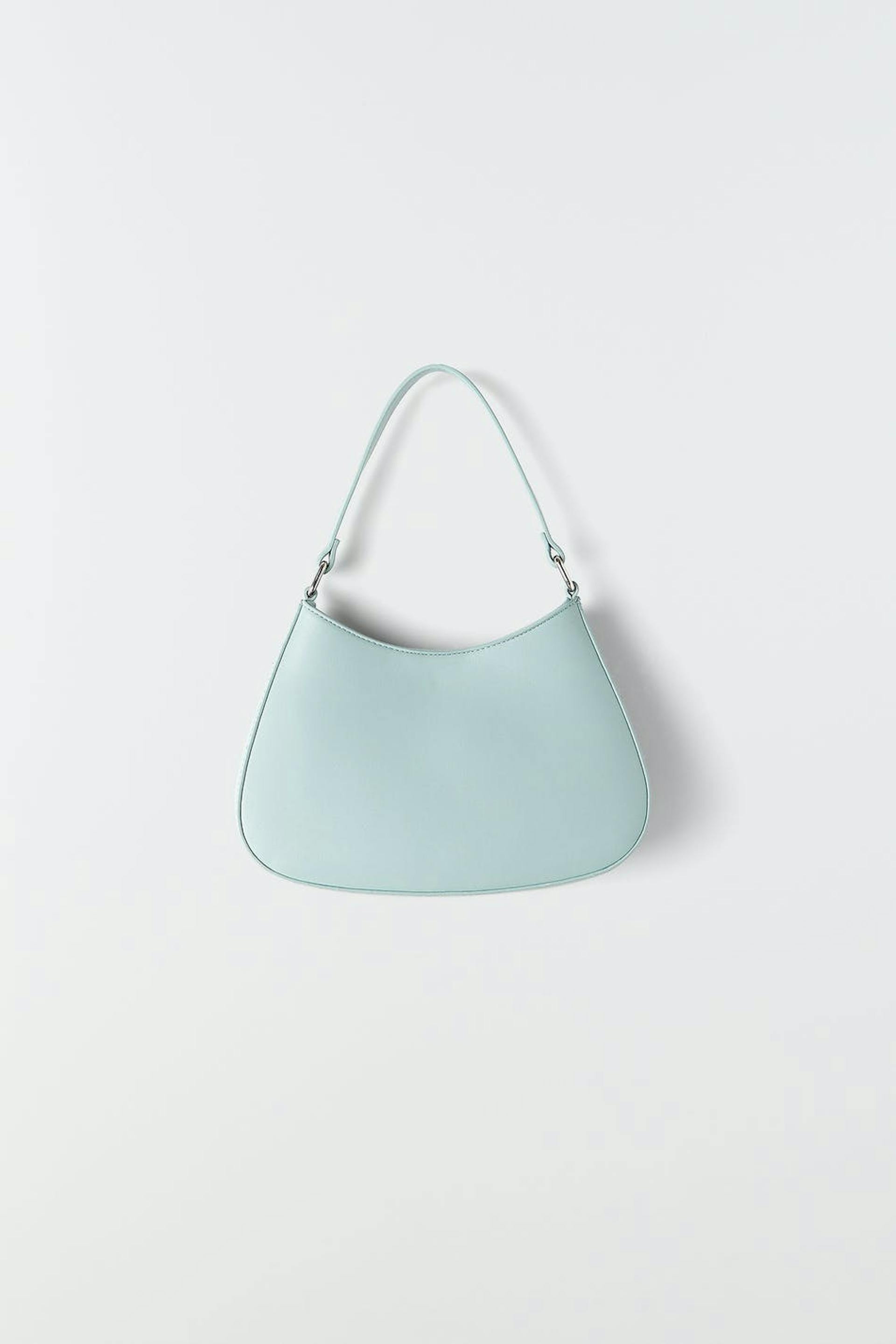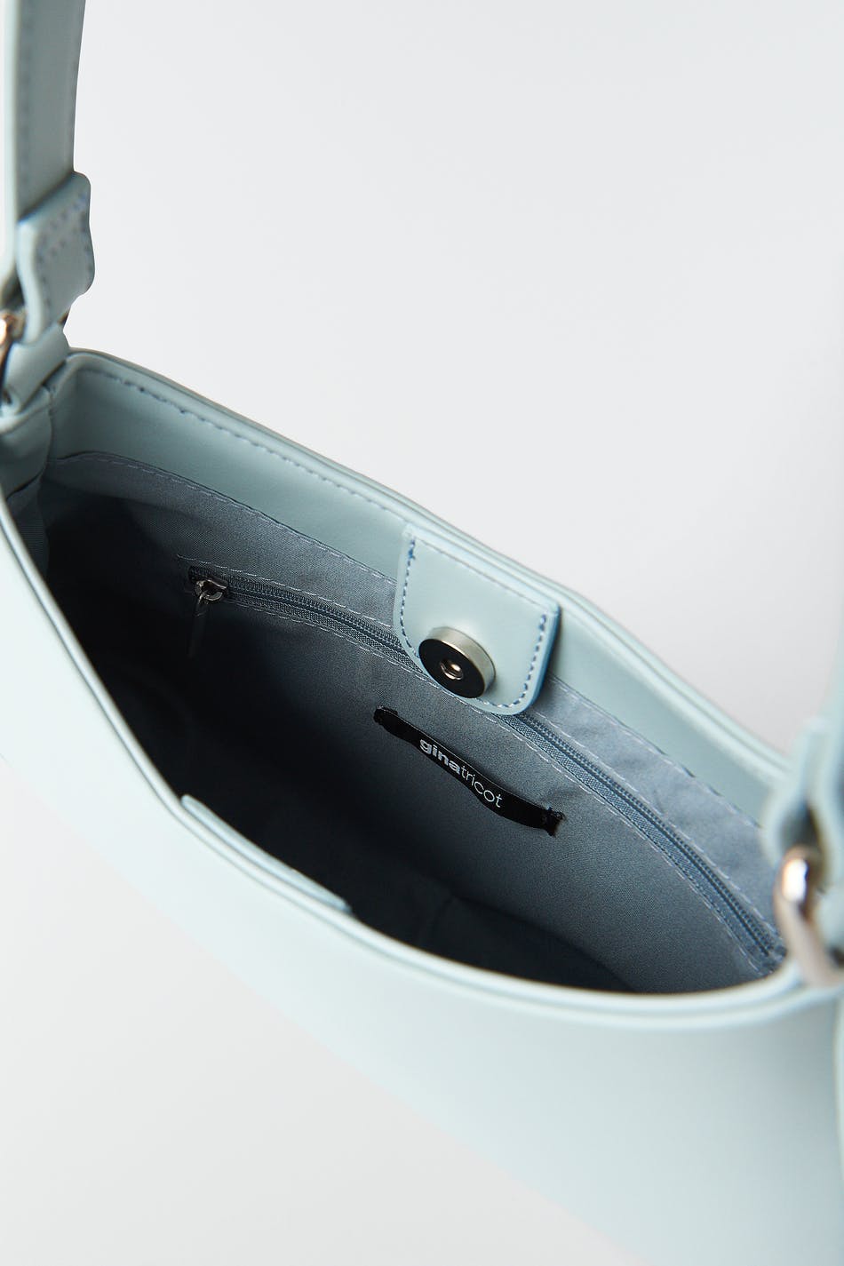 Faux-leather bag with short handle. The bag is blue and has an inner compartment. It has closure with magnetic fastening.