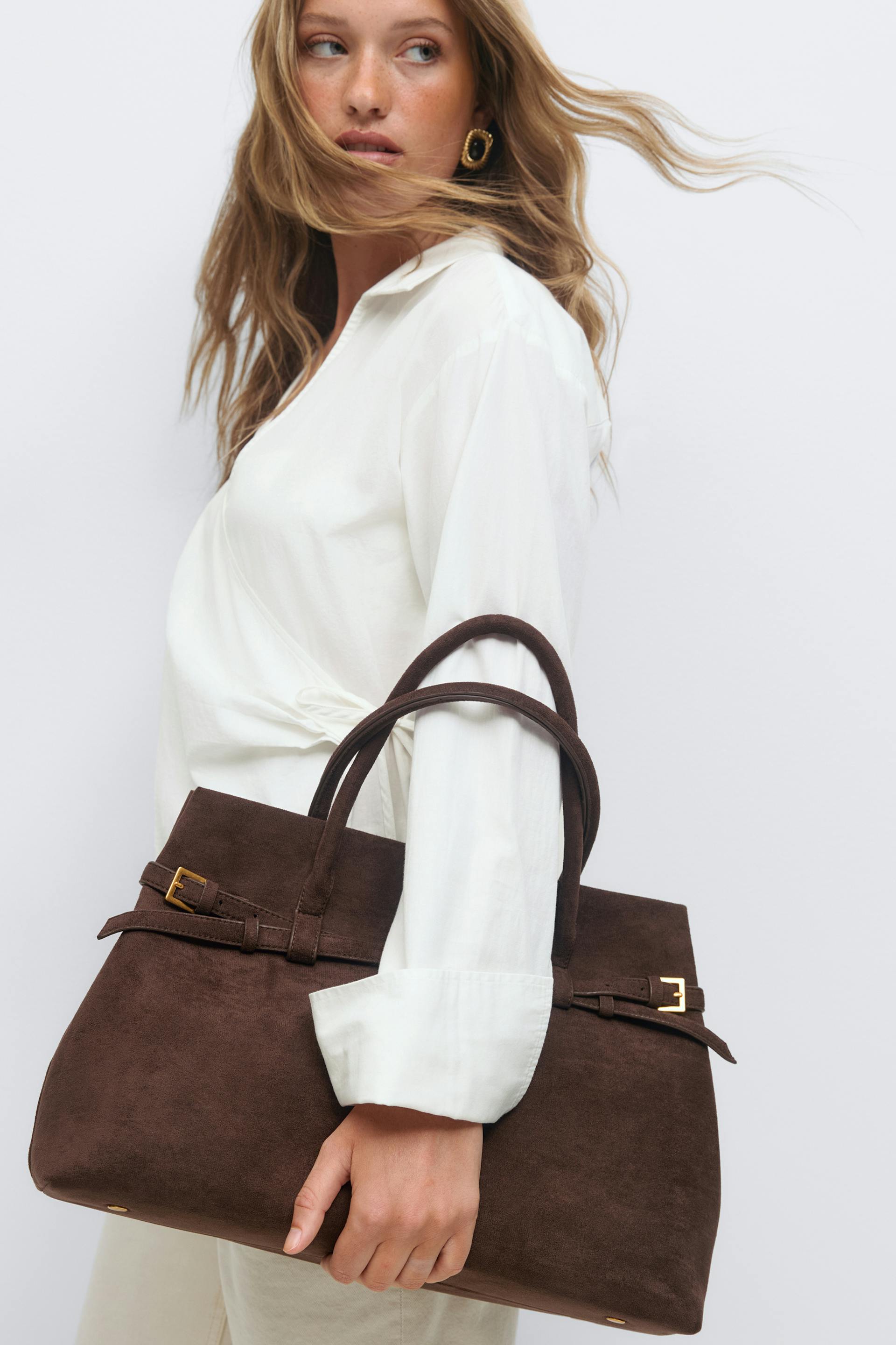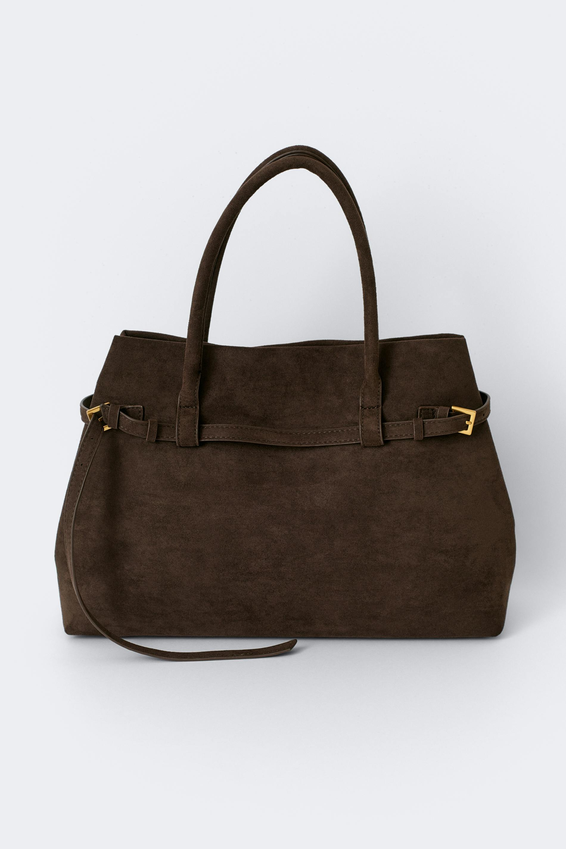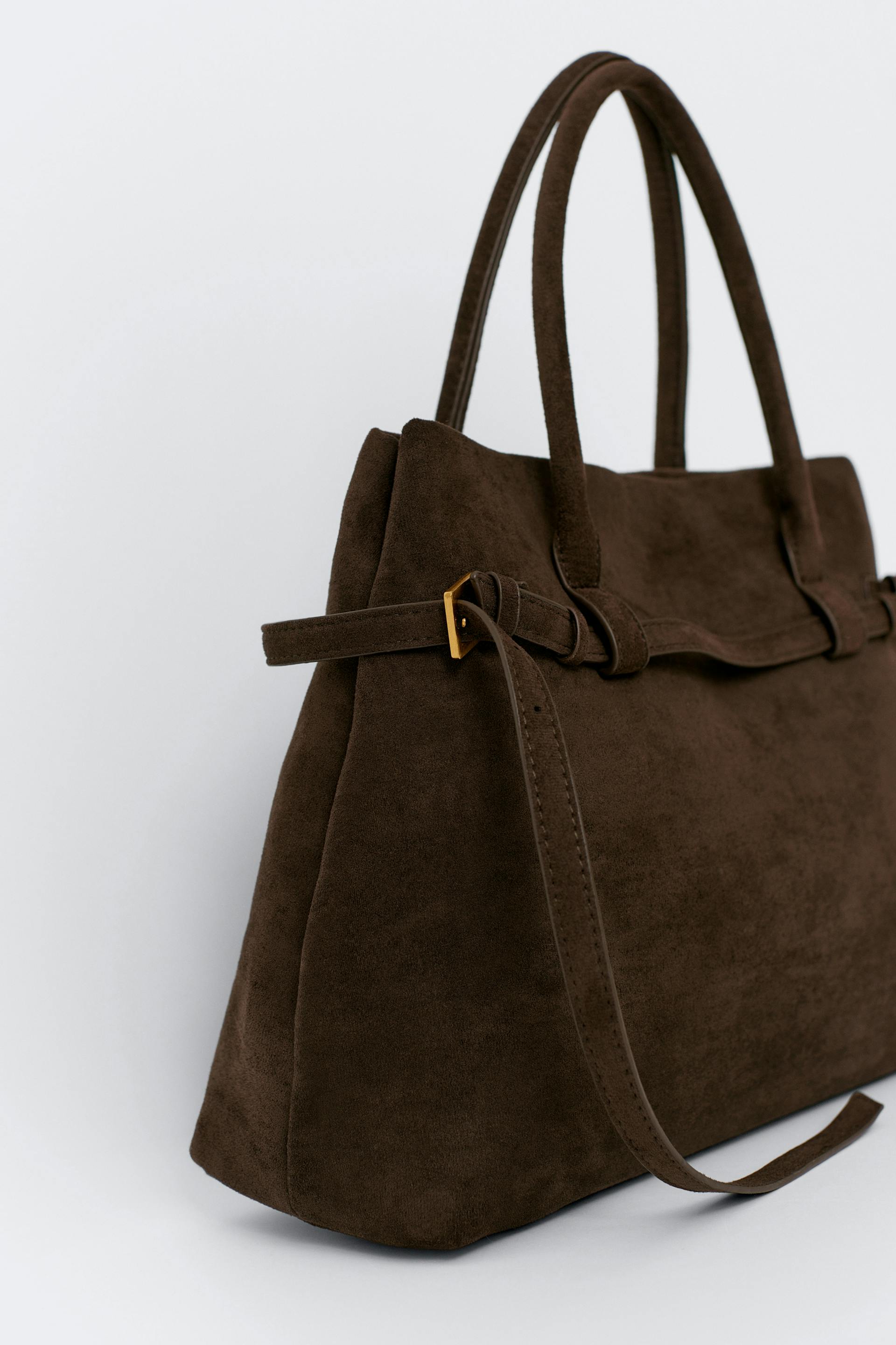 Classic tote bag in imitation suede with double handles at the top. The bag is brown and has spacious main compartment with magnetic closure. It has internal lining and strap details with buckles.