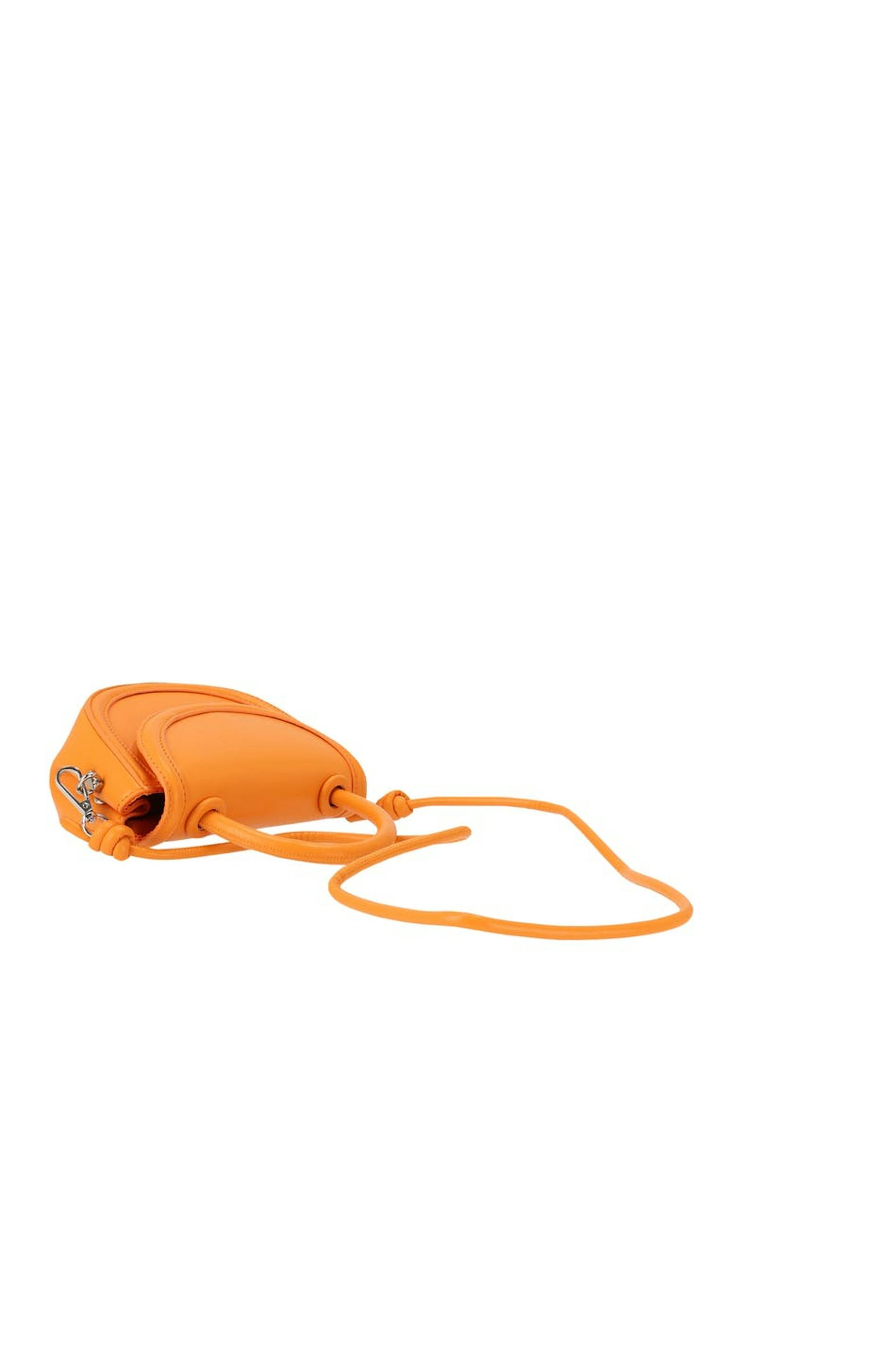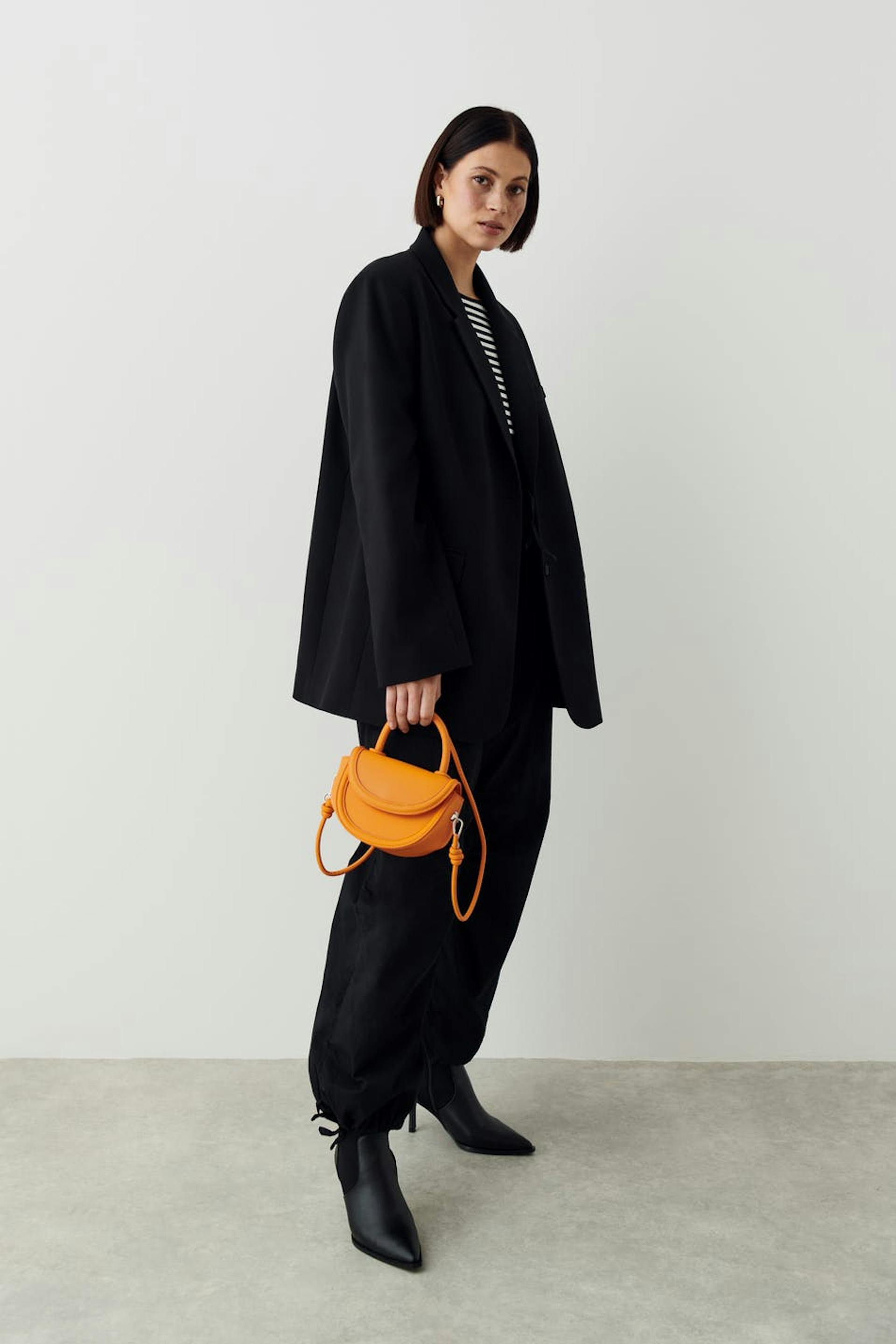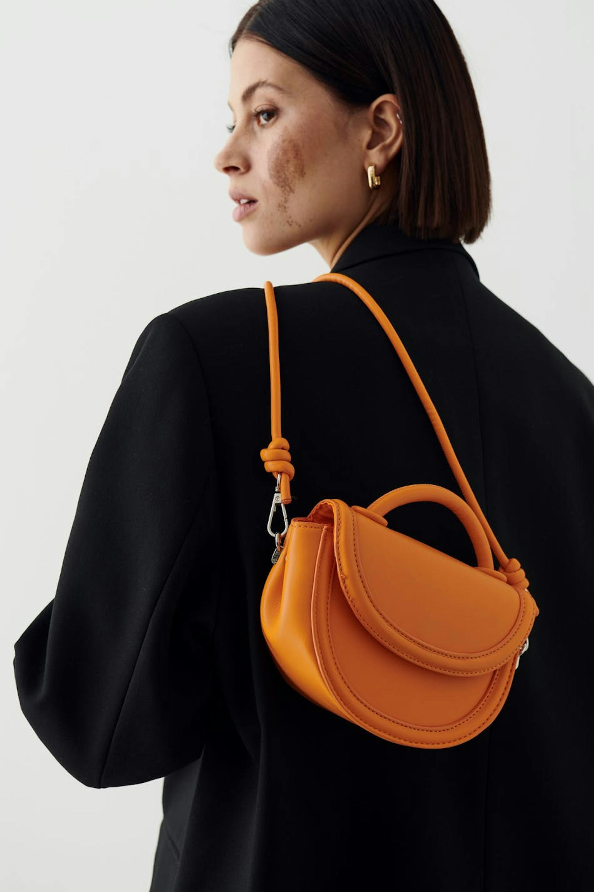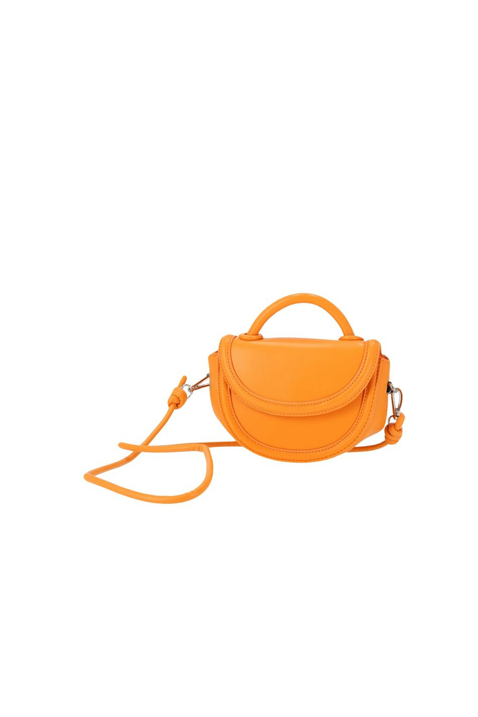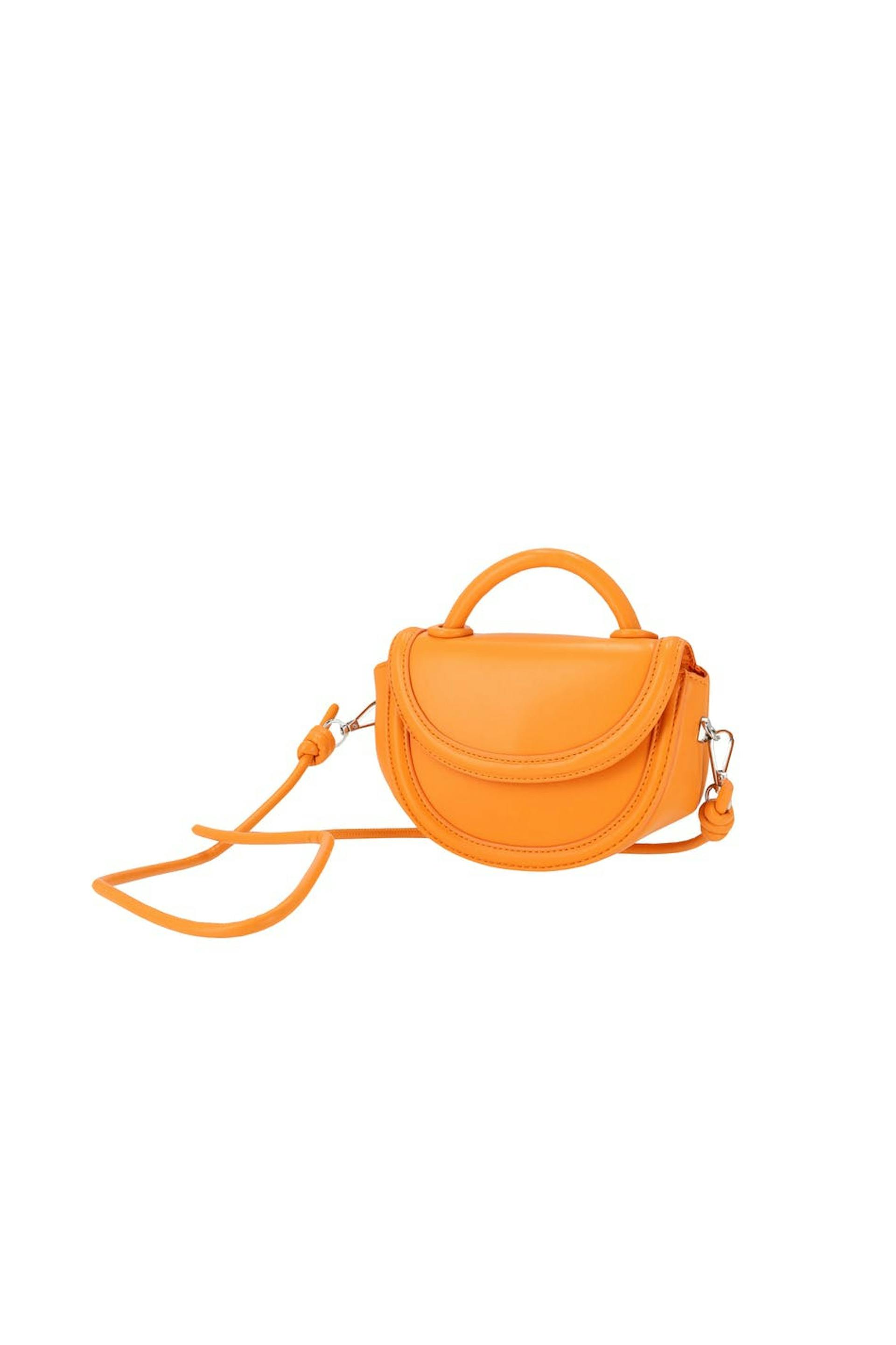 Small bag in imitation leather with lid. The bag is crescent and has small handle at the top. It has long, detachable shoulder strap with lobster clasp closures.