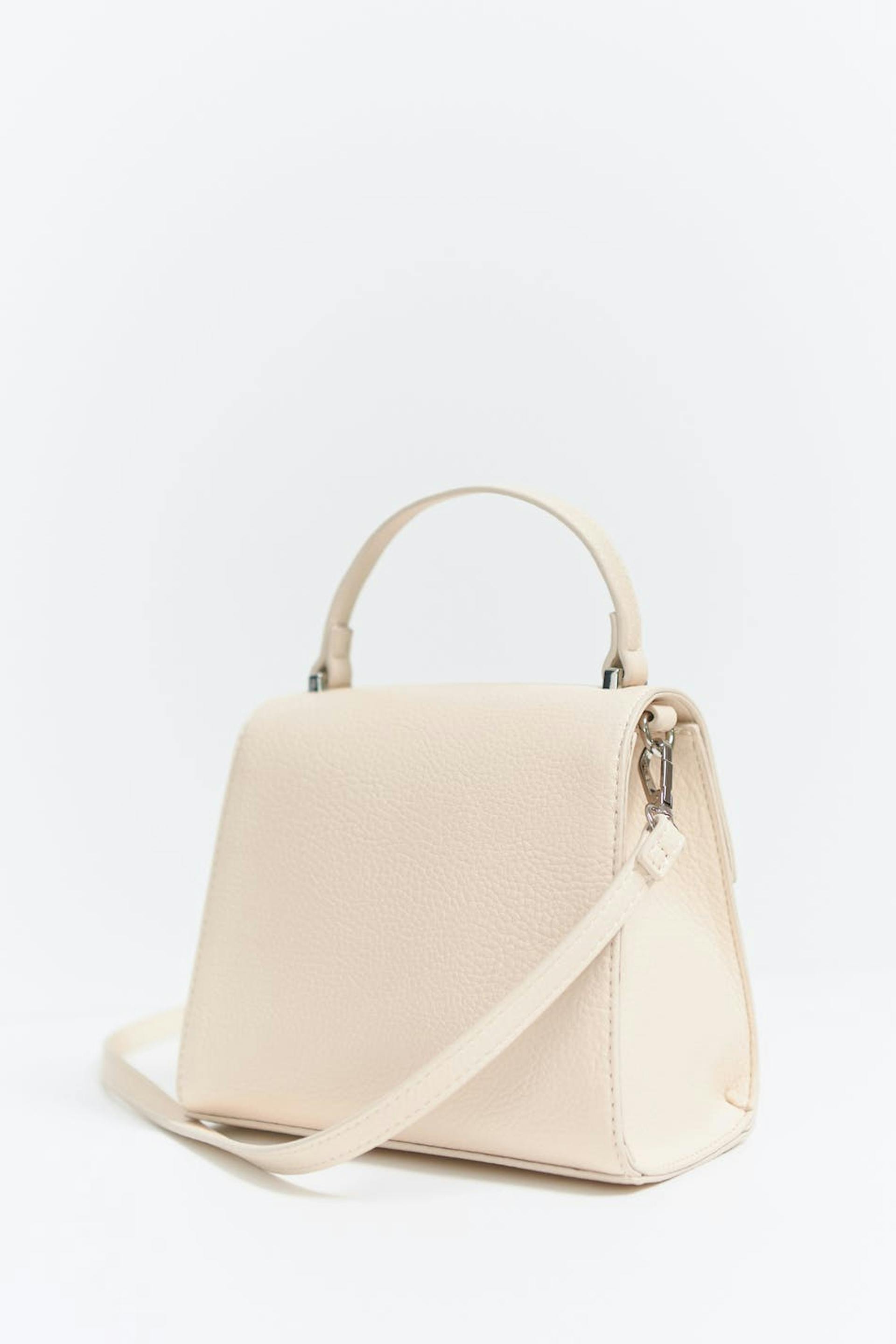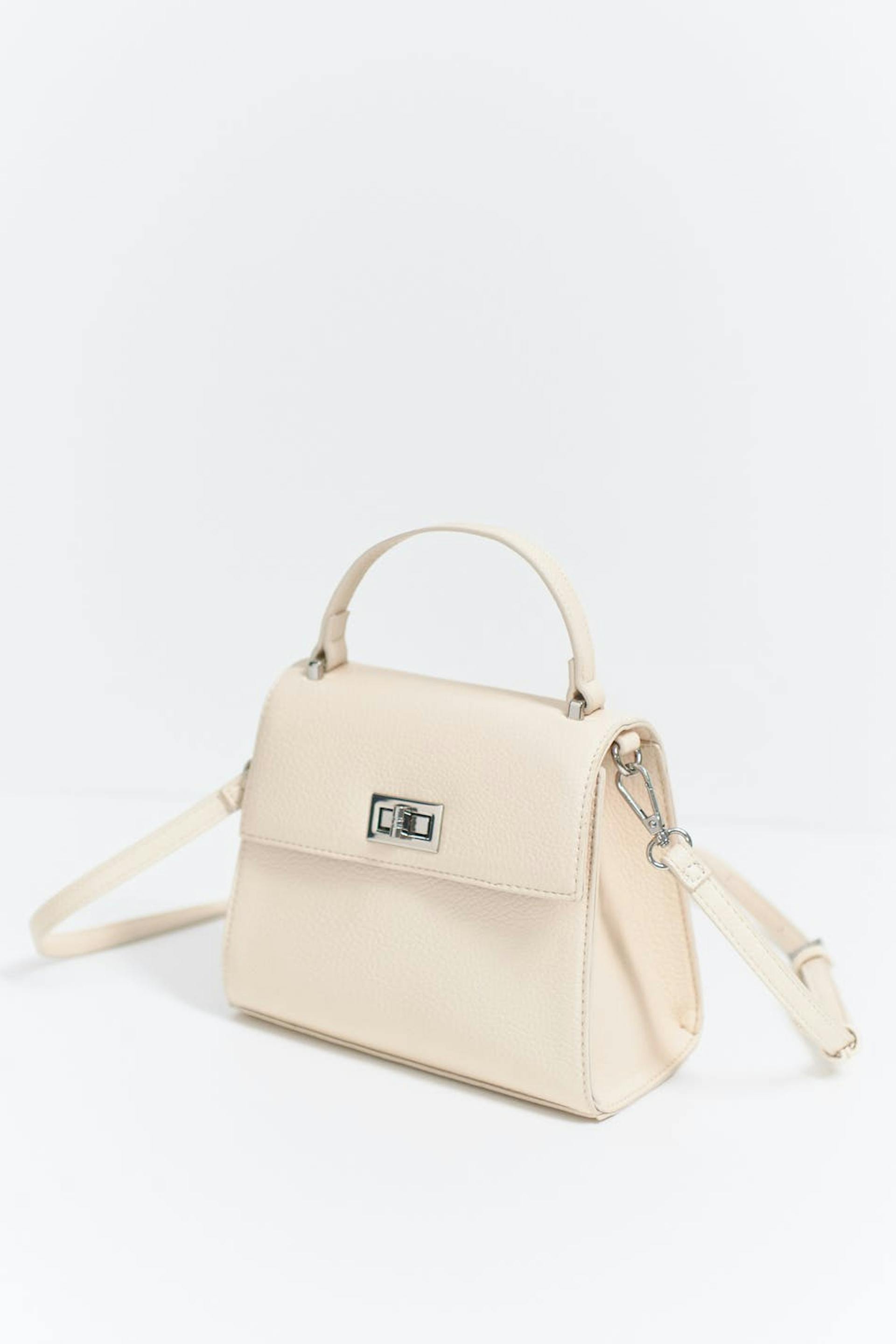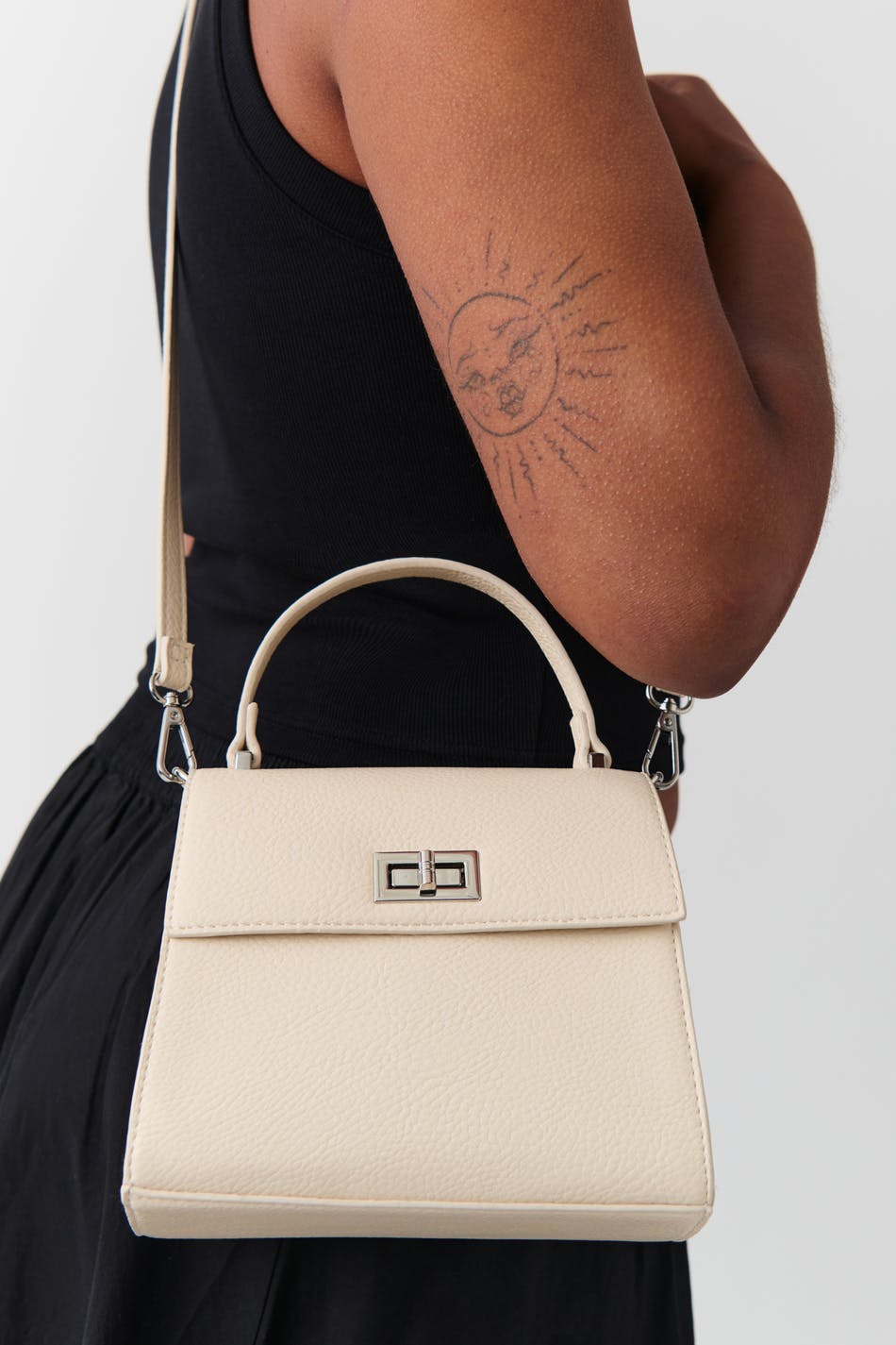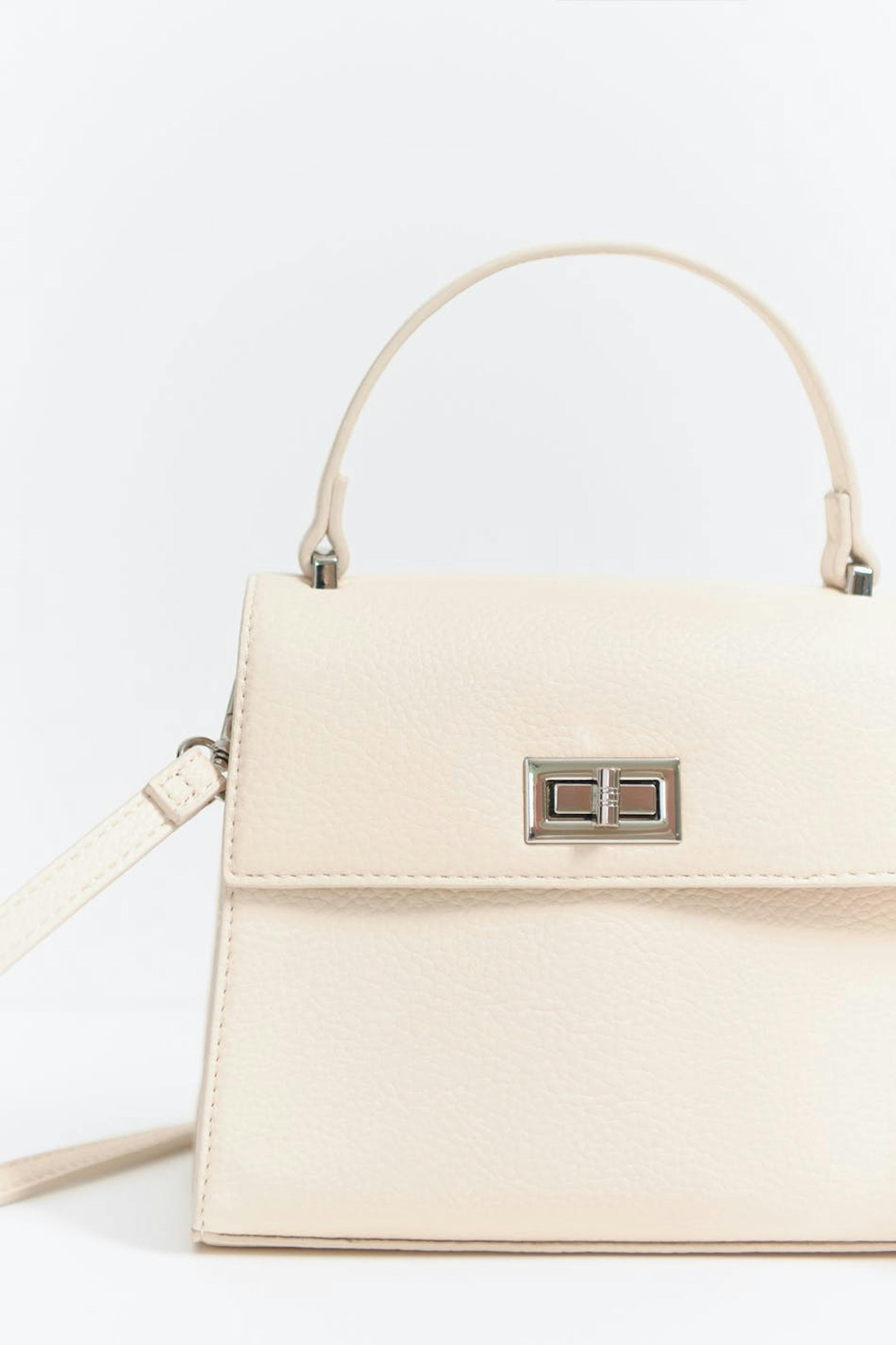Bag in imitation leather with flap. The bag is beige and has handle at the top. It has long, removable shoulder strap and gold coloured metal buckle with turning lock at the front.