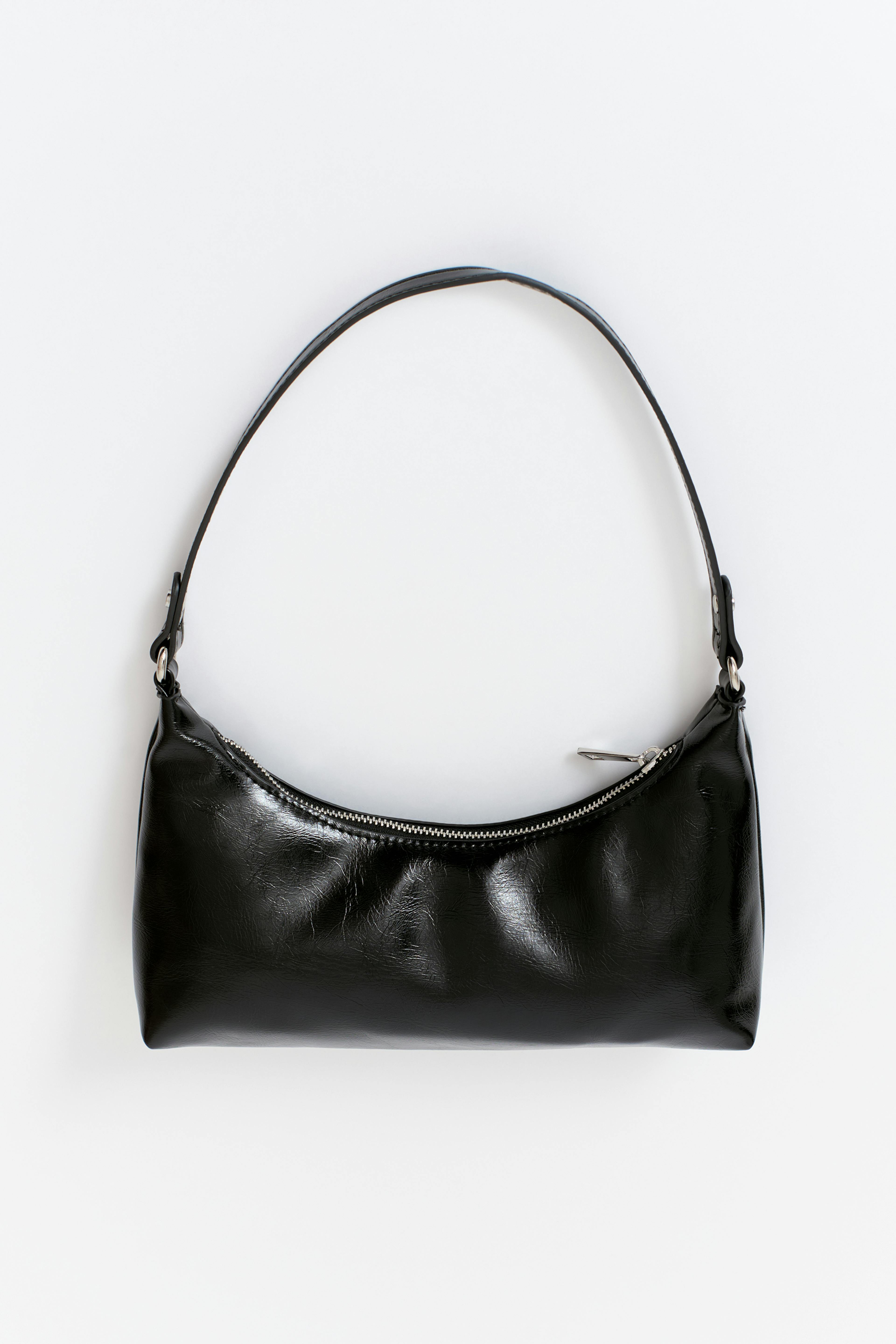 Small crossbody bag in imitation leather with a zip closure. The bag is black and has an inner pocket. It has an inner lining.