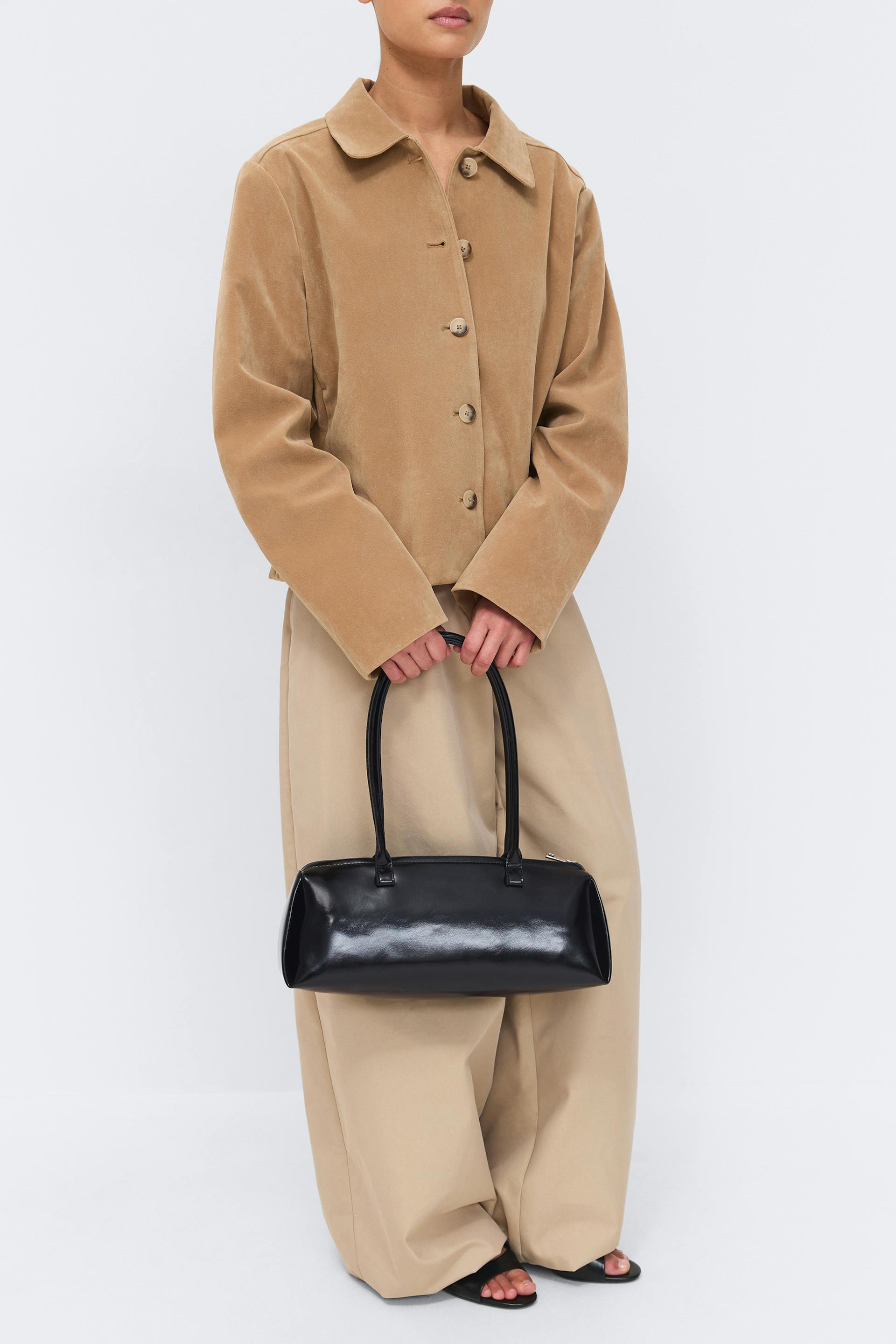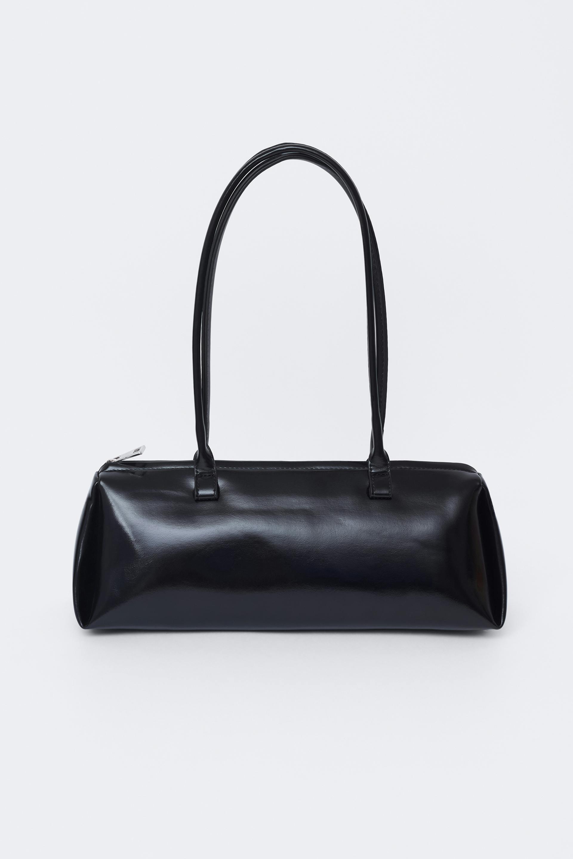 Small shoulder bag in imitation leather with rectangle design. The bag is black and has zip closure.