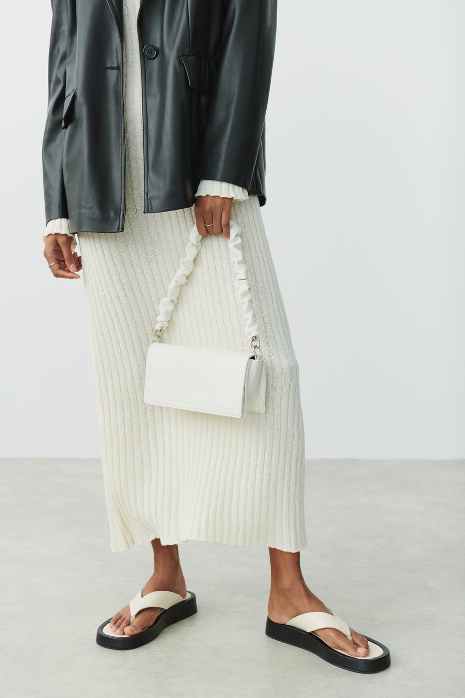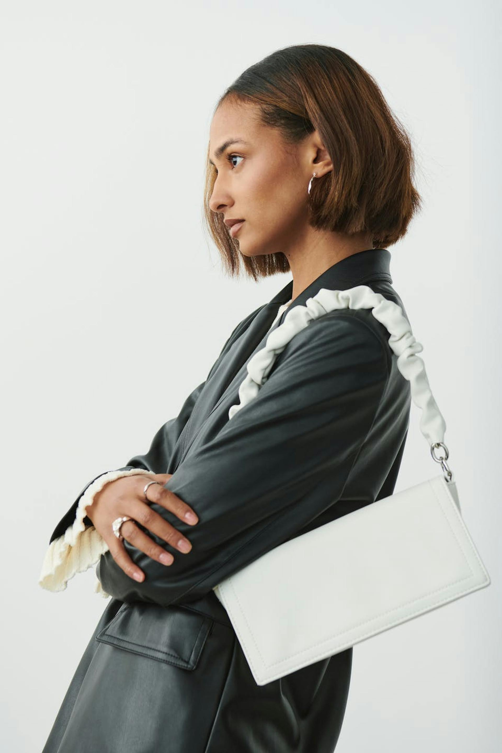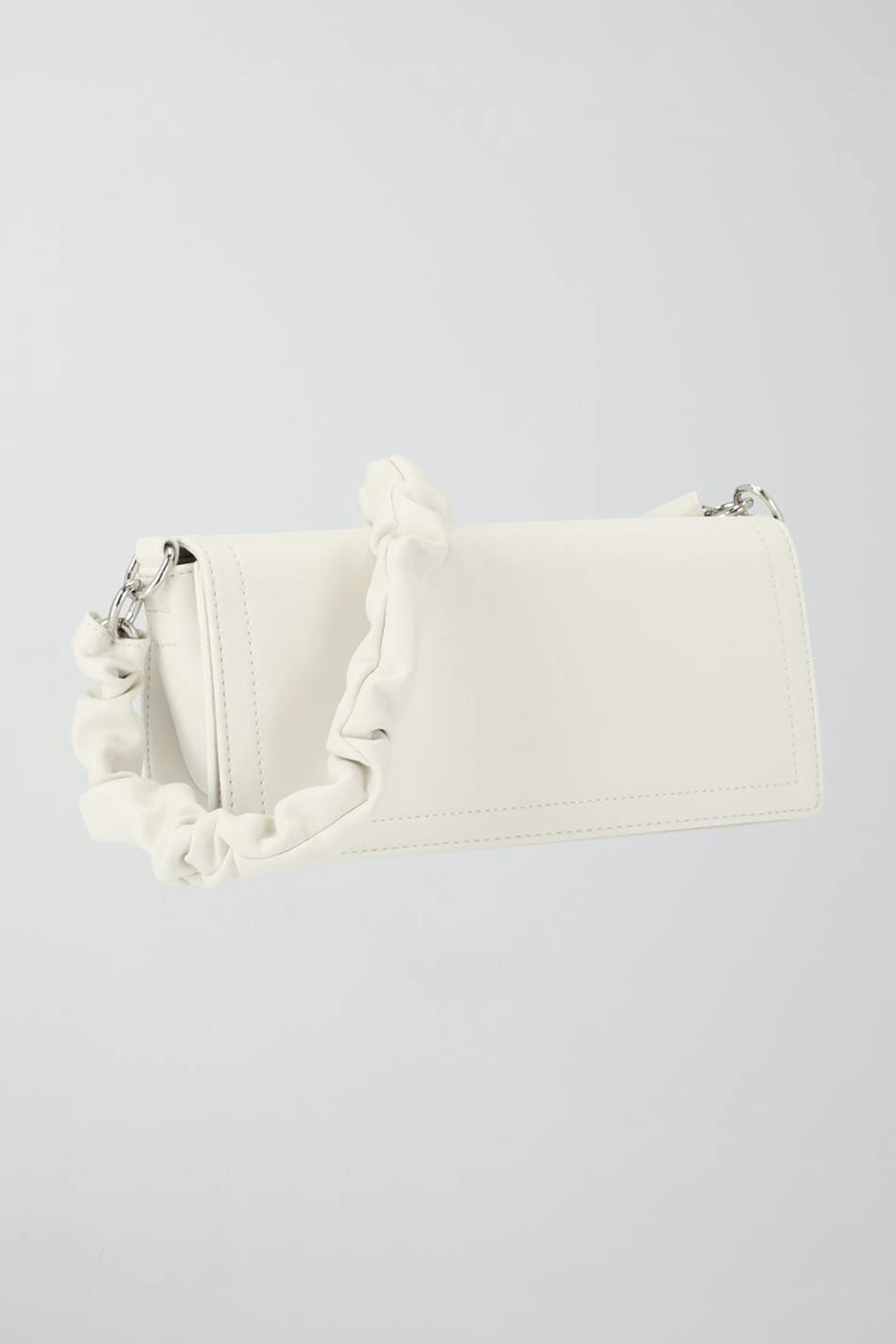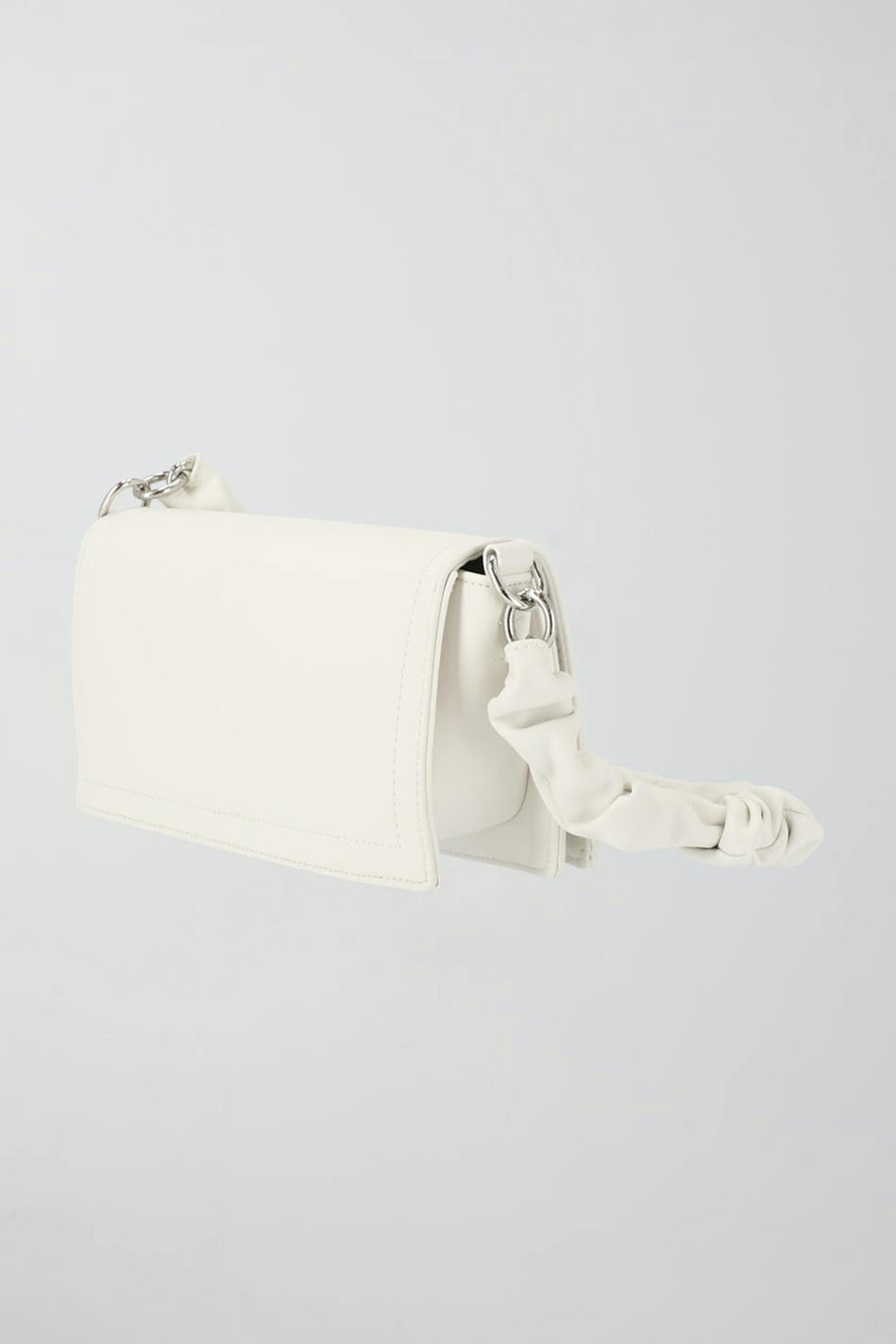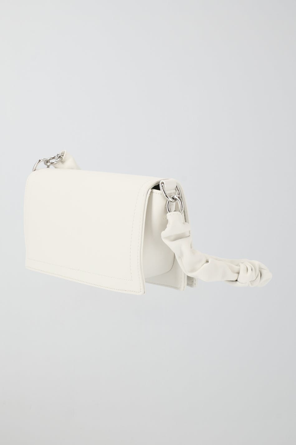 Shoulder bag with flap. The bag is white and has fabric covered chain strap.