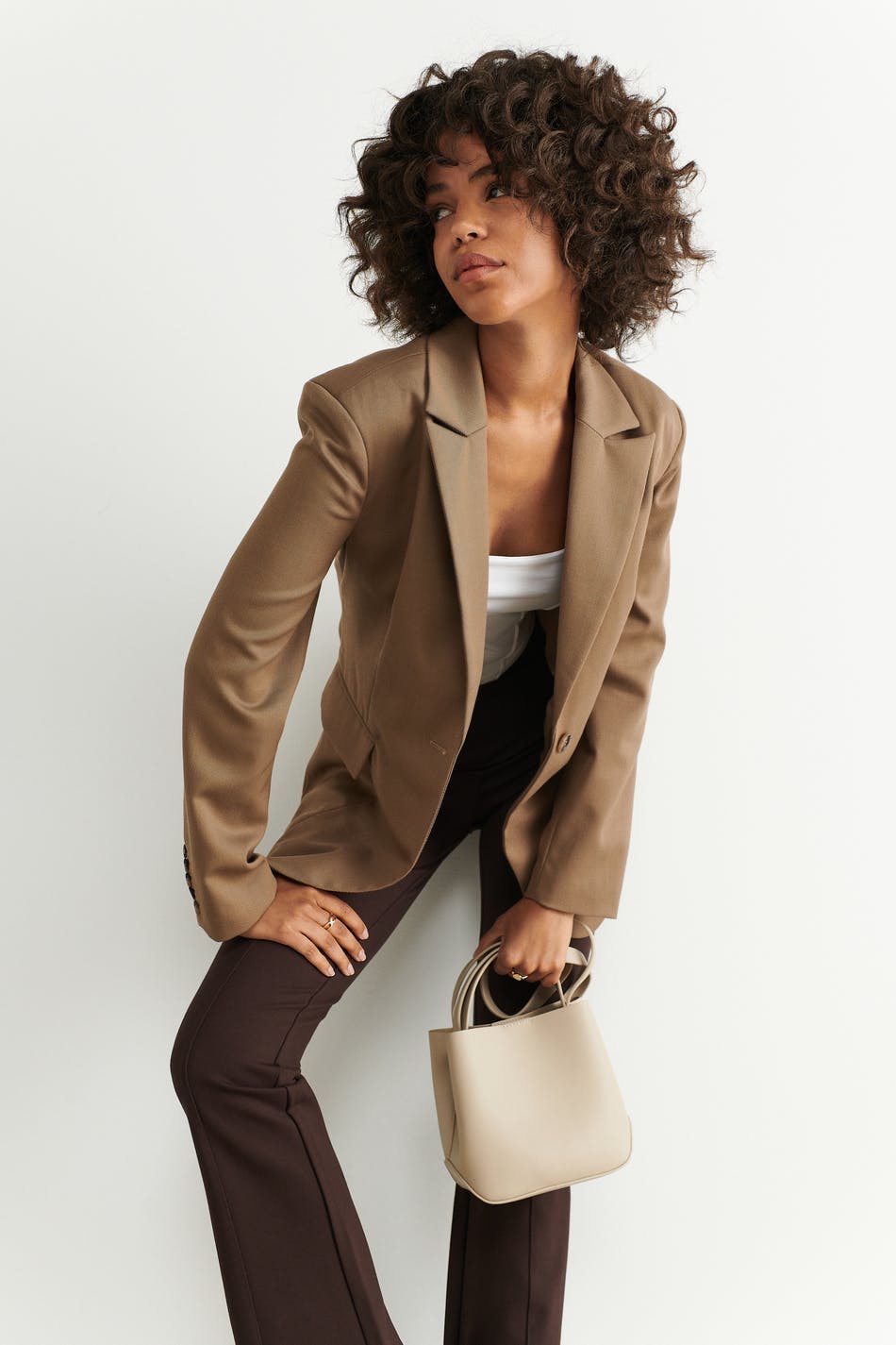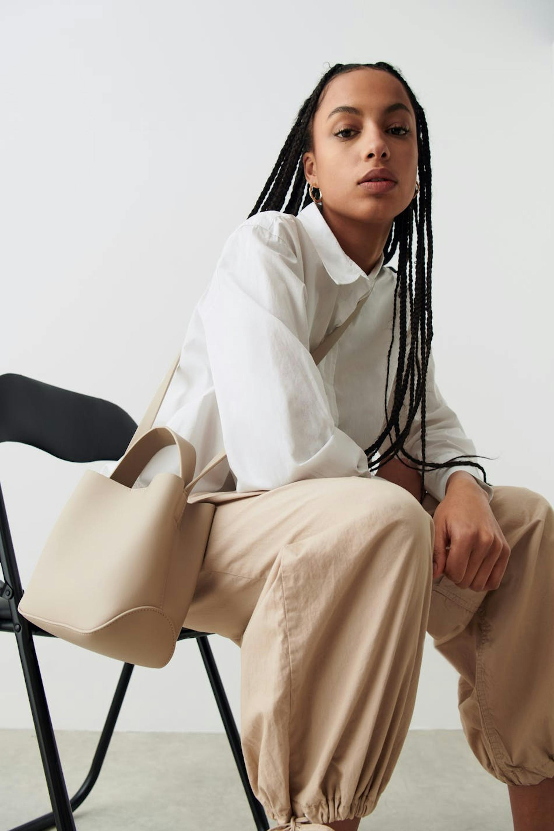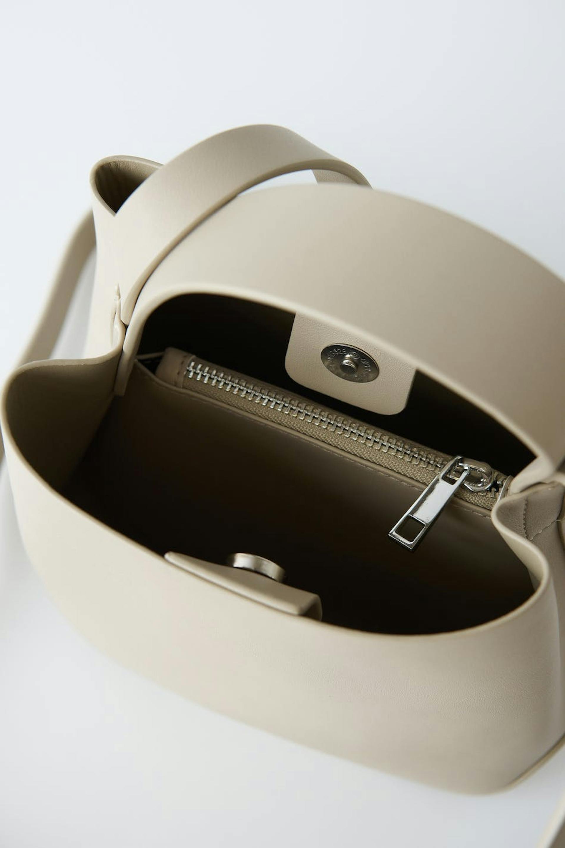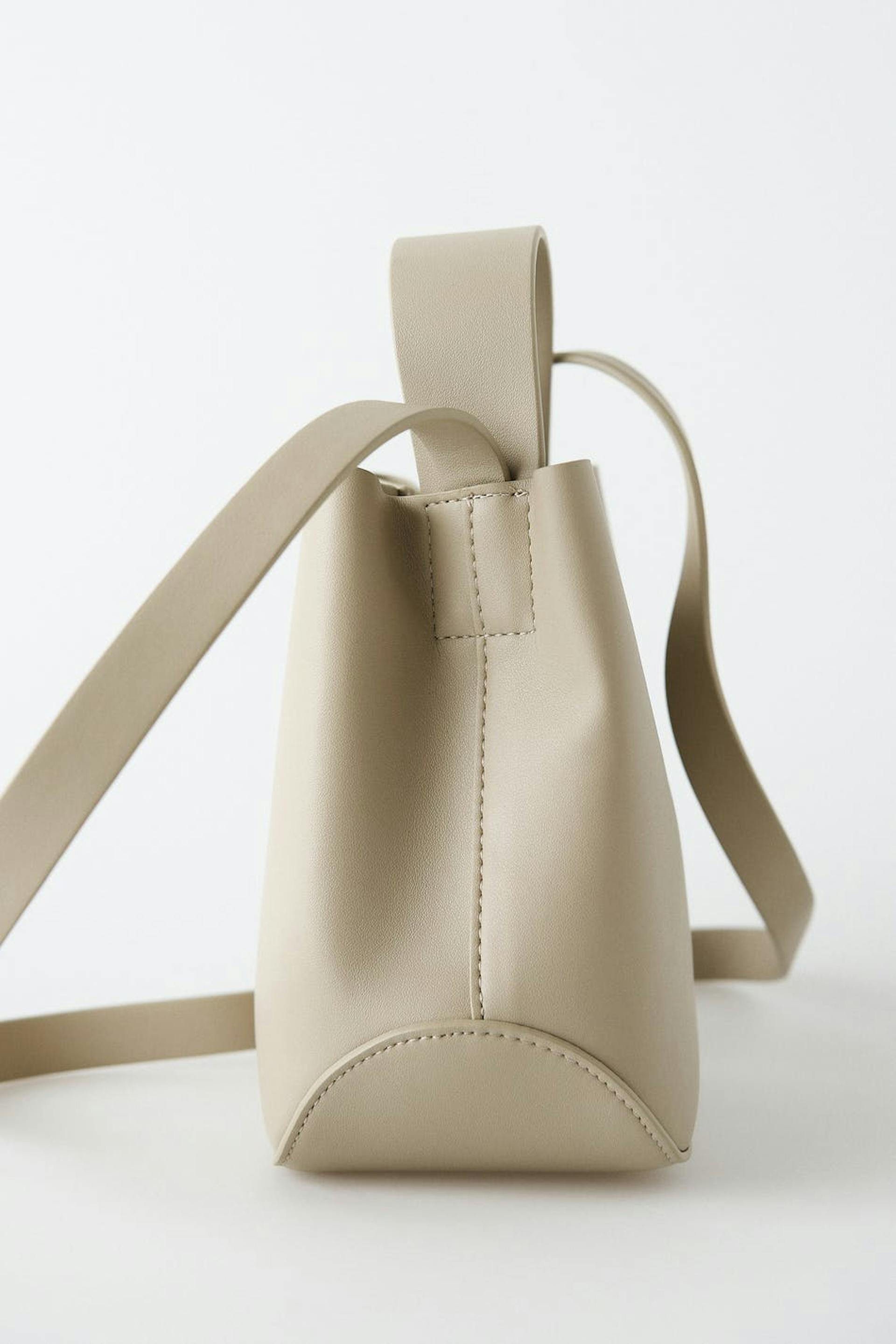 Bag in PU with small handle at the top. The bag is beige and has a long shoulder strap. It has an inner compartment and closure with metallic button.