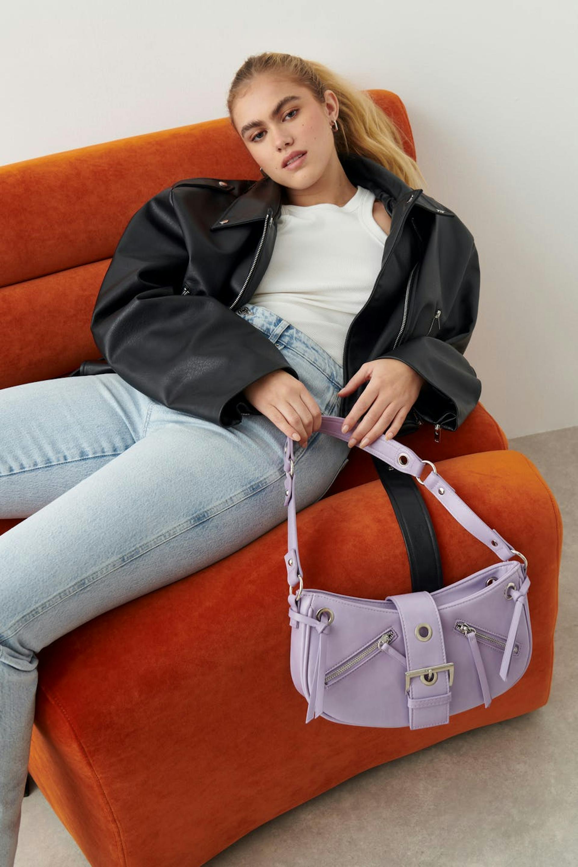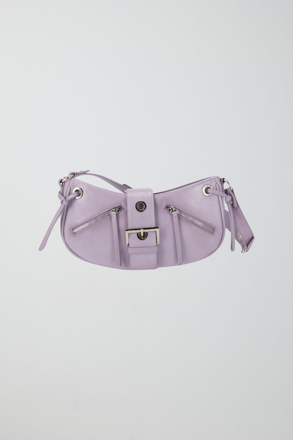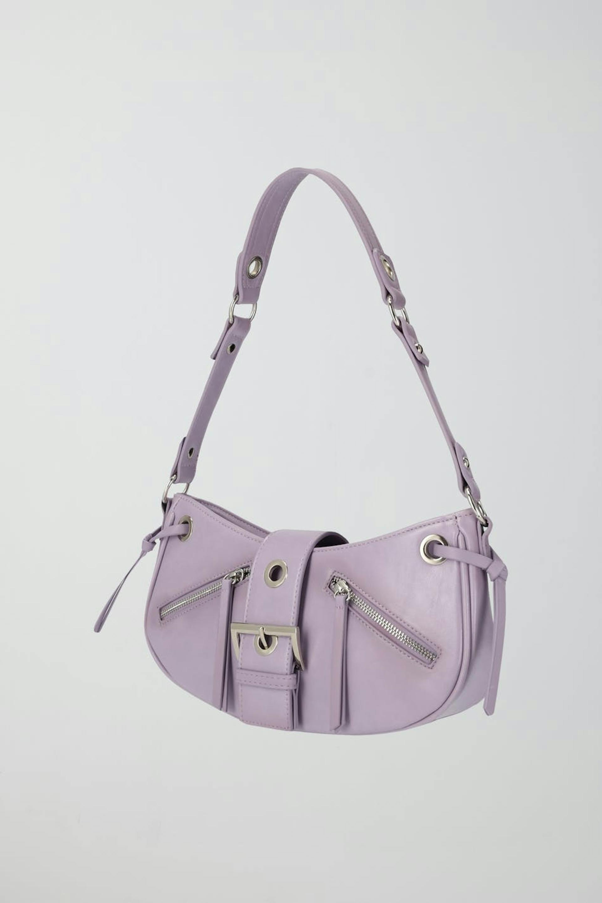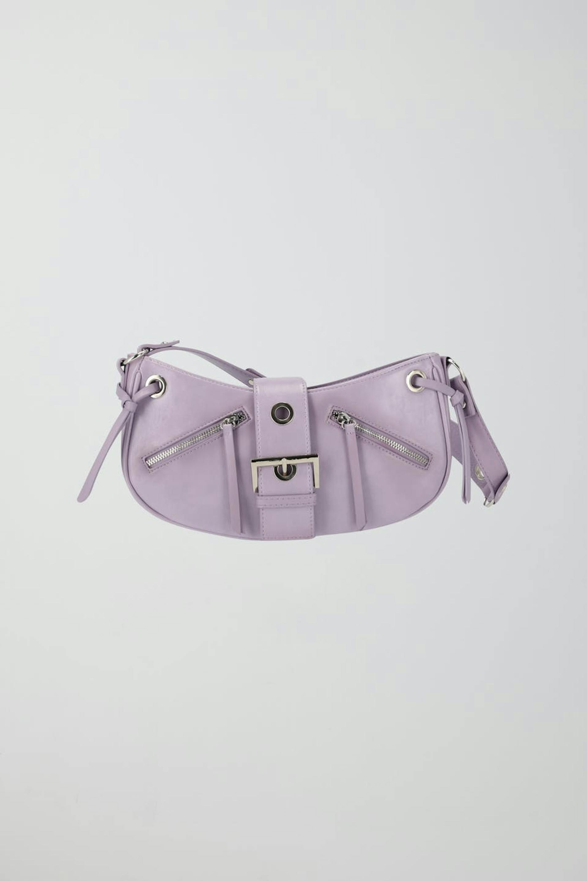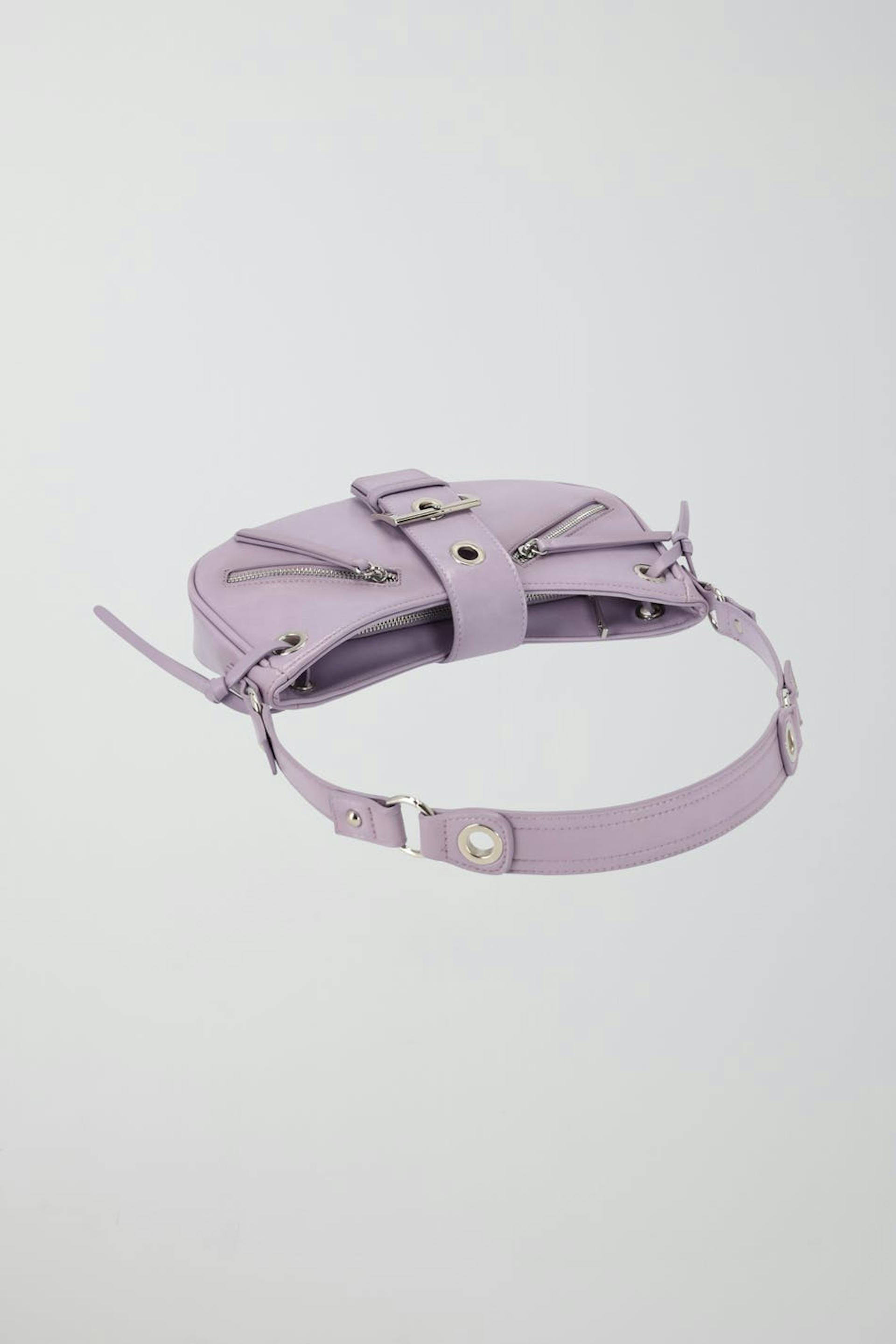 Y2K-inspired shoulder bag in imitation leather with studded details. The bag is purple and has zip closure at the top. It has short shoulder strap, silver coloured details, zippers and metal fastener at the front.