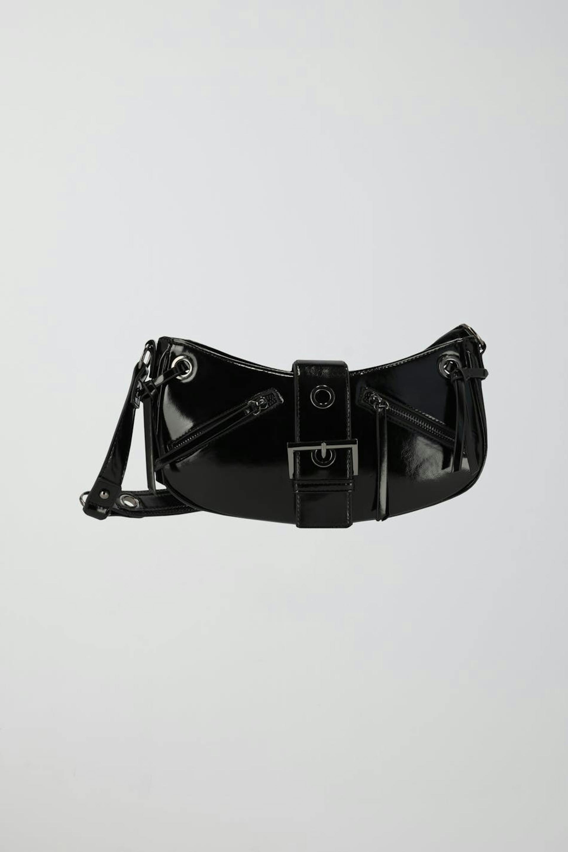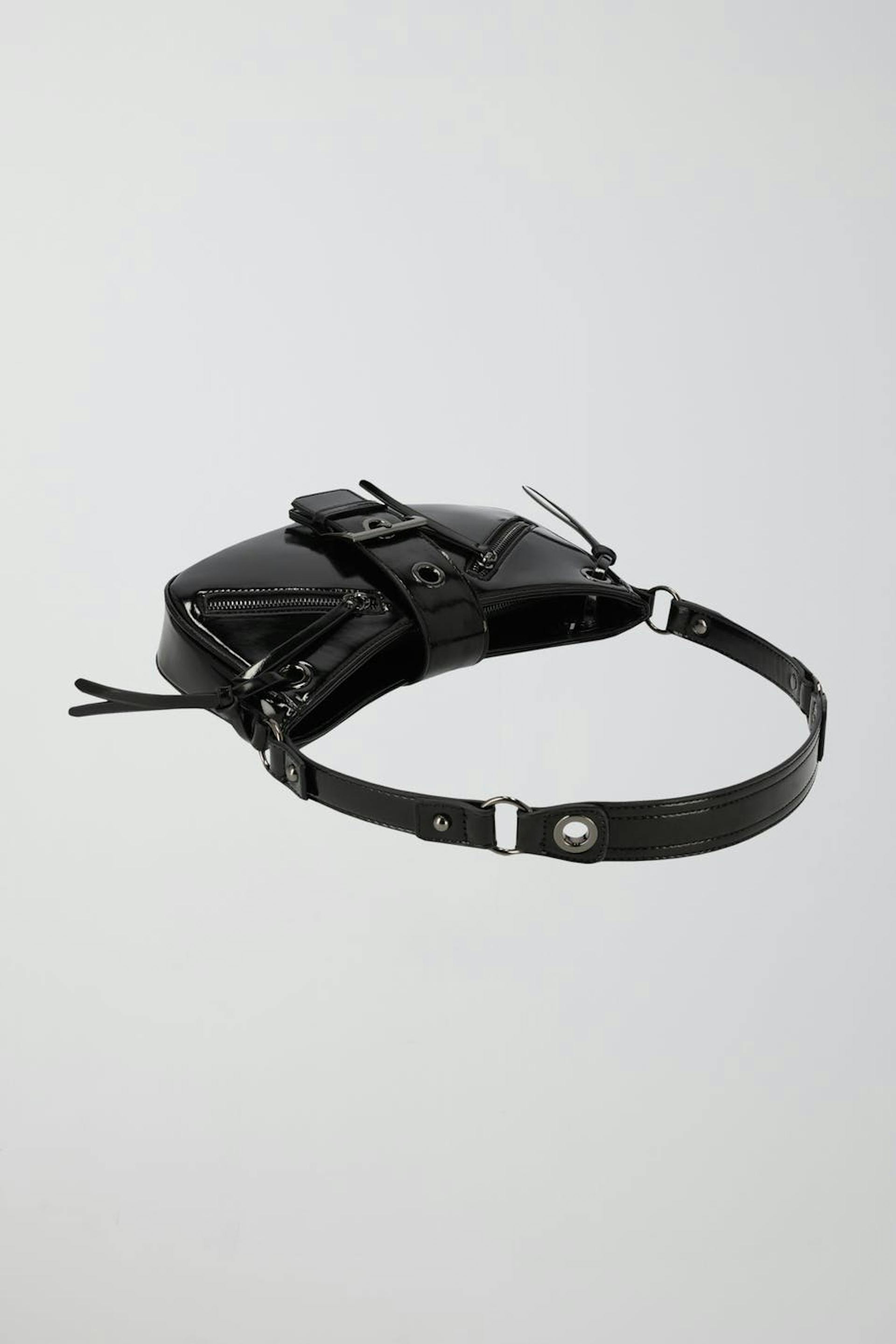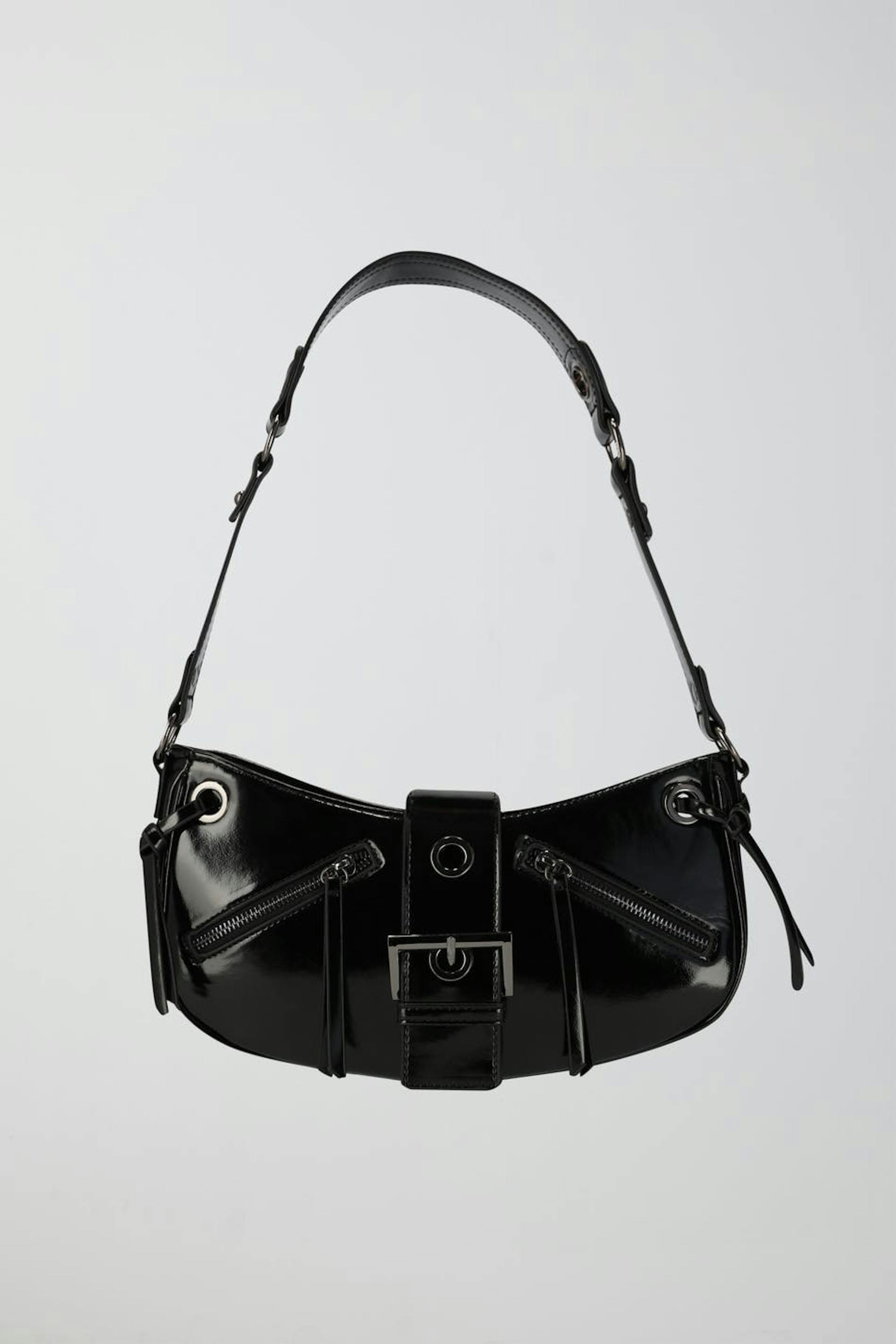 Y2K-inspired shoulder bag in imitation leather with studded details. The bag is black and has zip closure at the top. It has short shoulder strap, silver coloured details, zippers and metal fastener at the front.