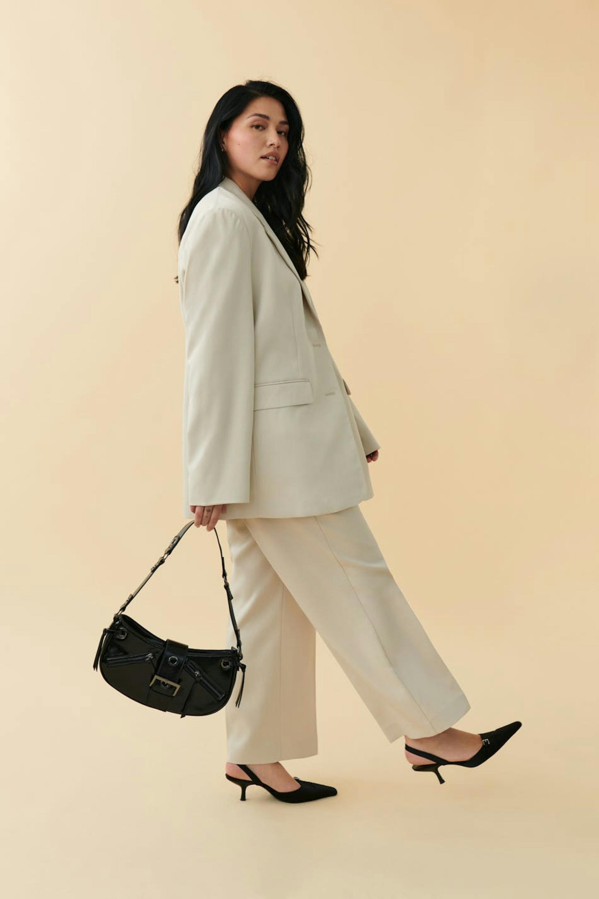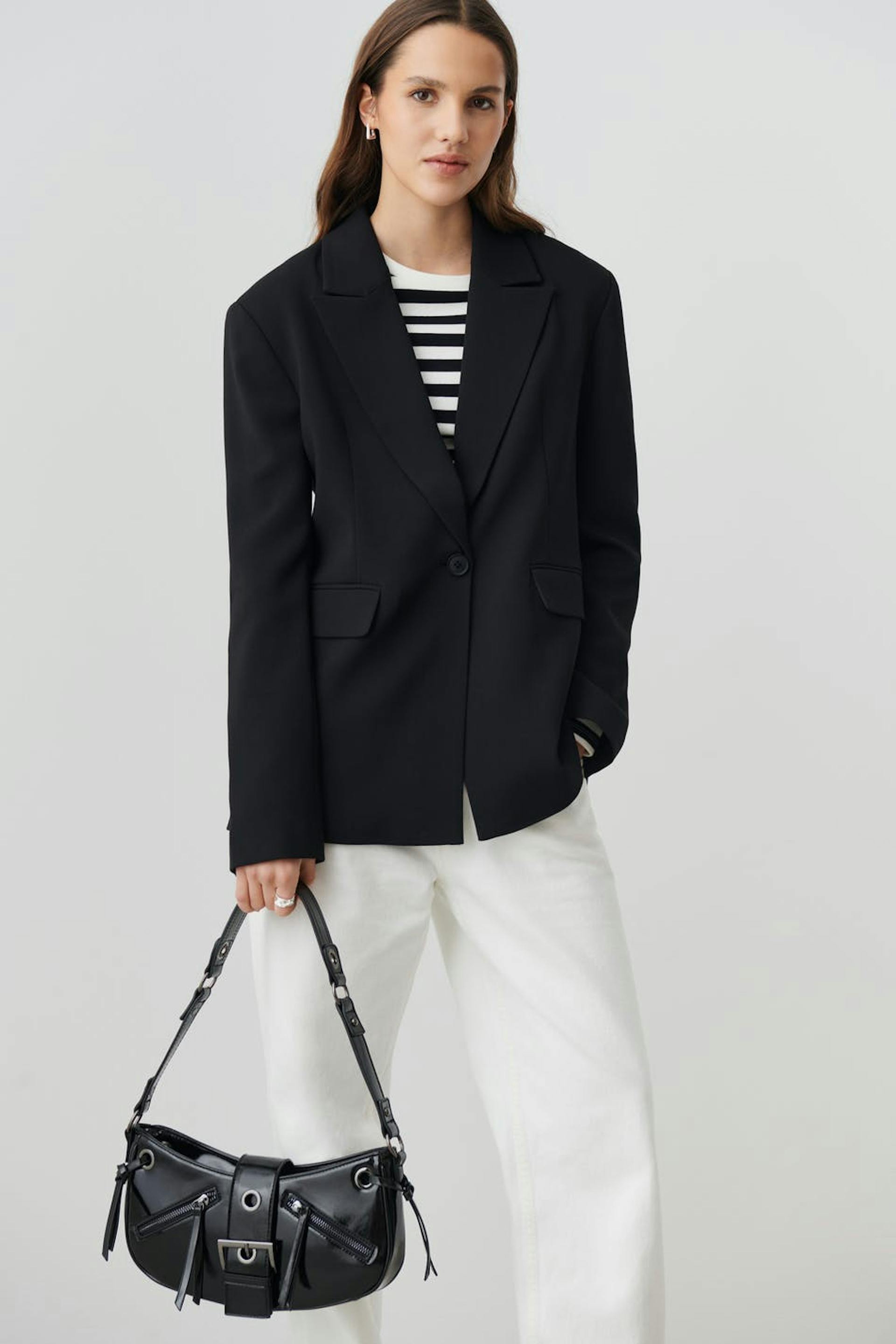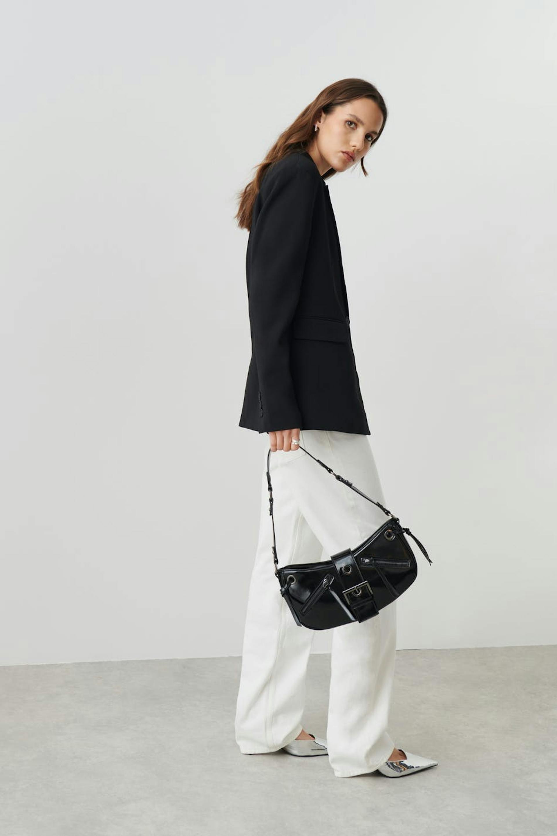 Y2K-inspired shoulder bag in imitation leather with studded details. The bag is black and has zip closure at the top. It has short shoulder strap, silver coloured details, zippers and metal fastener at the front.