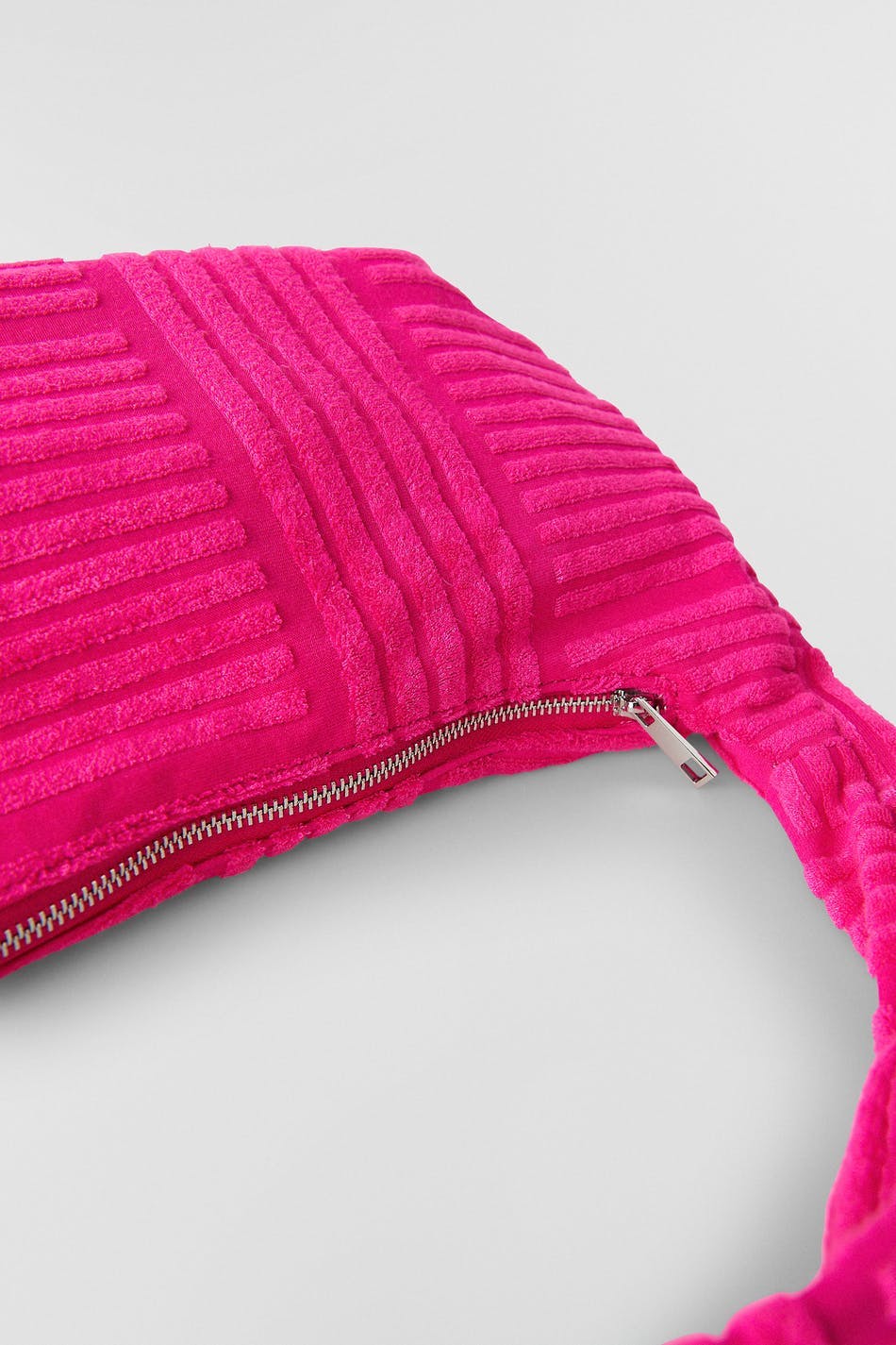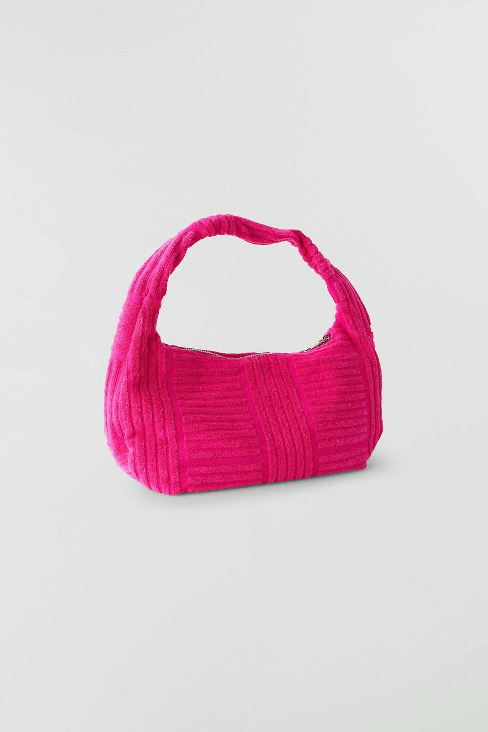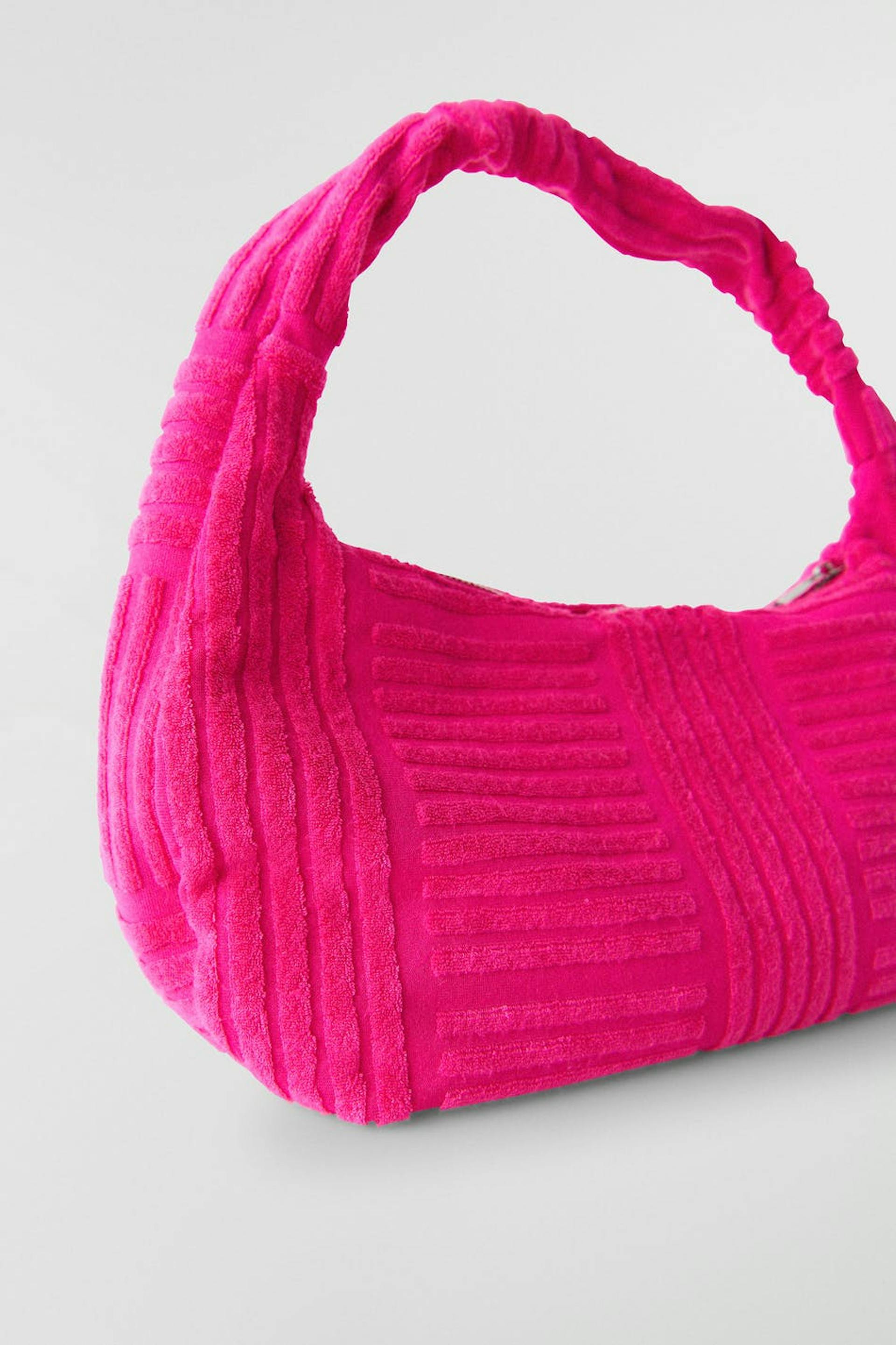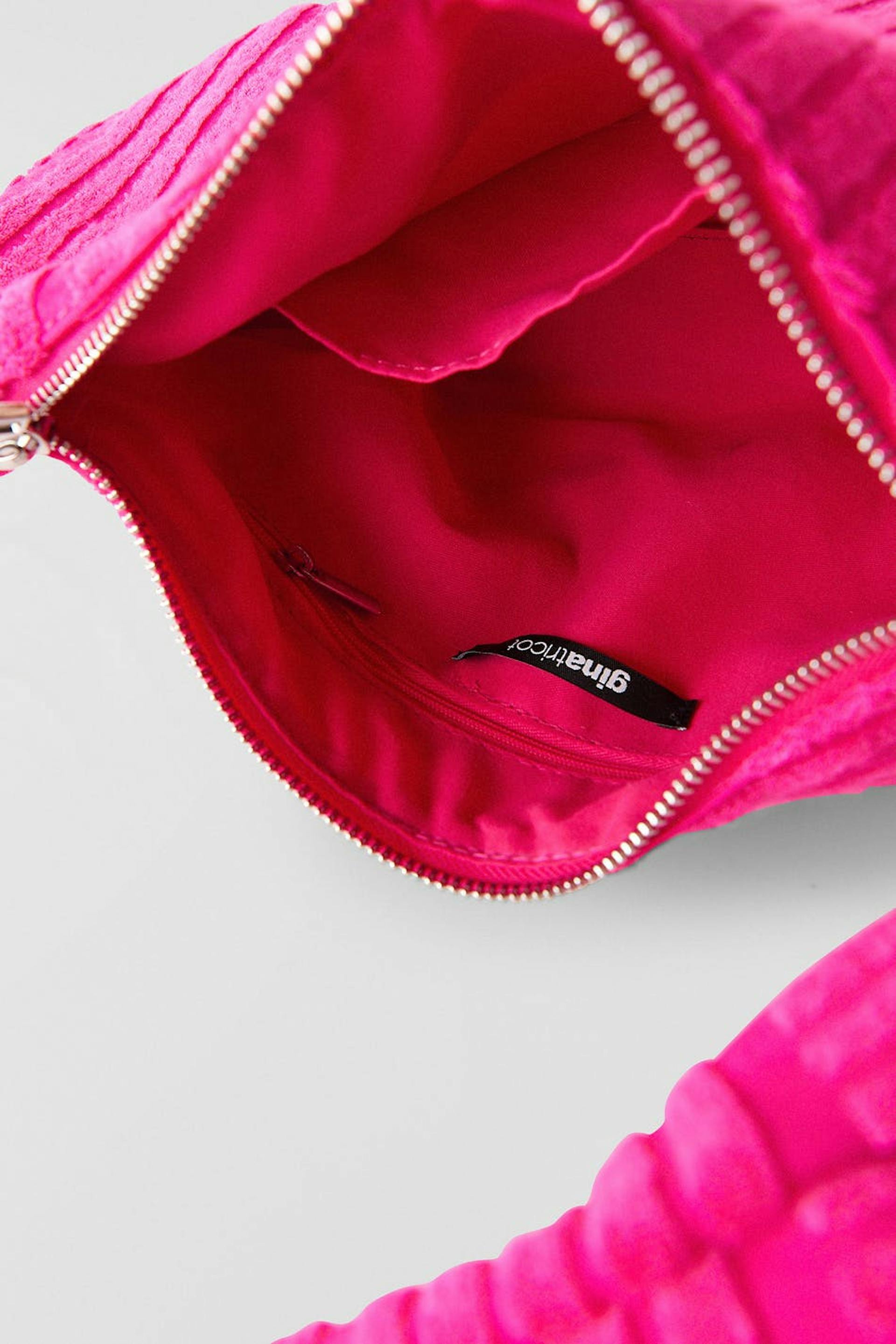 Debossed bag in polyurethane with a silvery chain at the top. The bag is pink.