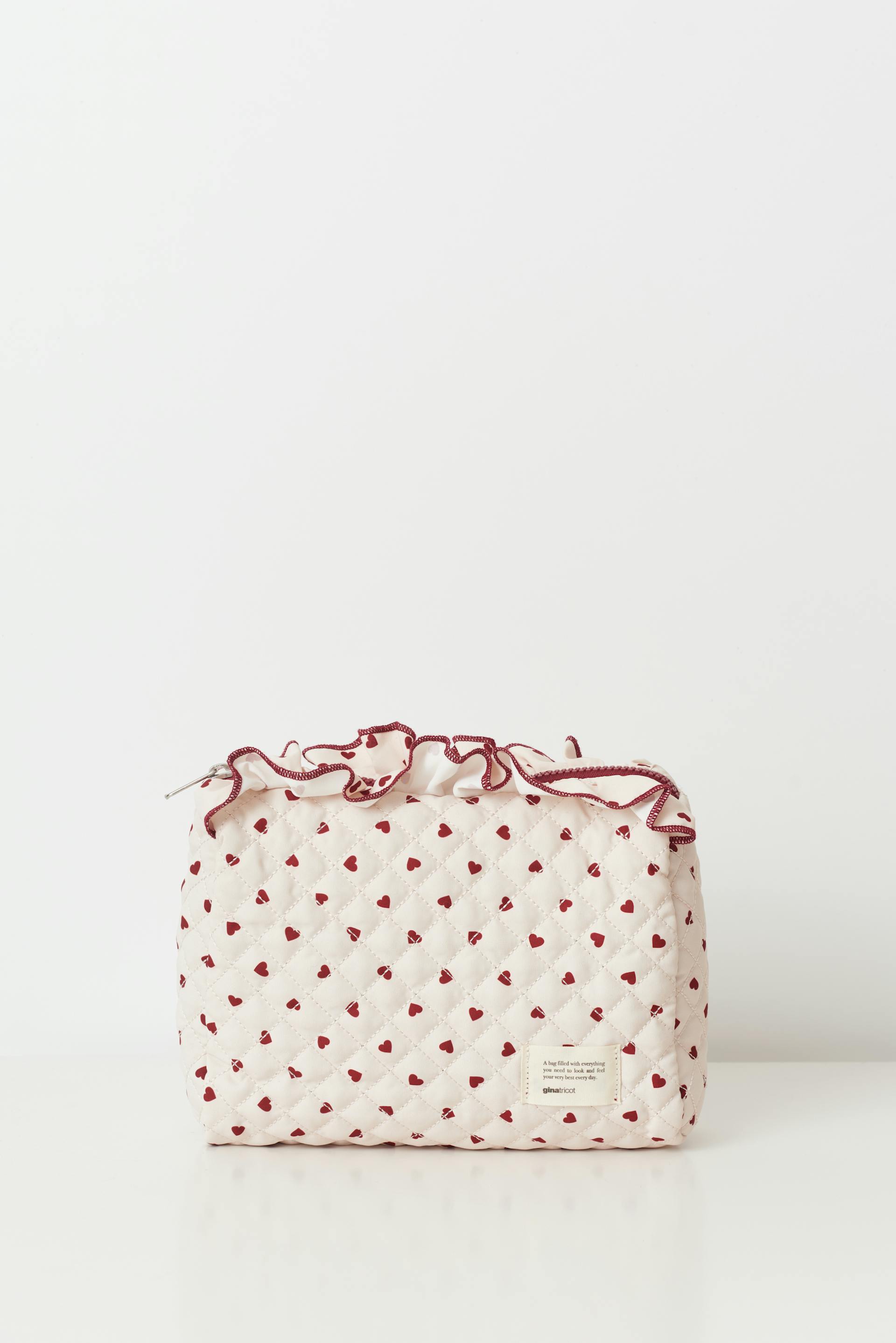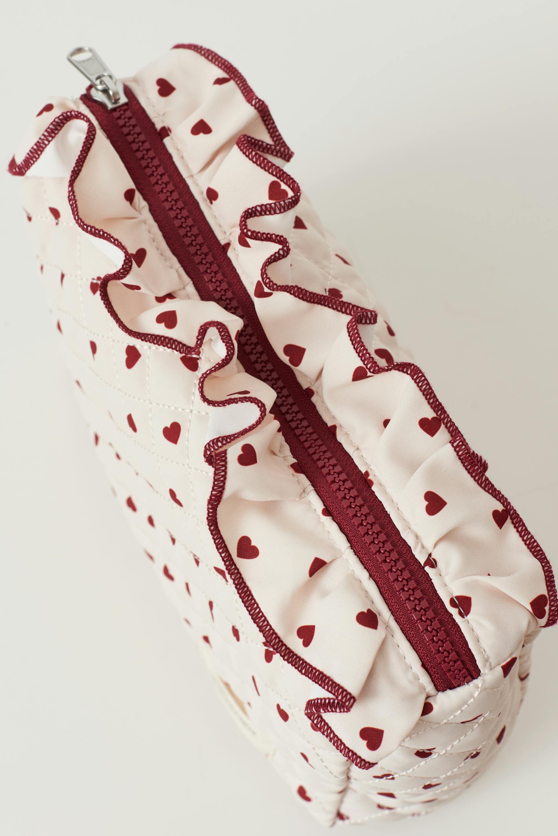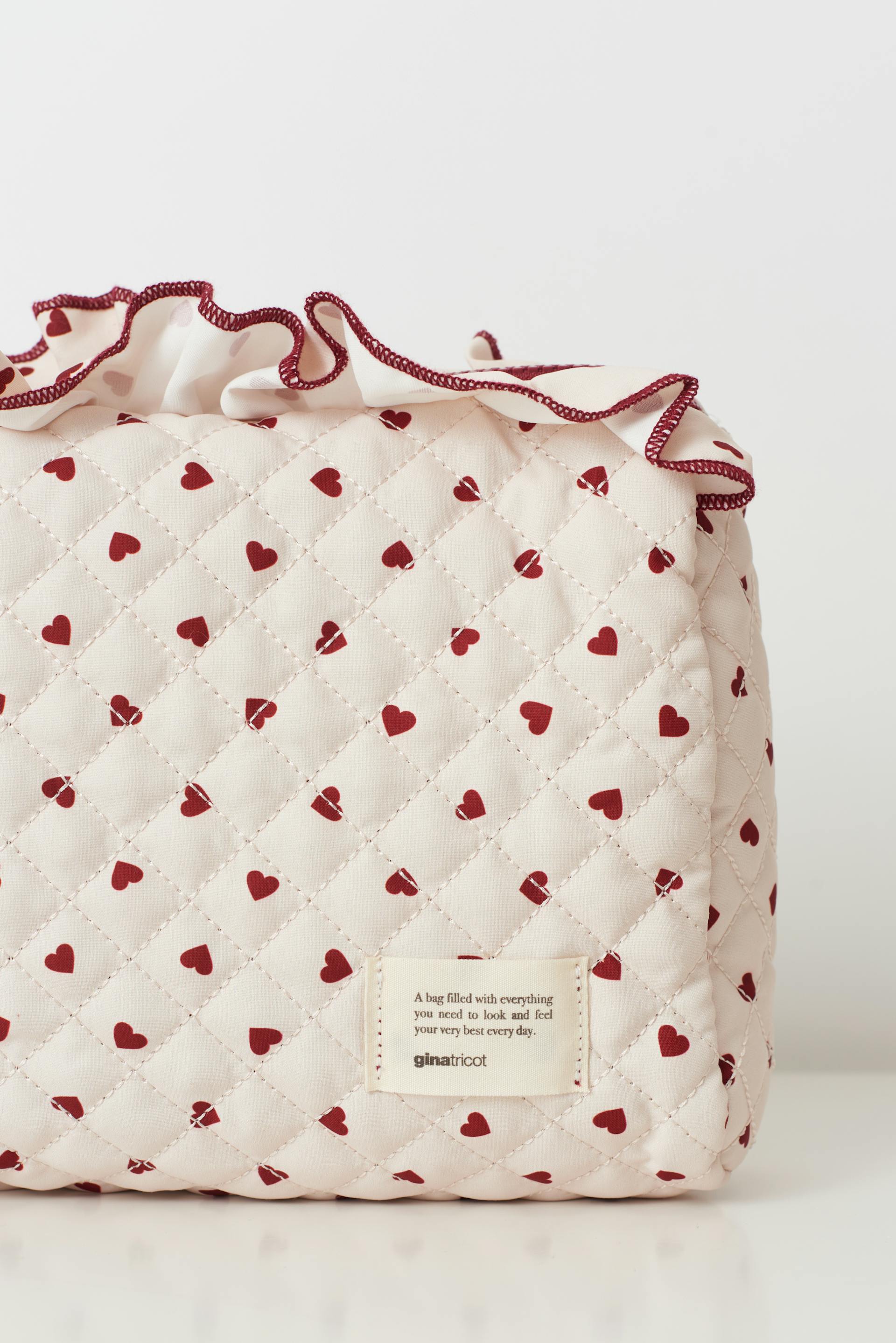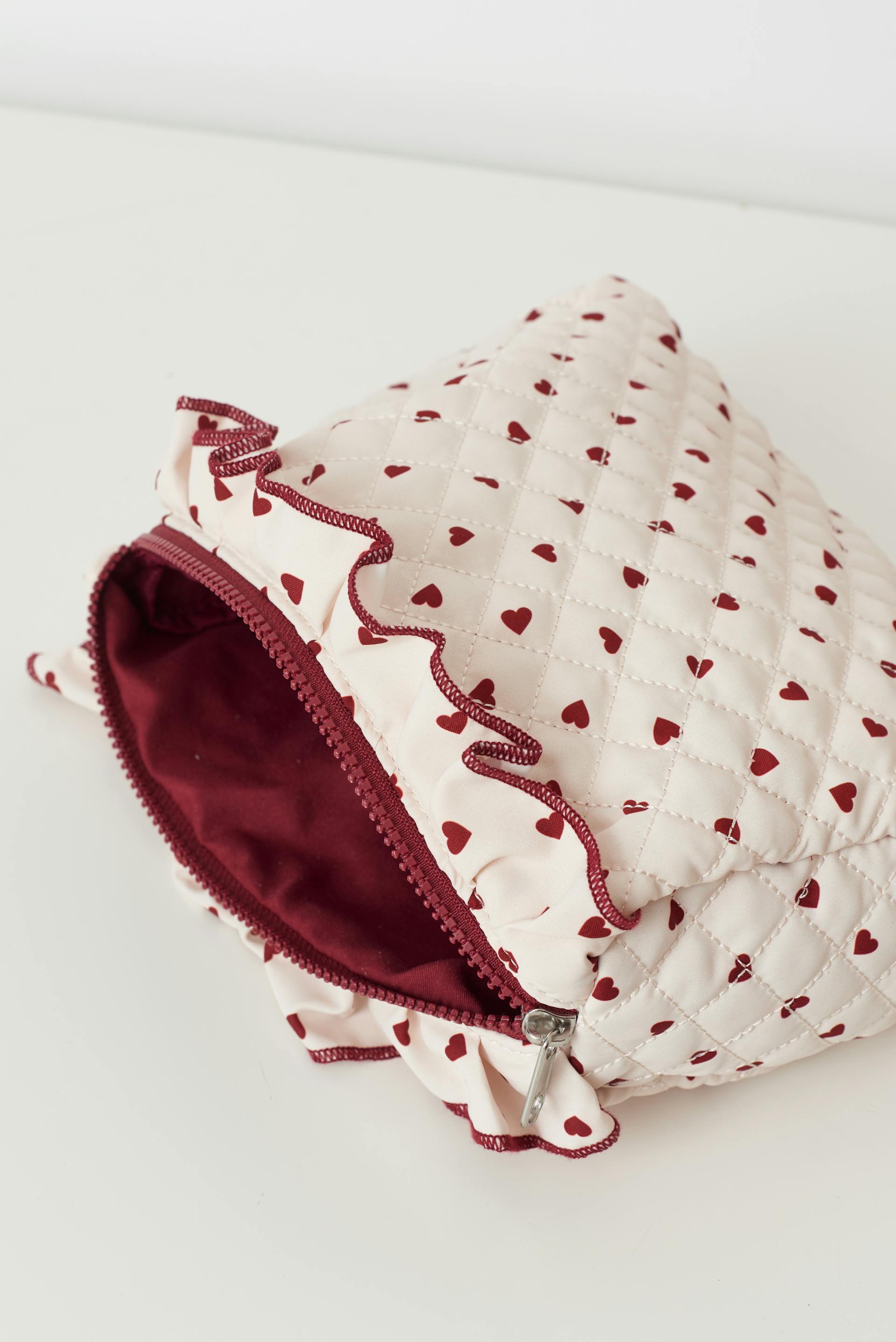 Quilted wash bag with small hearts. The wash bag is light beige and has frills at the top. It has zip closure, patch at the bottom and red lining.