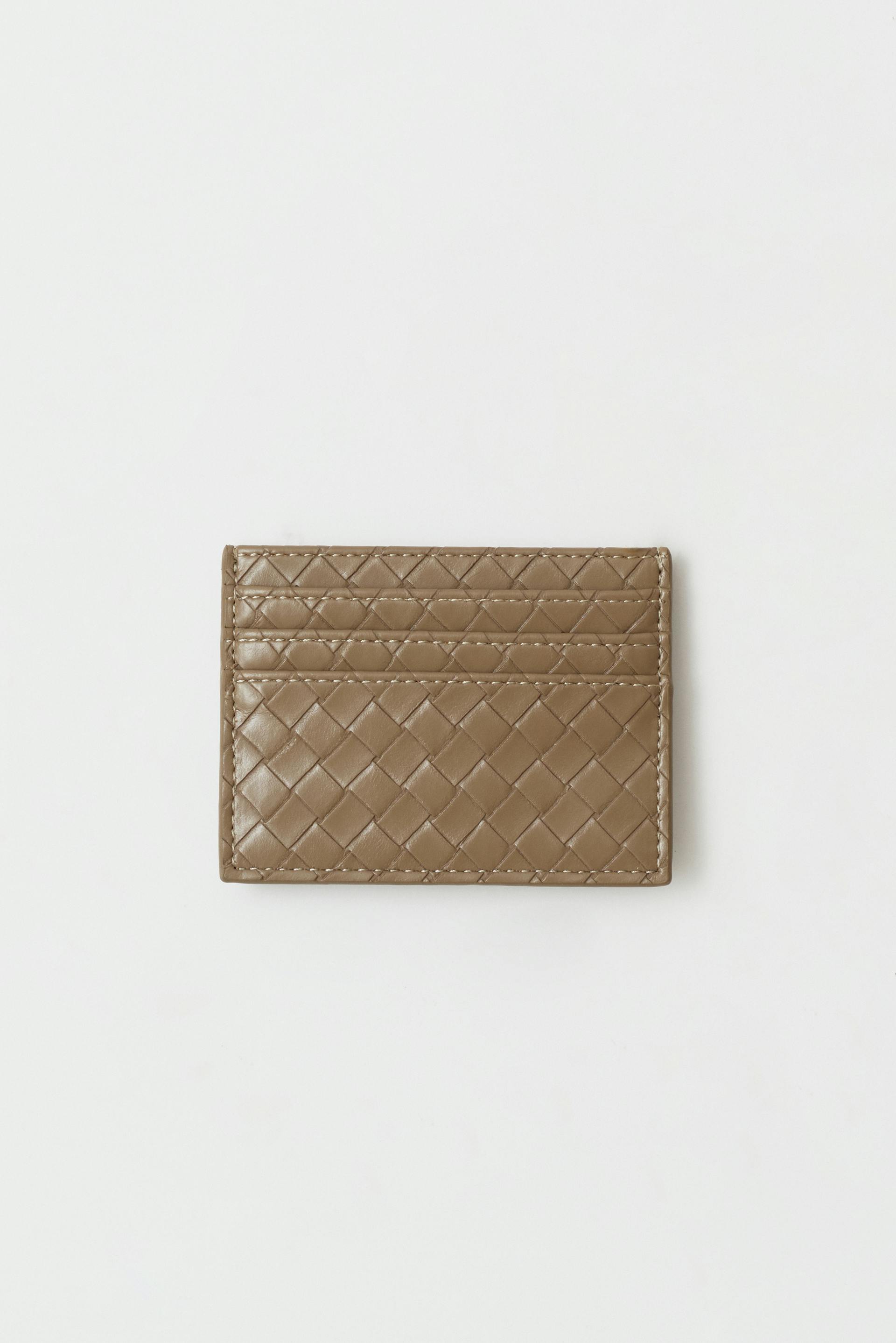Braided card holder in imitation leather with multiple compartments. The card holder is green.