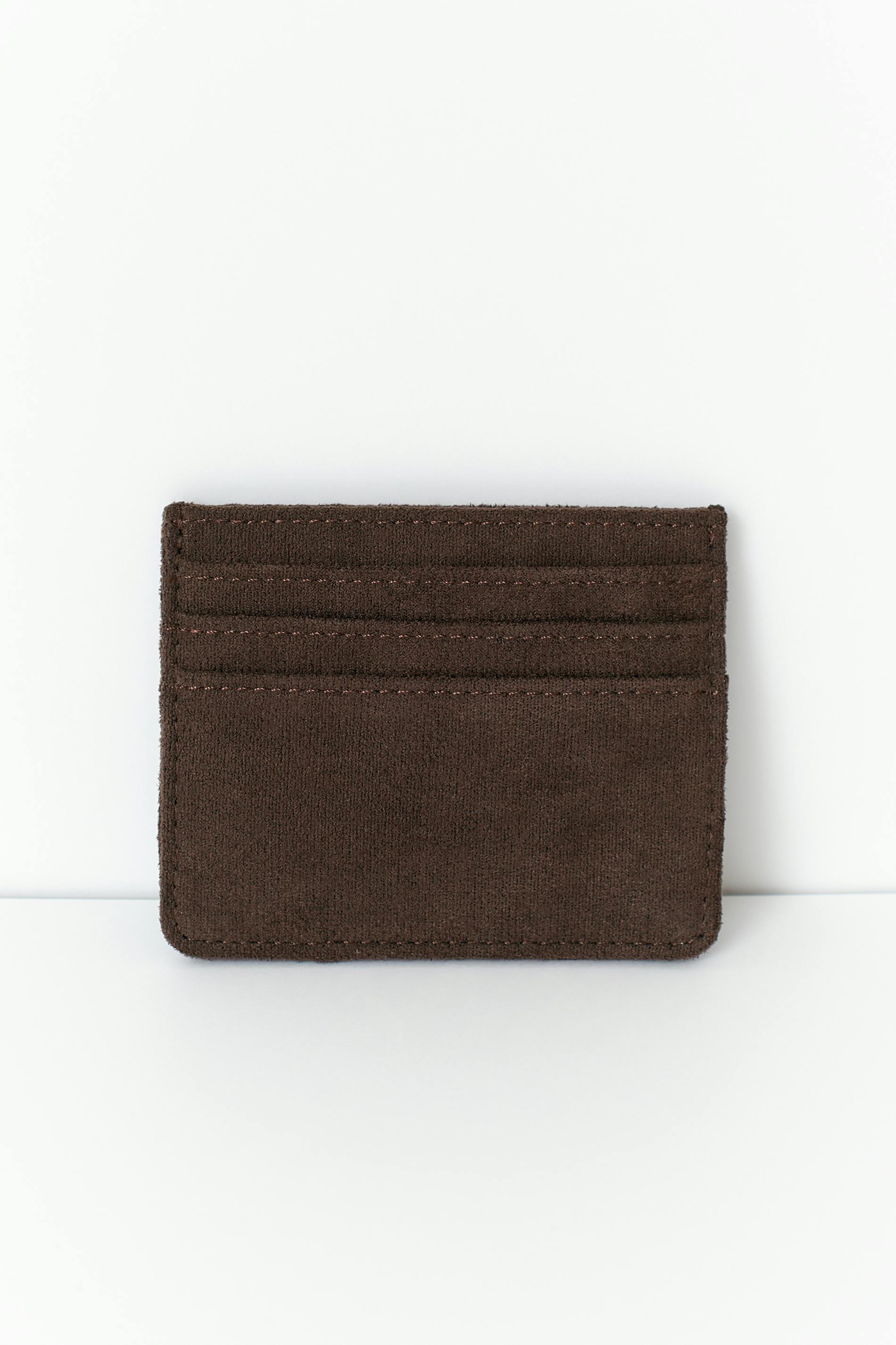 Card holder in denim fabric with multiple compartments. The card holder is brown and has decorative seams.