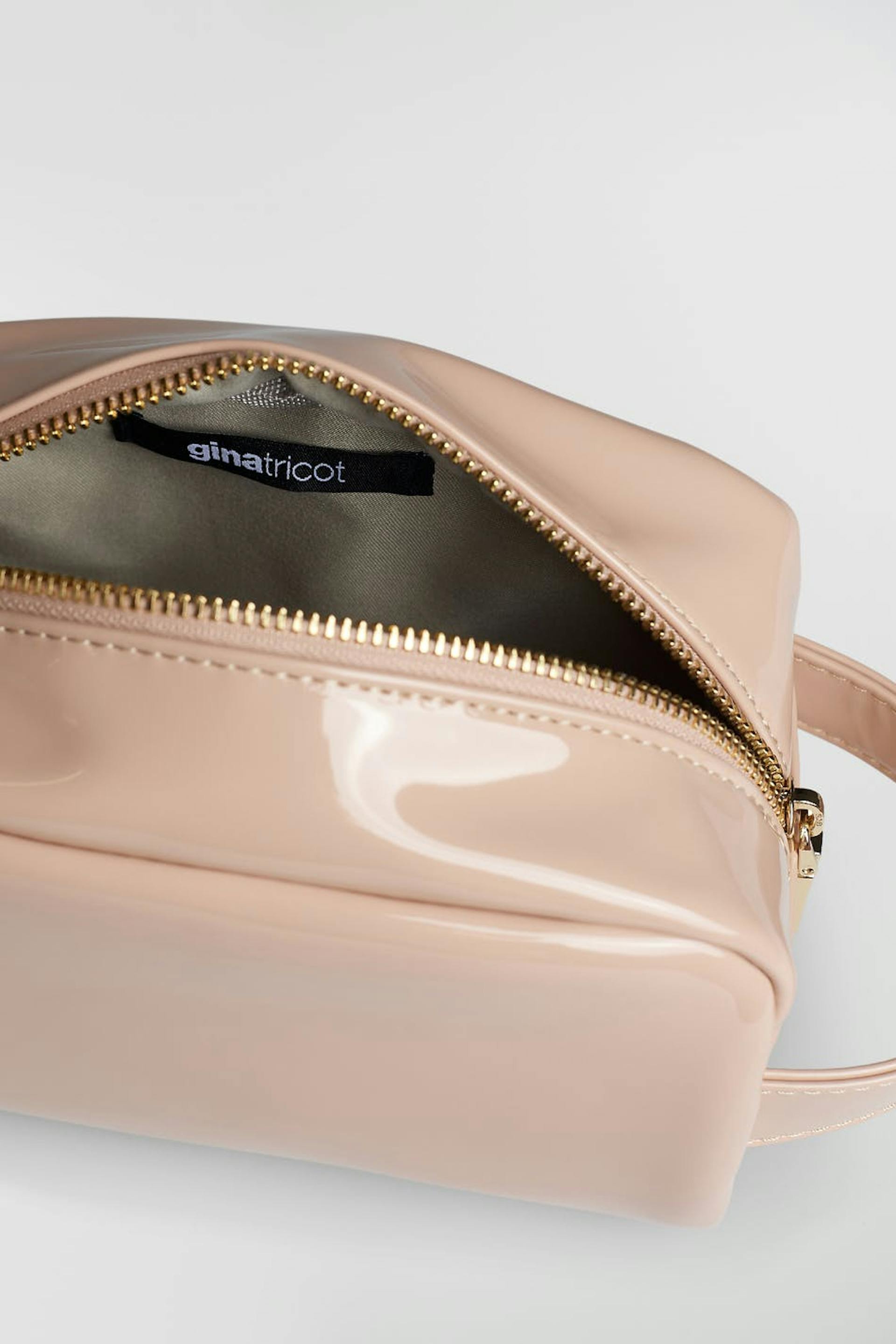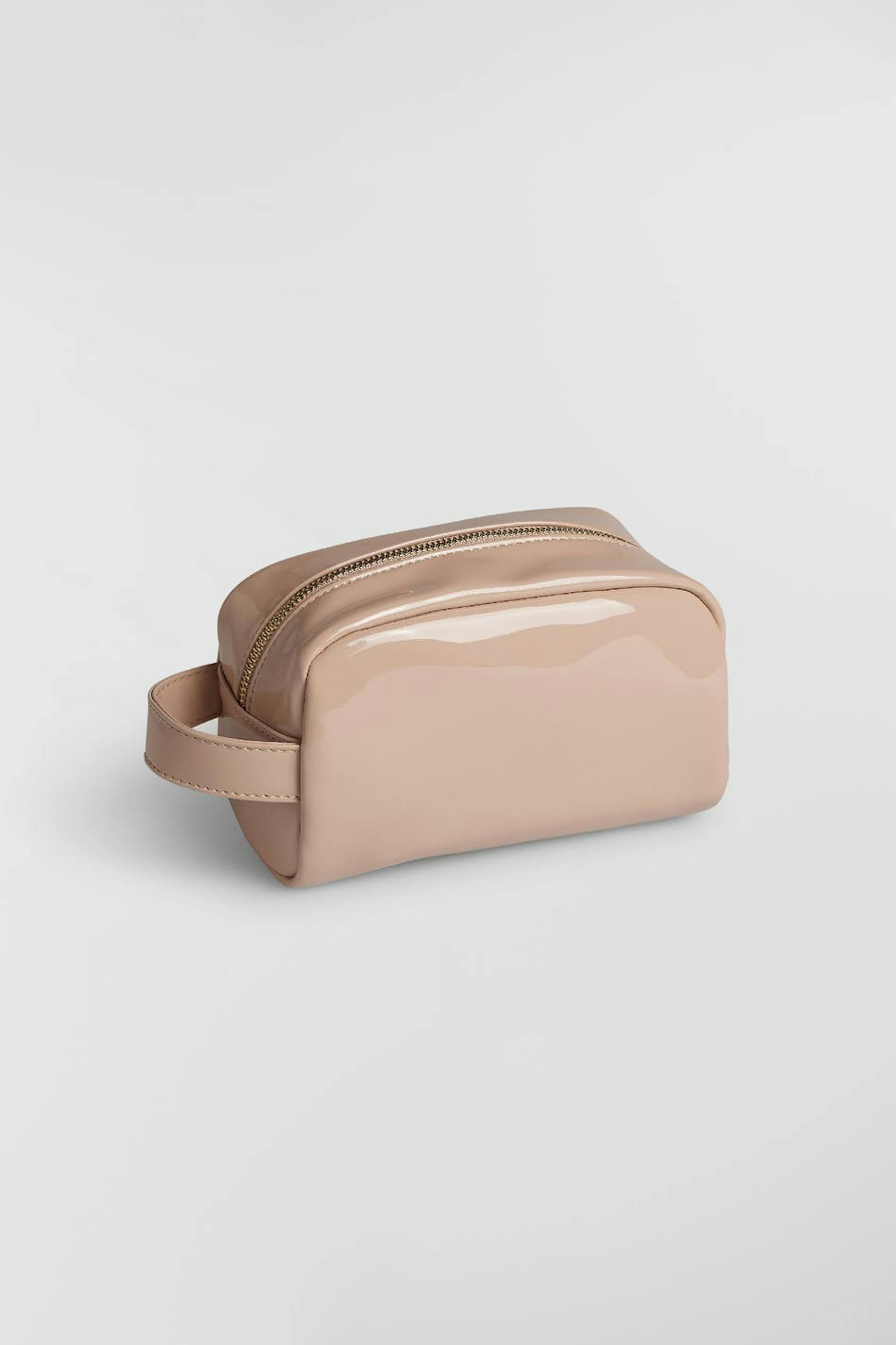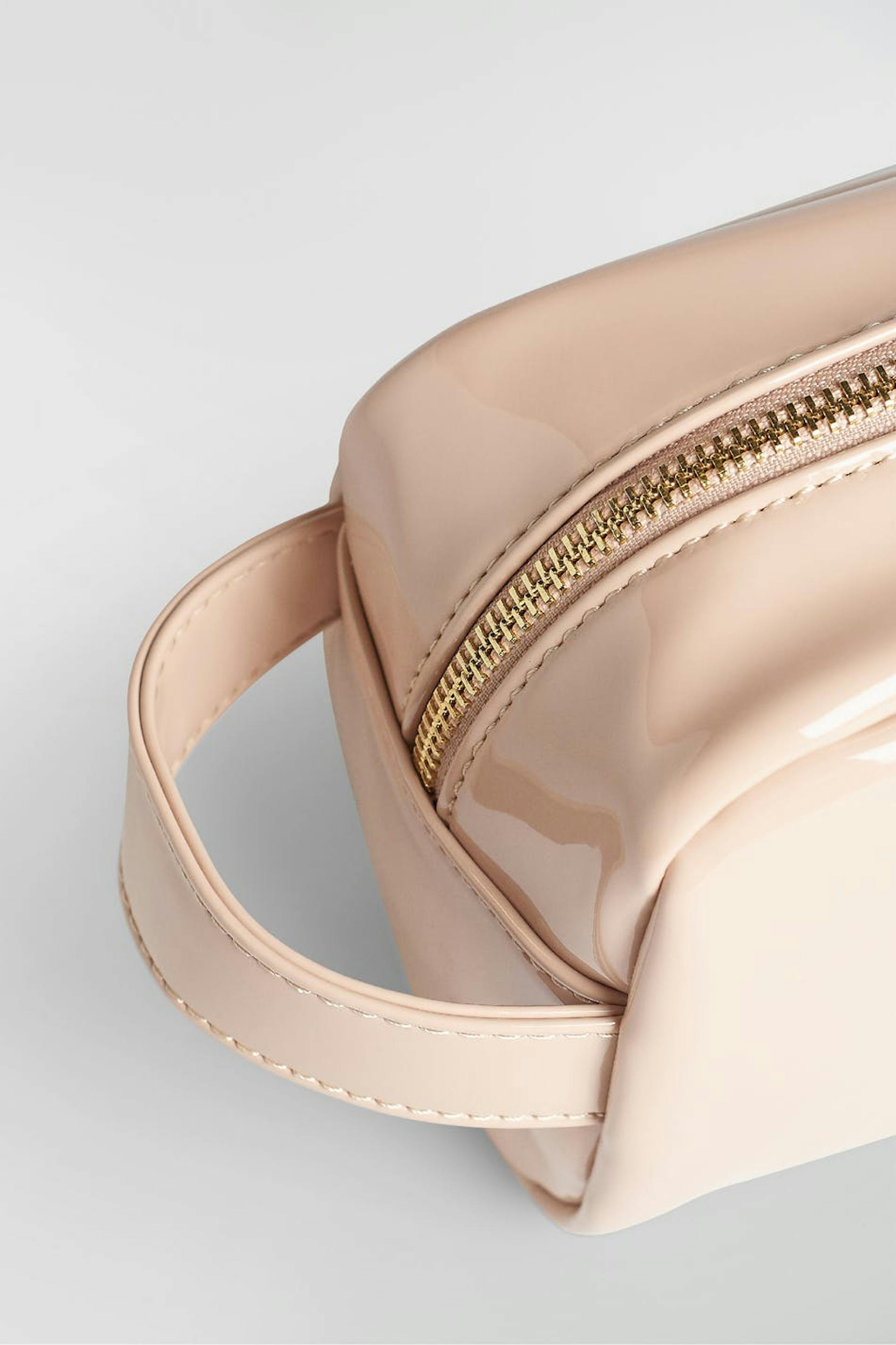 Wash bag with a zip on top. The wash bag is beige and has a handle at the side.