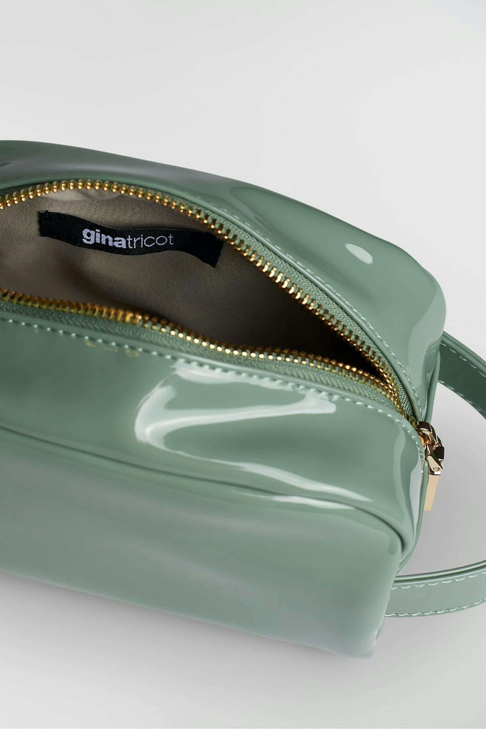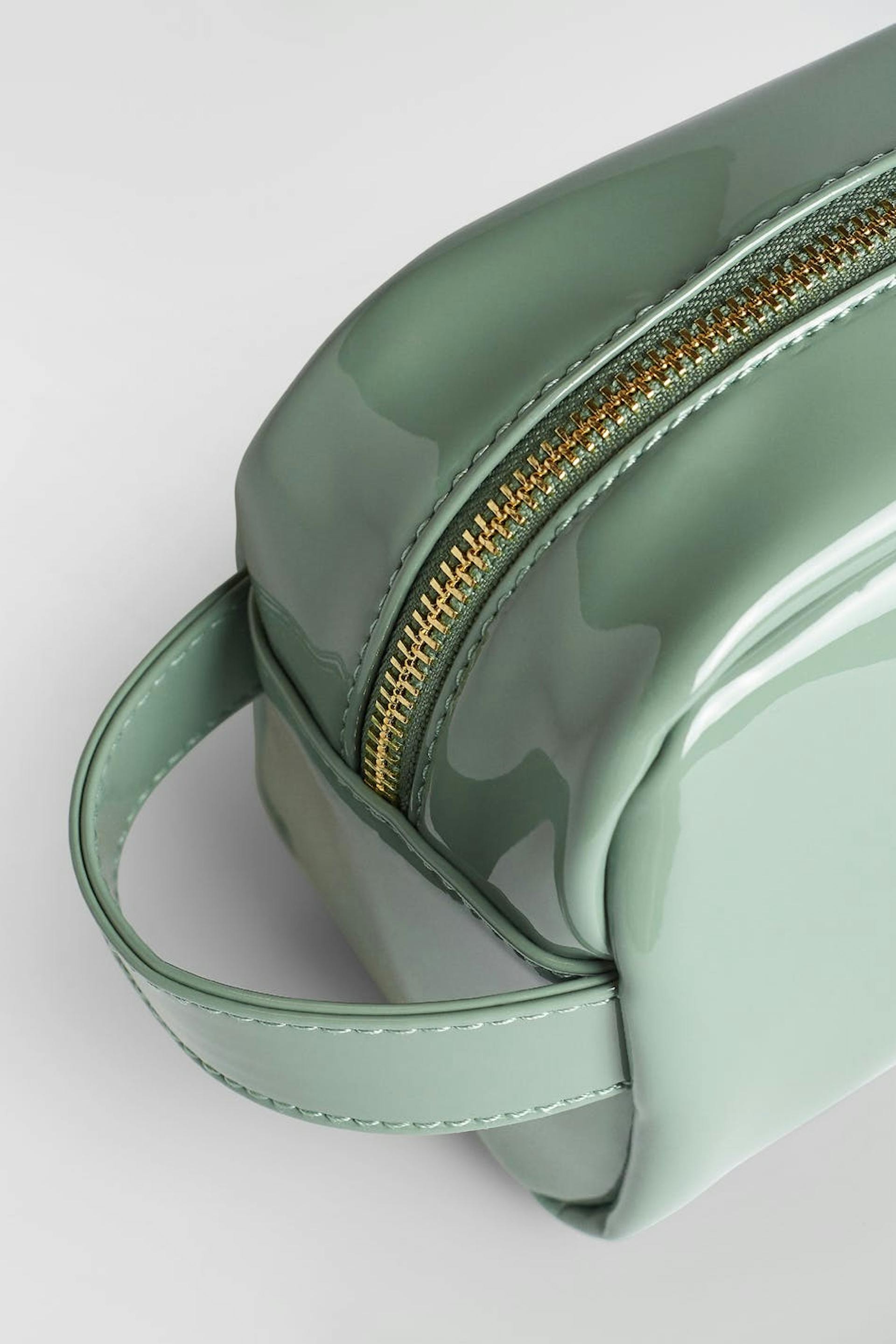 Wash bag with a handle at the side. The wash bag is green and has a zip on top.