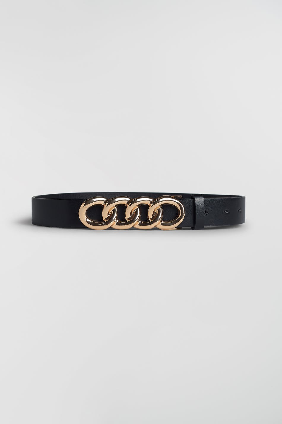 Belt with a gold coloured buckle. The belt is black. It is made of PU.