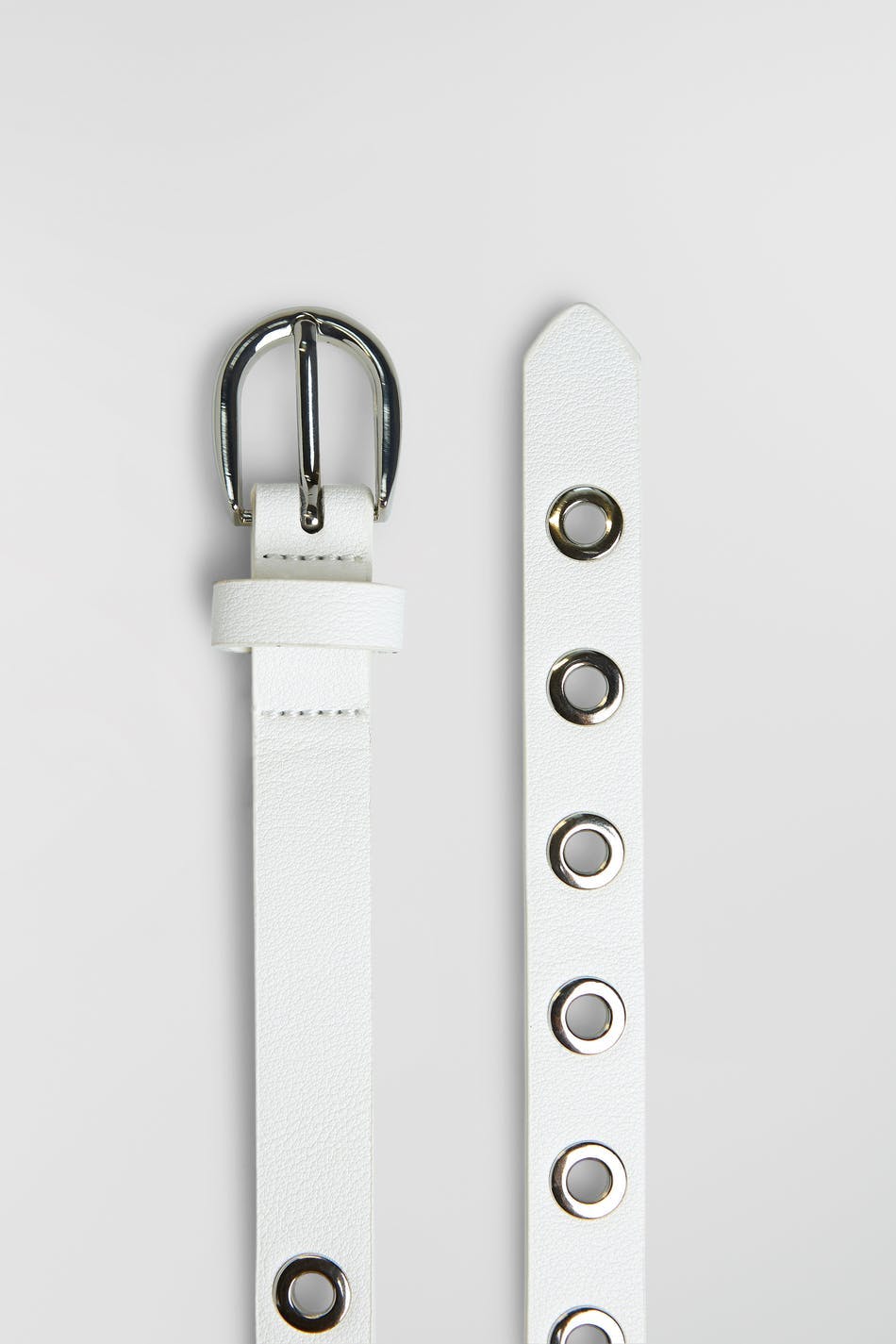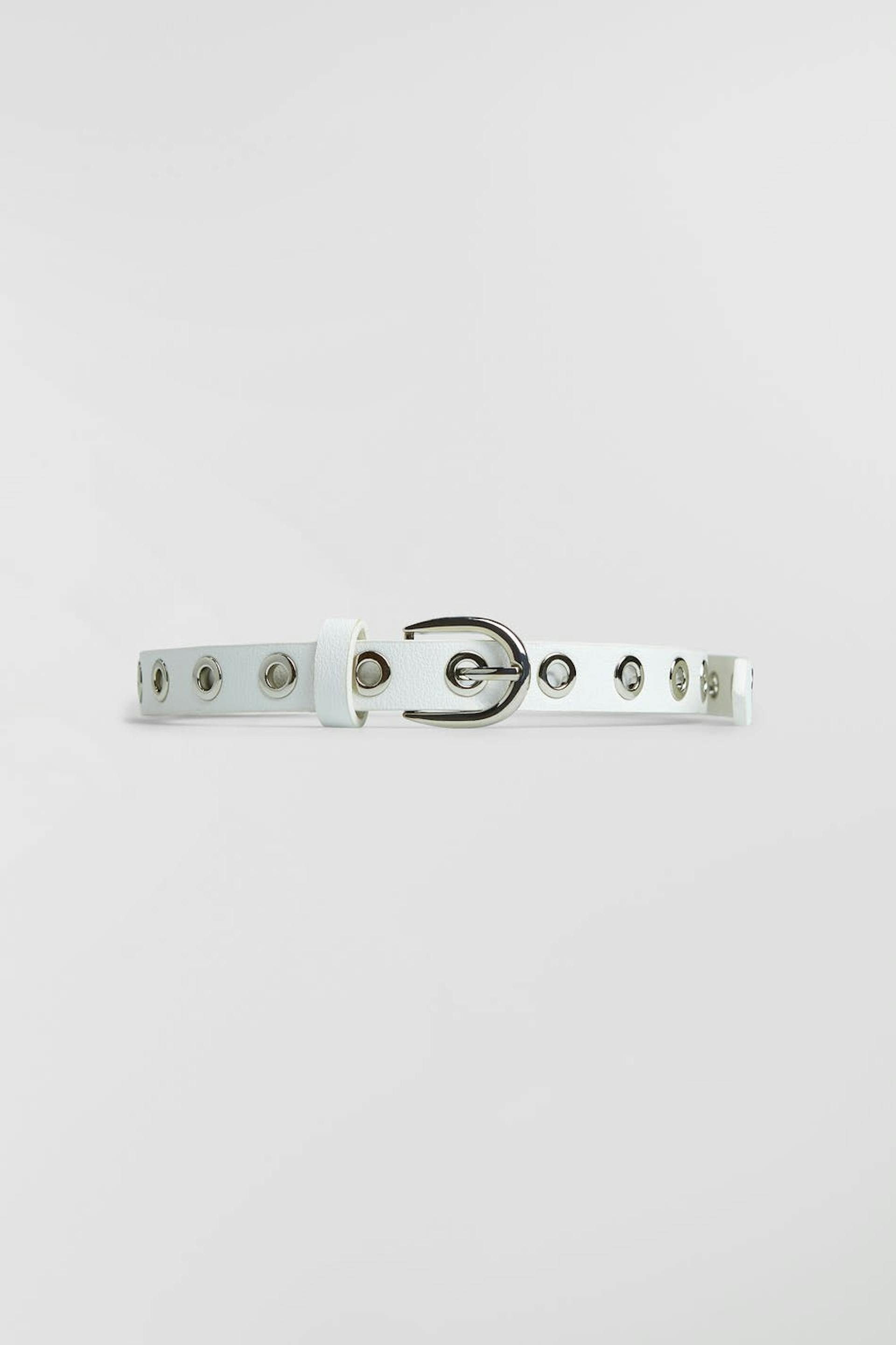 Belt with a buckle in metal. The belt is white and has gold coloured details. It is made of PU.