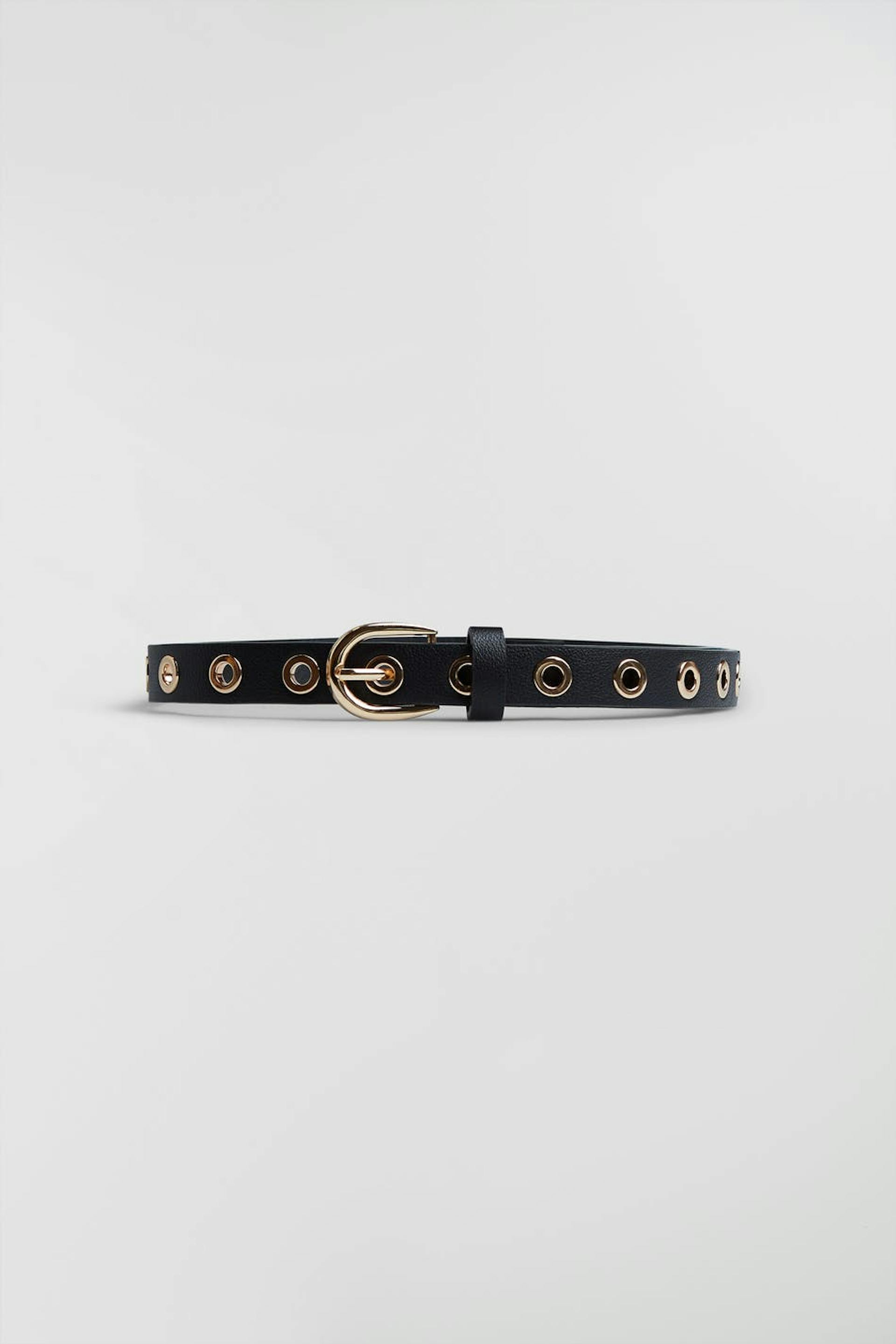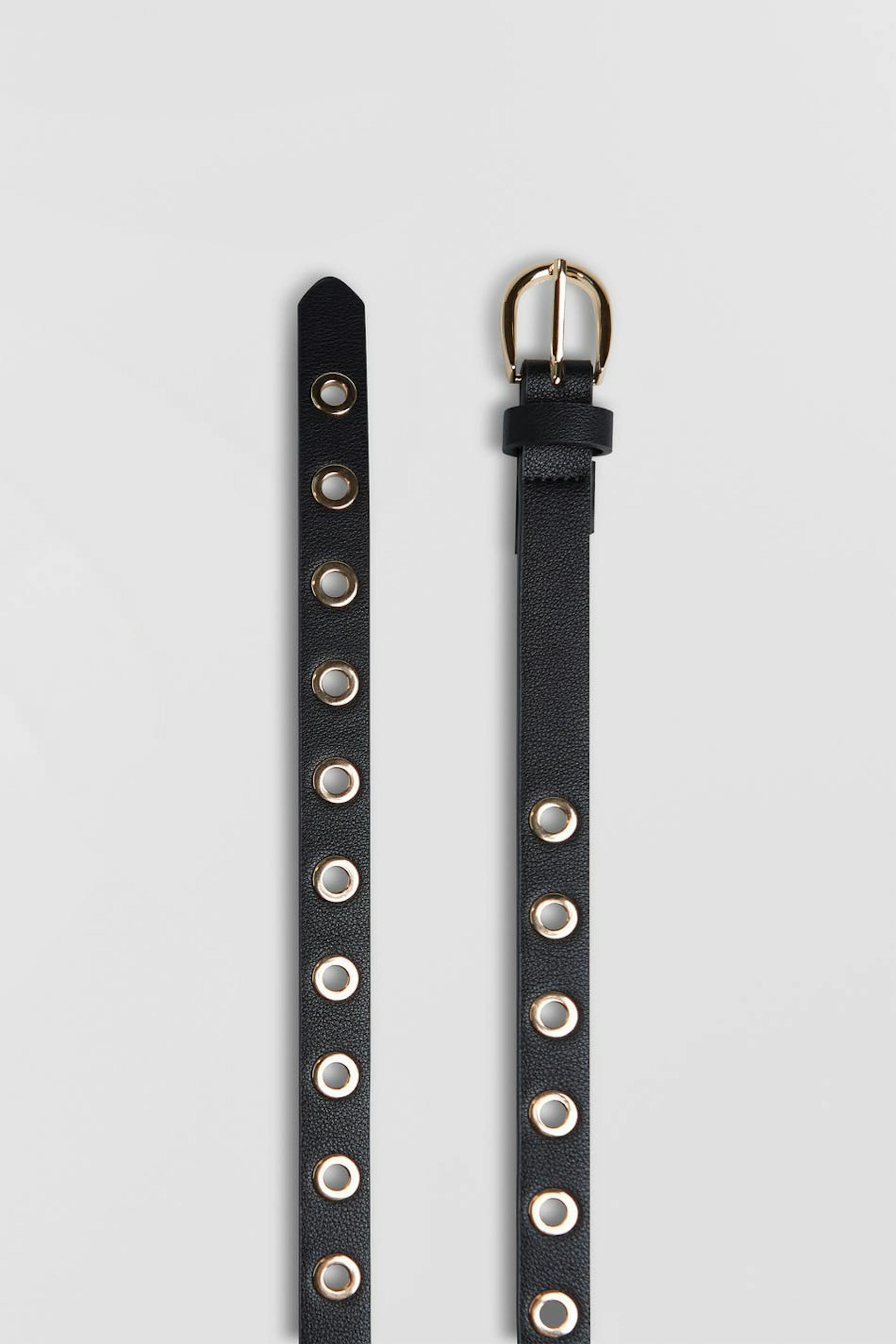 Belt with a buckle in metal. The belt is black and has gold coloured details. It is made of PU.