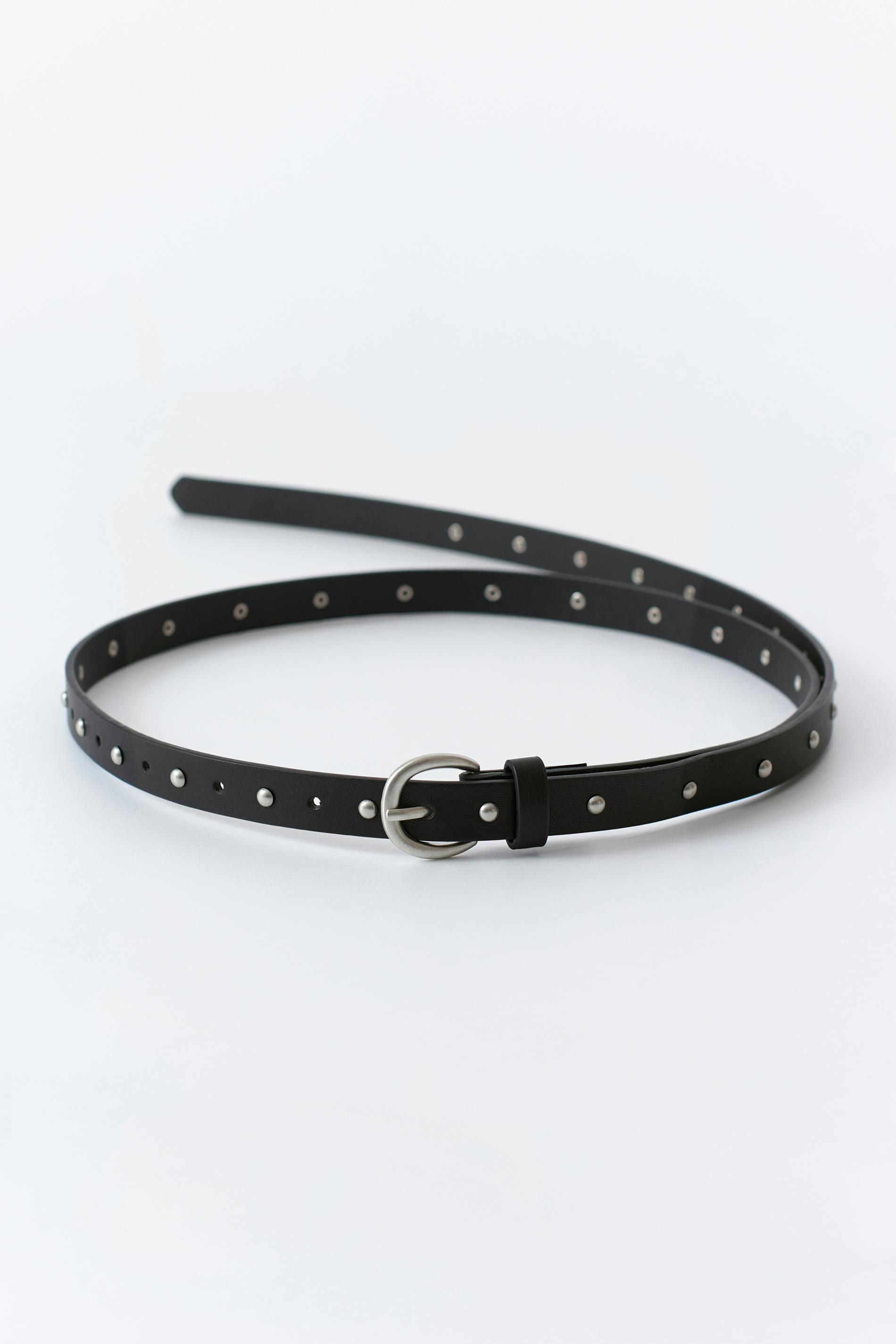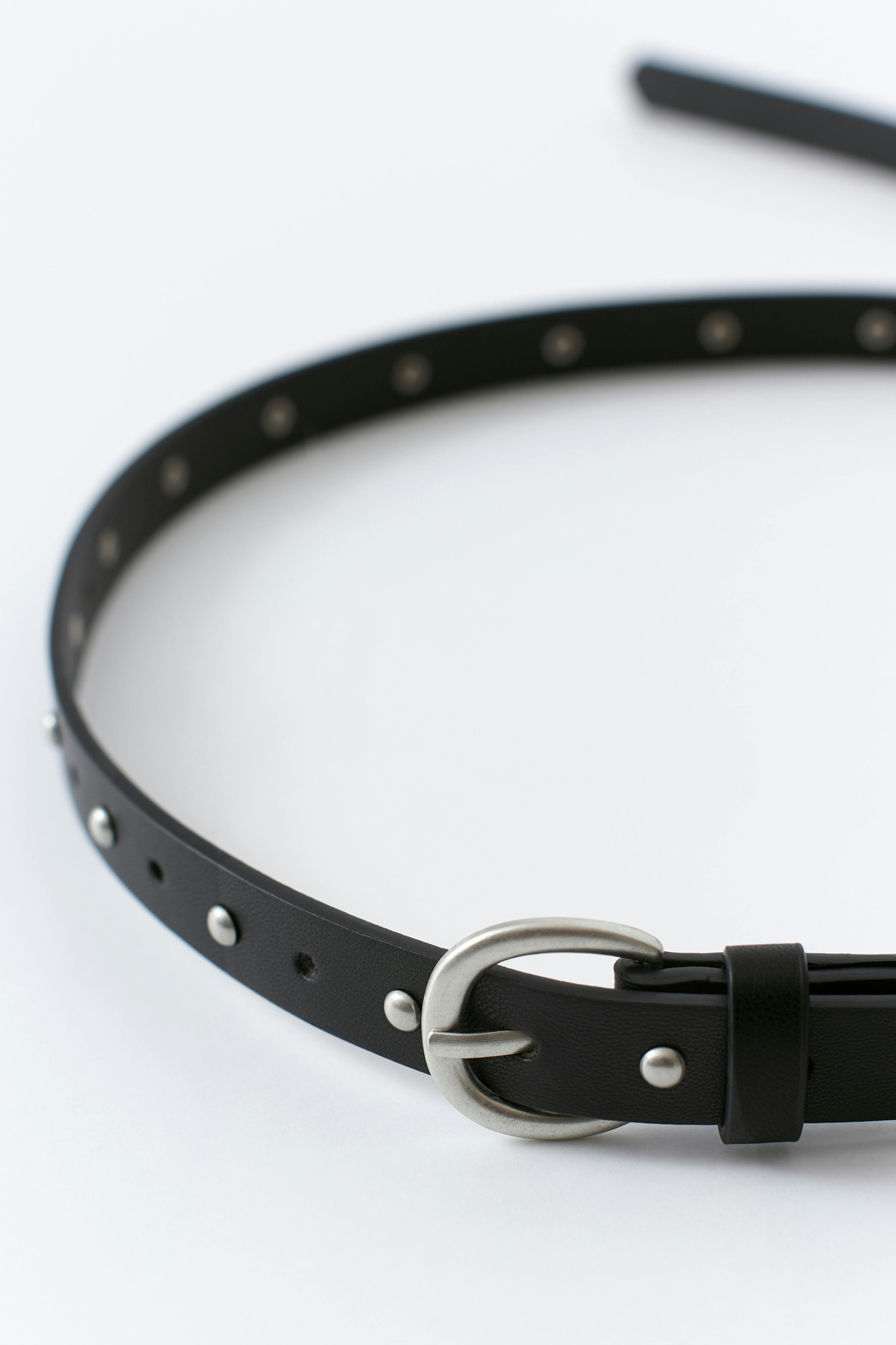 Belt with studs. The belt is silver coloured and black and has a metal buckle. It has an adjustable strap.