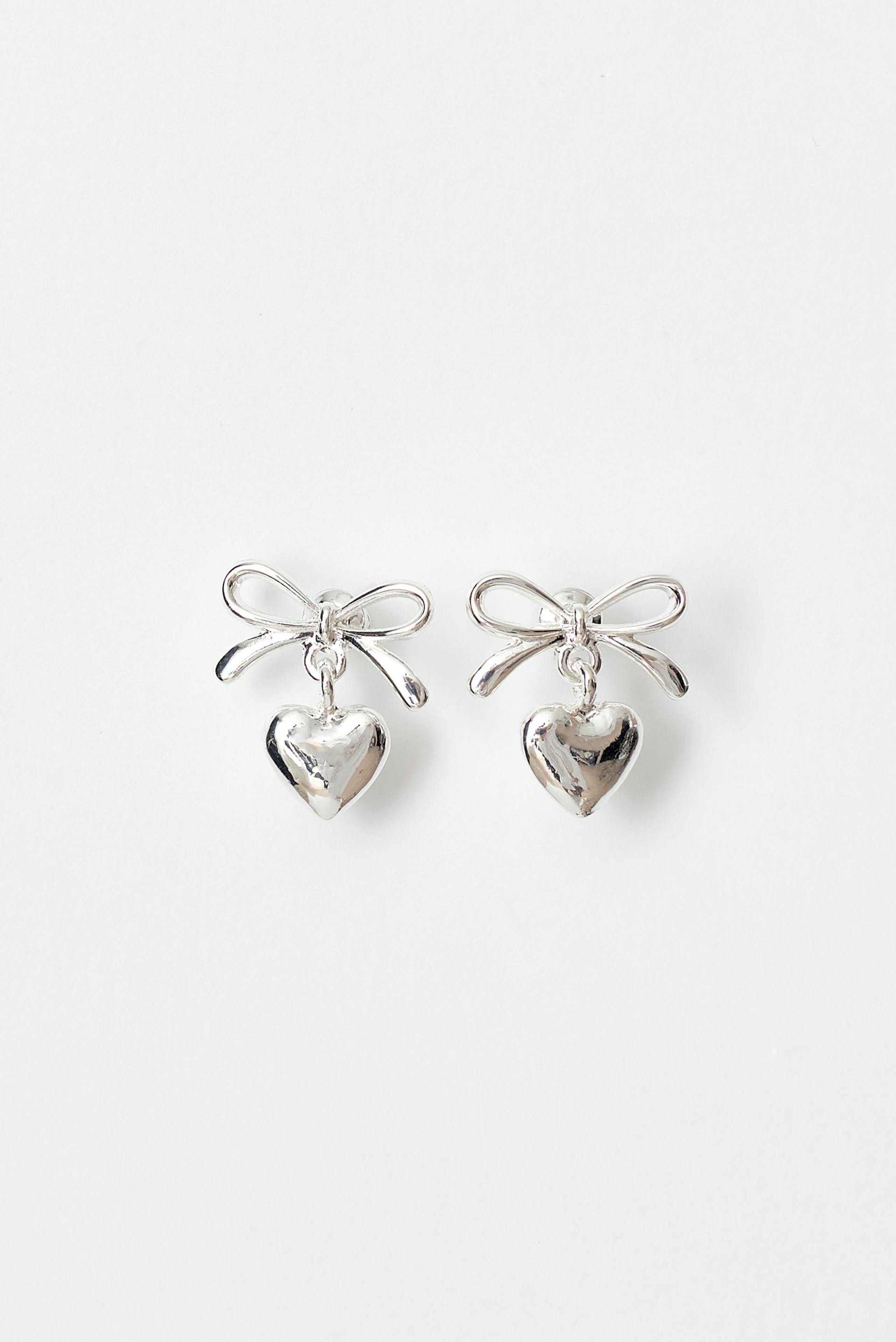 Earrings with hanging hearts with bows. The earrings are silver coloured.
